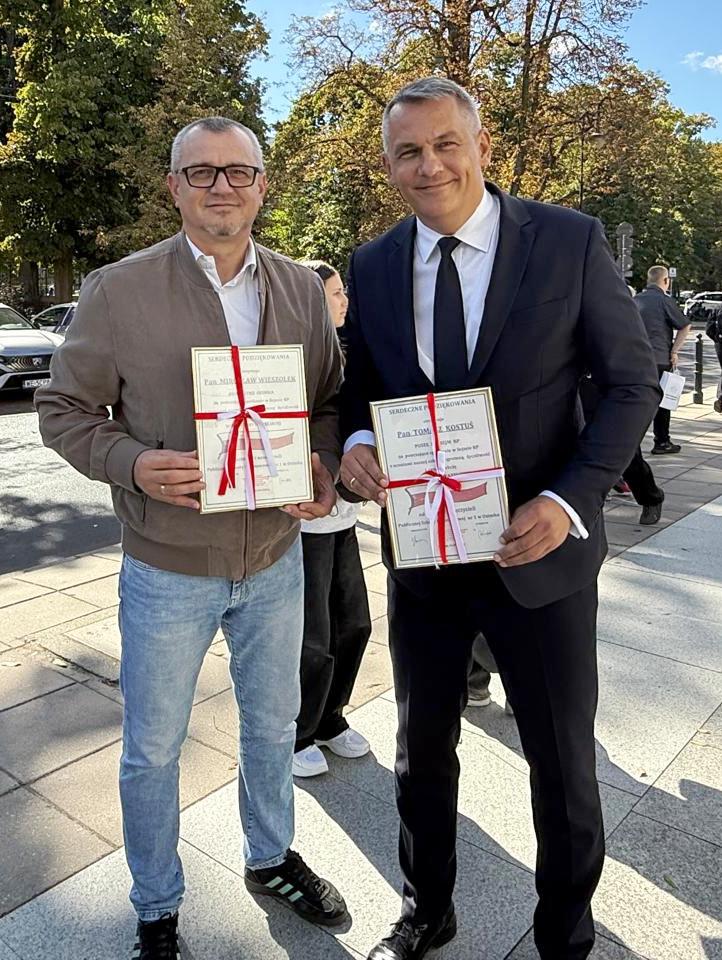 Do Sejmu RP 24 września br. pojechaliśmy na zaproszenie Posła na Sejm Tomasza Kostusia, a w tej niecodziennej wyprawie towarzyszył nam Burmistrz Ozimka Mirosław Wieszołek. Przed wejściem do budynku Sejmu zostaliśmy dokładnie sprawdzeni, a także nasze rzeczy przez wyszkolonych strażników. Historię Sejmu i parlamentaryzmu w Polsce opowiedziała nam przewodniczka, pokazując wielką makietę kompleksu Sejmu i Senatu. Nasza grupa uczniów klas siódmej i ósmej z wychowawczyniami Patrycją Kuznowicz i Violettą Oliwą miała możliwość na żywo zobaczyć otwarcie obrad 41. posiedzenia Sejmu RP X kadencji poprzez trzykrotne uderzenie laską marszałkowską przez Marszałka Sejmu. Ta laska ma znaczenie historyczne i jest symbolem godności urzędu Marszałka. Kolejnym niecodziennym momentem naszej wycieczki było powitanie uczniów z JEDYNKI włącznie z Panem Burmistrzem przez Wicemarszałka Sejmu. Byliśmy także świadkami głosowania posłów, którego wyniki błyskawicznie pokazały się na wielkich monitorach. Sala sejmowa okazała się ogromna i zrobiła na uczniach duże wrażenie. Posłowie, którzy do tej pory byli znani wyłącznie z telewizji, mijali nas na sejmowych korytarzach i z sympatią rozmawiali z nami. Nasz gospodarz, Poseł Tomasz Kostuś, opowiadał o swojej pracy, o obowiązkach poselskich, a także przekazał wiele interesujących ciekawostek. Pokazał nam też ciekawe miejsca w Sejmie, np. przepiękną bibliotekę. Zanim poszliśmy na spacer po stolicy, każdy chciał zrobić sobie z Panem Posłem pamiątkowe zdjęcie. Na zakończenie spotkania wręczyliśmy podziękowania dla Posła na Sejm RP Tomasza Kostusia oraz Burmistrza Ozimka Mirosława Wieszołka za zaproszenie nas do Sejmu RP i zorganizowanie tego wspaniałego wydarzenia, poświęcony dla uczniów JEDYNKI cenny czas między ważnymi obowiązkami oraz ciekawą lekcję wiedzy obywatelskiej i patriotyzmu.