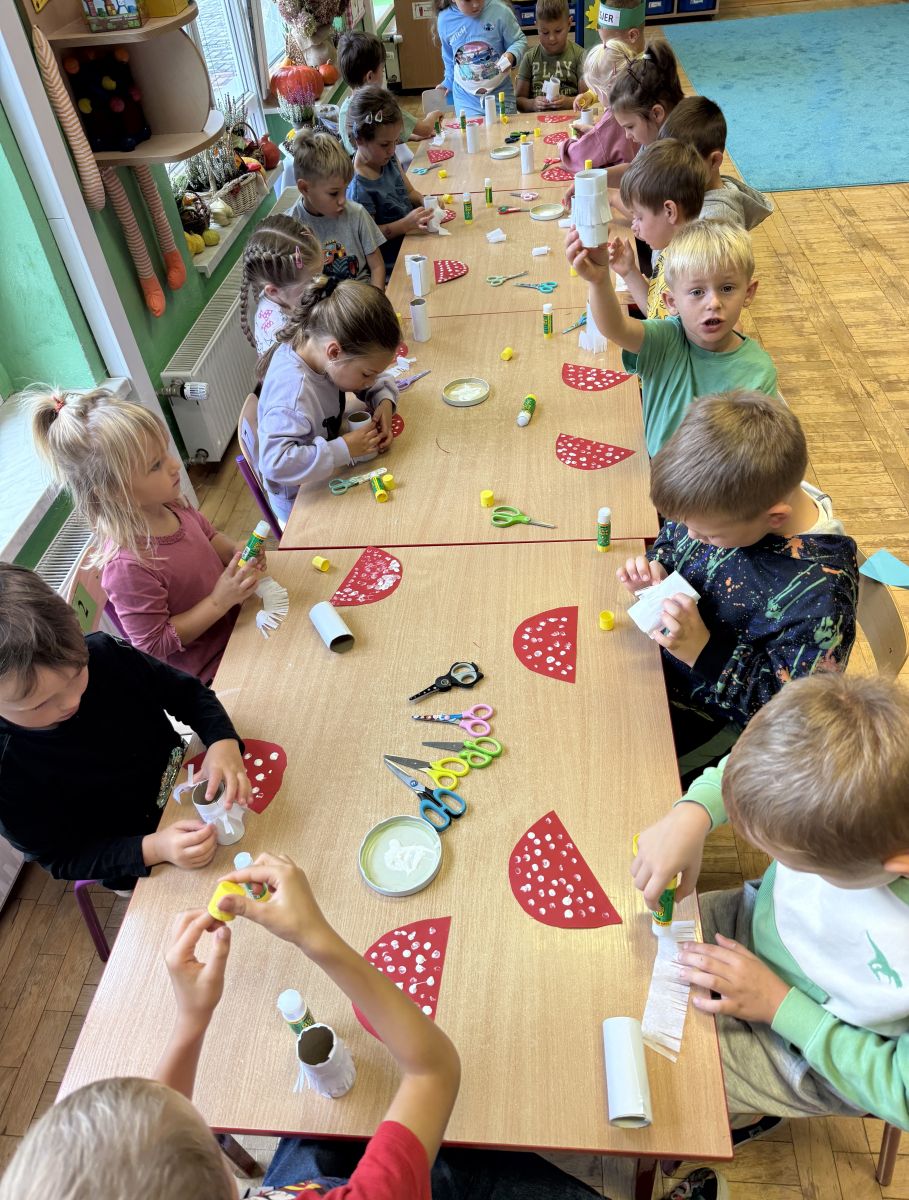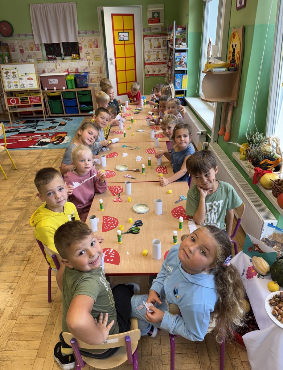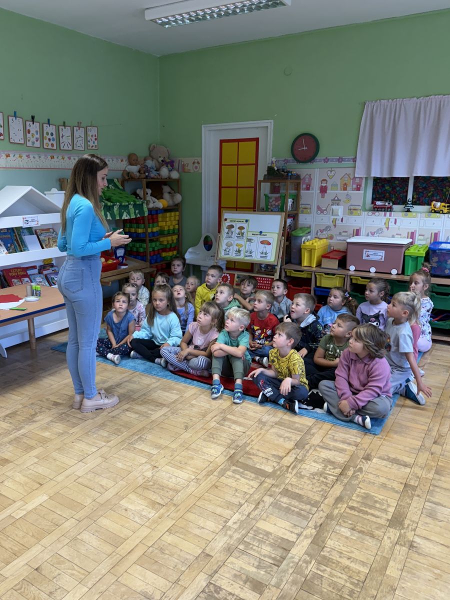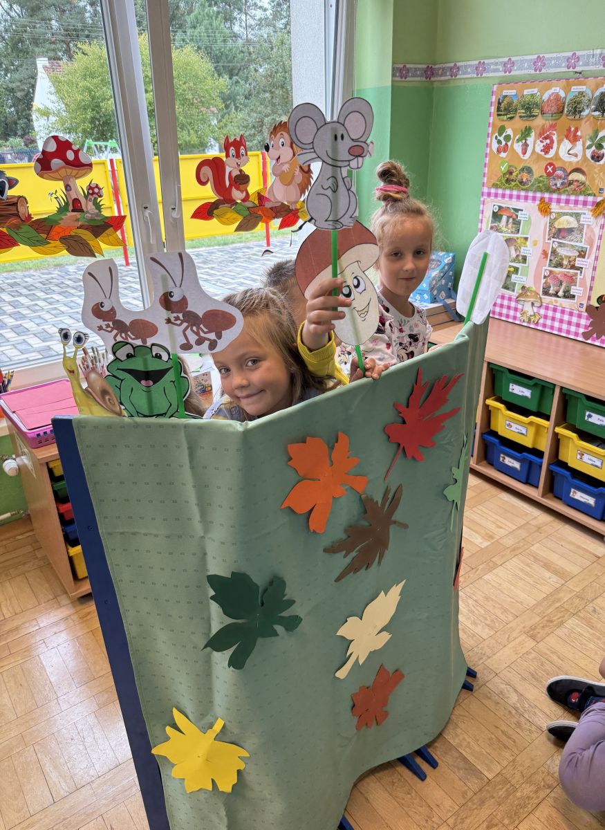 W grupie starszaków odbyło się wyjątkowe wydarzenie – teatrzyk kukiełkowy przygotowany przez panią Ewelinę i Dorotę. Już od samego początku dzieci mogły poczuć się jak prawdziwi widzowie teatru. Najpierw dowiedziały się, czym jest teatr i jak należy się w nim zachowywać. Następnie wybrano kasjera – w tej roli wystąpiło jedno z dzieci. Każdy przedszkolak otrzymał realistyczną kopię banknotu o nominale 10 zł, a następnie podchodził do kasy, by kupić bilet na przedstawienie. Podczas tej zabawy dzieci ćwiczyły także dobre maniery, używając magicznych słów: dzień dobry, poproszę, dziękuję. Bilety miały numery i kolory, które wskazywały miejsca na widowni. Kasjer sprawdzał, czy każdy usiadł na odpowiednim krzesełku. Po usłyszeniu dzwoneczka na scenie pojawił się grzybek, a chwilę później zwierzątka: jeżyk, myszka, ślimak, mrówki i żabka. Spektakl opowiadał o przyjaźni, współpracy i szacunku dla innych. Dzieci z ogromnym zainteresowaniem śledziły losy bohaterów i uważnie słuchały ich rozmów. Po występie chętnie przystąpiły do rozmowy na temat tego, czego nauczyła je bajka i jak ważne są dobre relacje w codziennym życiu. Po teatrzyku przedszkolaki uczestniczyły w dodatkowych zajęciach edukacyjnych. Przy tablicach demonstracyjnych poznały ciekawostki o grzybach – dowiedziały się, kiedy i w jaki sposób można je zbierać, jak należy się ubierać na wyprawę do lasu oraz dlaczego nigdy nie wolno chodzić tam samemu. Dzieci zapoznały się również z wybranymi gatunkami grzybów jadalnych i trujących. Na zakończenie nie zabrakło radosnej zabawy – przedszkolaki tańczyły do wesołej piosenki o muchomorku, a następnie wykonały pracę plastyczną – muchomorka z rolki po papierze toaletowym. Wielką atrakcją było także to, że po zajęciach mogły same pobawić się w teatr, odgrywając własne role.
