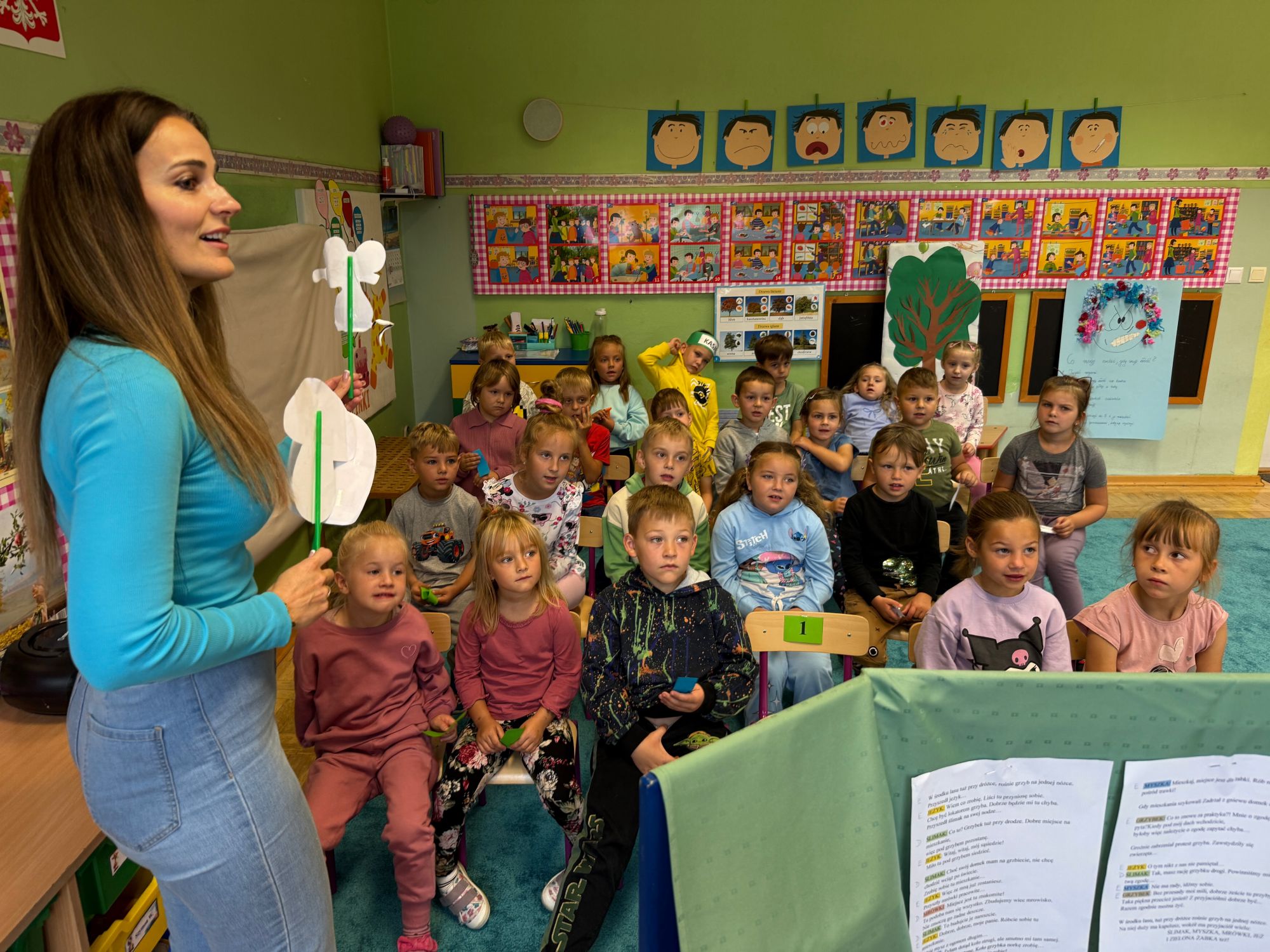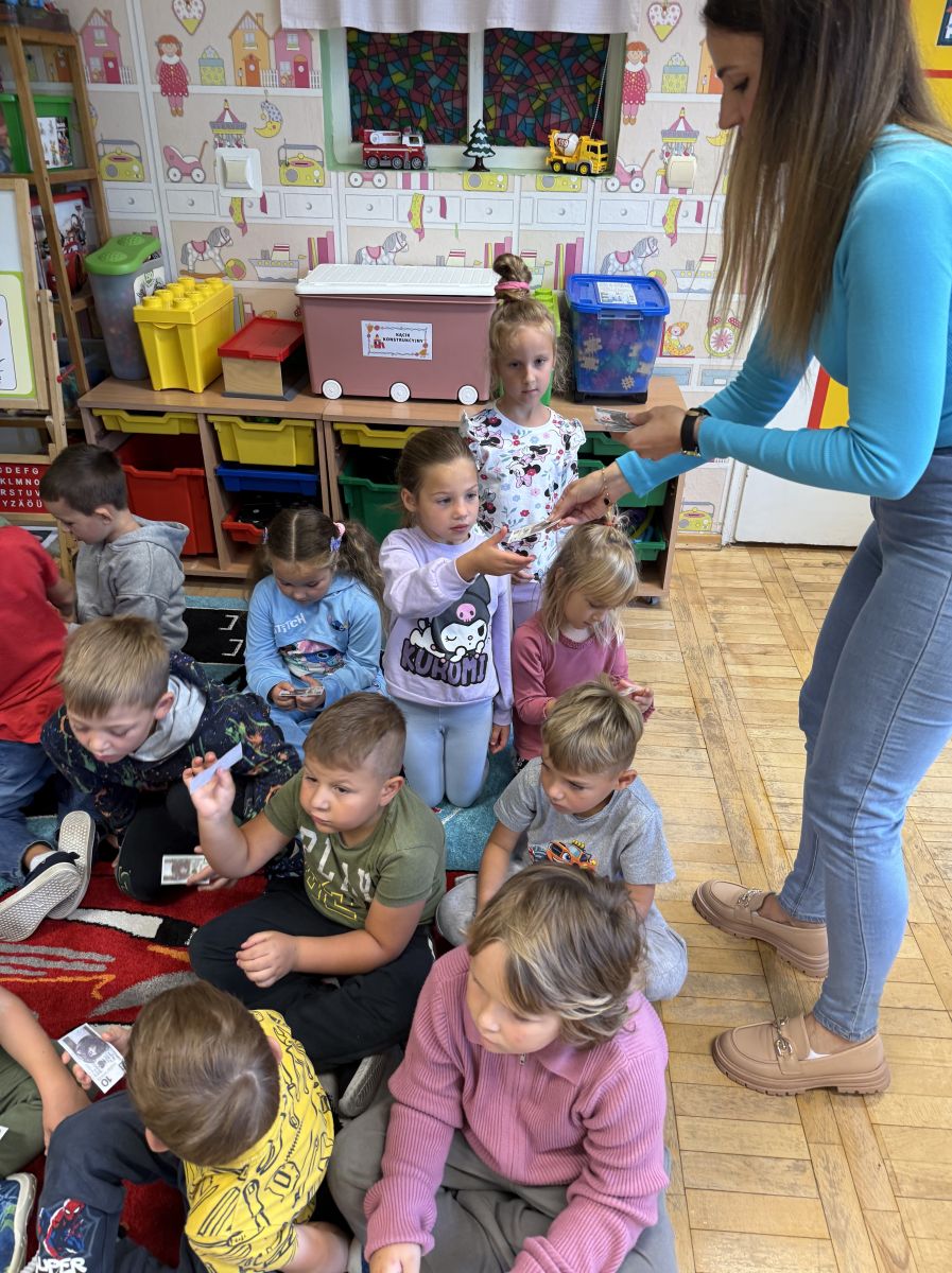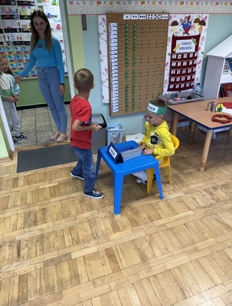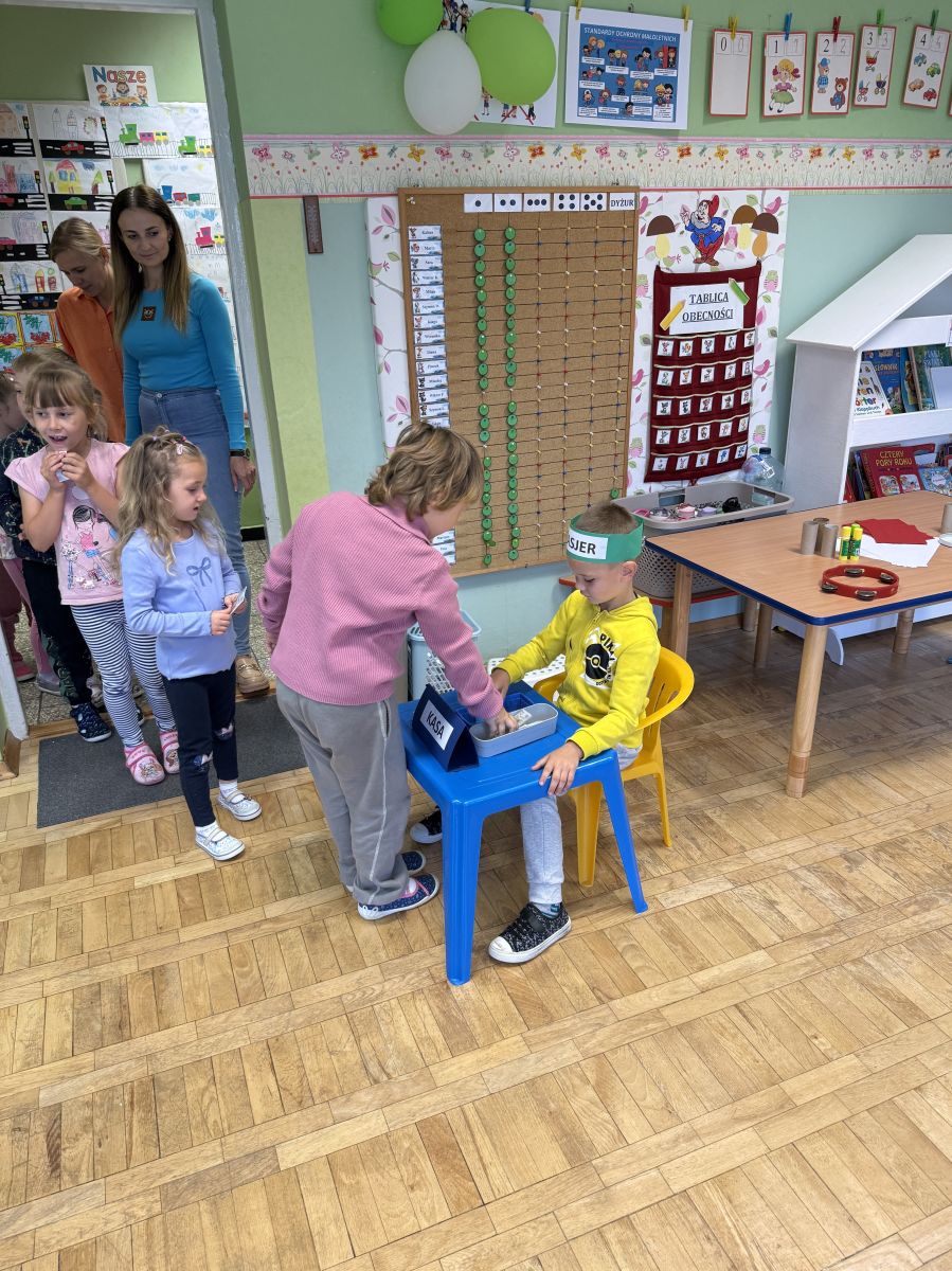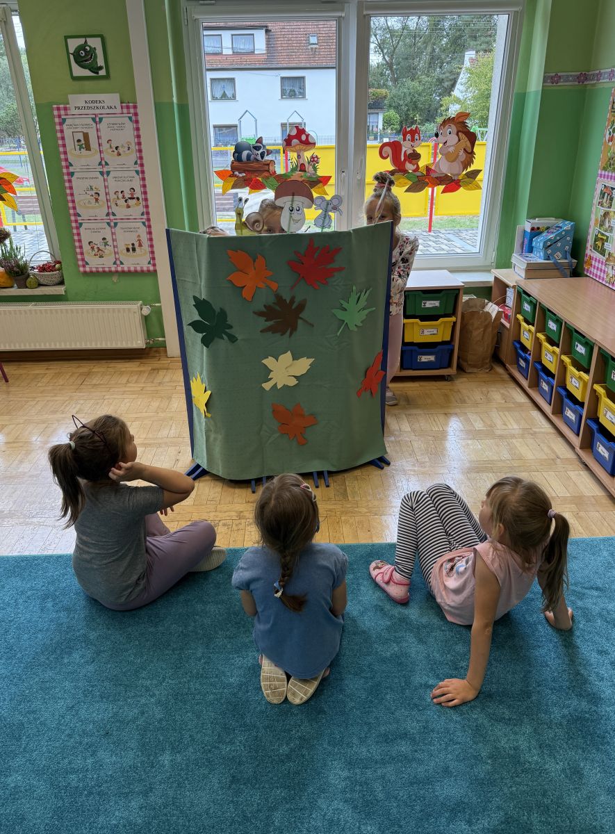 W grupie starszaków odbyło się wyjątkowe wydarzenie – teatrzyk kukiełkowy przygotowany przez panią Ewelinę i Dorotę. Już od samego początku dzieci mogły poczuć się jak prawdziwi widzowie teatru. Najpierw dowiedziały się, czym jest teatr i jak należy się w nim zachowywać. Następnie wybrano kasjera – w tej roli wystąpiło jedno z dzieci. Każdy przedszkolak otrzymał realistyczną kopię banknotu o nominale 10 zł, a następnie podchodził do kasy, by kupić bilet na przedstawienie. Podczas tej zabawy dzieci ćwiczyły także dobre maniery, używając magicznych słów: dzień dobry, poproszę, dziękuję. Bilety miały numery i kolory, które wskazywały miejsca na widowni. Kasjer sprawdzał, czy każdy usiadł na odpowiednim krzesełku. Po usłyszeniu dzwoneczka na scenie pojawił się grzybek, a chwilę później zwierzątka: jeżyk, myszka, ślimak, mrówki i żabka. Spektakl opowiadał o przyjaźni, współpracy i szacunku dla innych. Dzieci z ogromnym zainteresowaniem śledziły losy bohaterów i uważnie słuchały ich rozmów. Po występie chętnie przystąpiły do rozmowy na temat tego, czego nauczyła je bajka i jak ważne są dobre relacje w codziennym życiu. Po teatrzyku przedszkolaki uczestniczyły w dodatkowych zajęciach edukacyjnych. Przy tablicach demonstracyjnych poznały ciekawostki o grzybach – dowiedziały się, kiedy i w jaki sposób można je zbierać, jak należy się ubierać na wyprawę do lasu oraz dlaczego nigdy nie wolno chodzić tam samemu. Dzieci zapoznały się również z wybranymi gatunkami grzybów jadalnych i trujących. Na zakończenie nie zabrakło radosnej zabawy – przedszkolaki tańczyły do wesołej piosenki o muchomorku, a następnie wykonały pracę plastyczną – muchomorka z rolki po papierze toaletowym. Wielką atrakcją było także to, że po zajęciach mogły same pobawić się w teatr, odgrywając własne role.