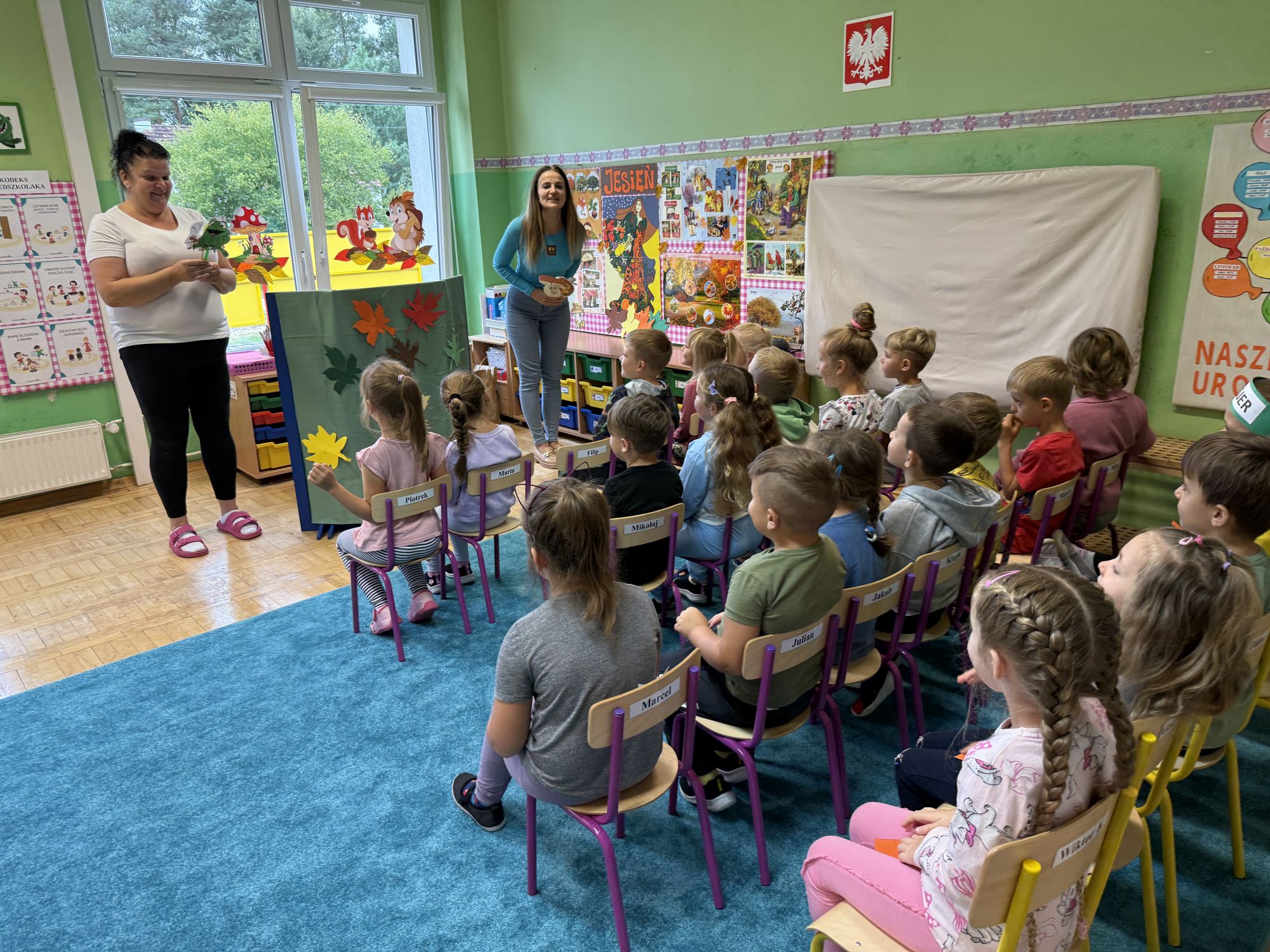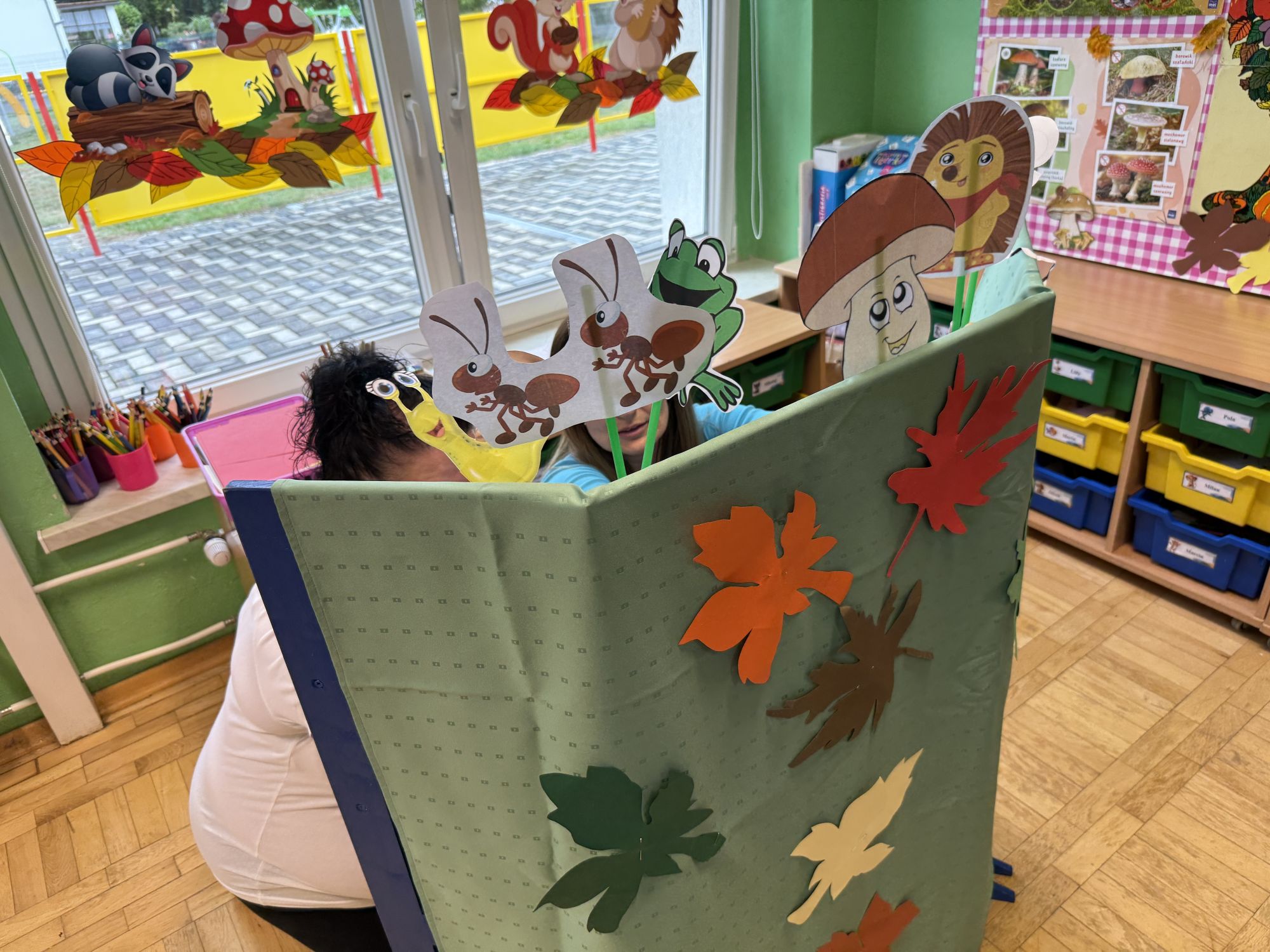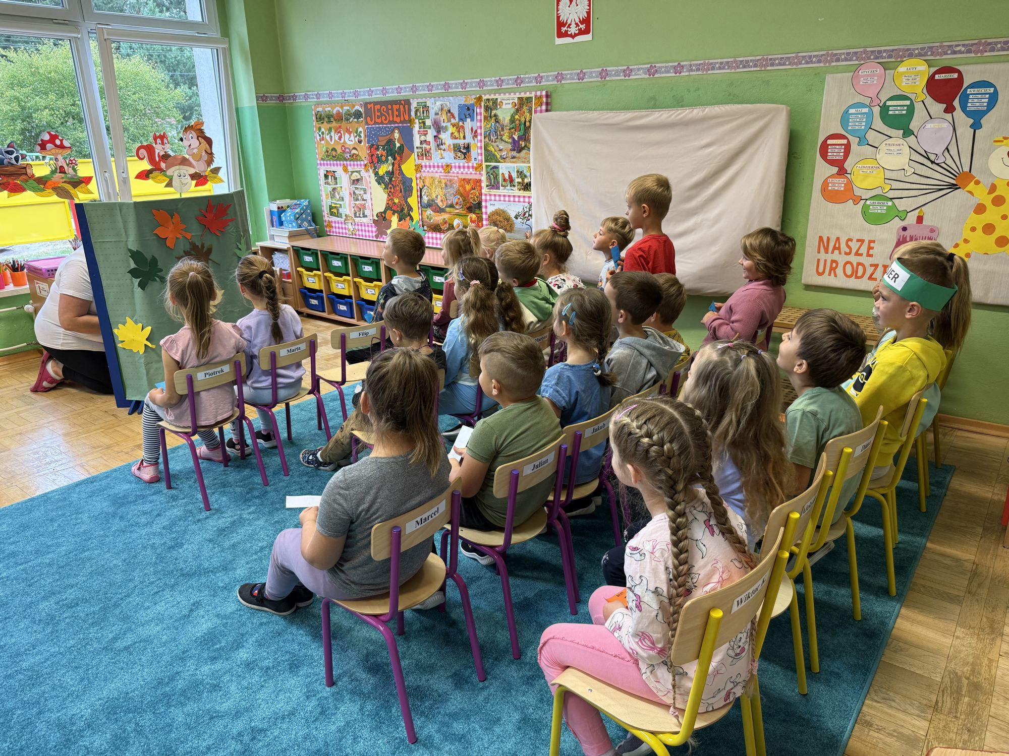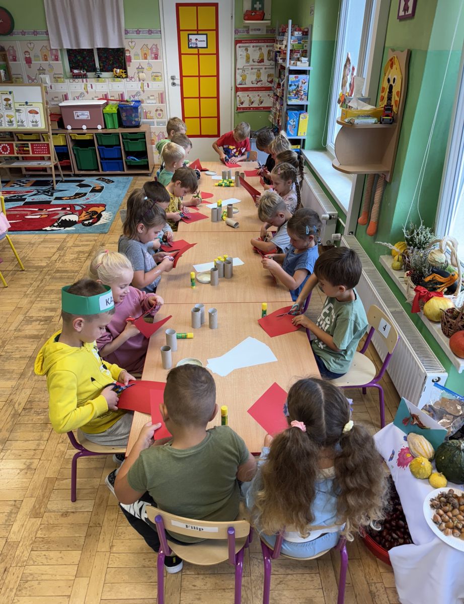 W grupie starszaków odbyło się wyjątkowe wydarzenie – teatrzyk kukiełkowy przygotowany przez panią Ewelinę i Dorotę. Już od samego początku dzieci mogły poczuć się jak prawdziwi widzowie teatru. Najpierw dowiedziały się, czym jest teatr i jak należy się w nim zachowywać. Następnie wybrano kasjera – w tej roli wystąpiło jedno z dzieci. Każdy przedszkolak otrzymał realistyczną kopię banknotu o nominale 10 zł, a następnie podchodził do kasy, by kupić bilet na przedstawienie. Podczas tej zabawy dzieci ćwiczyły także dobre maniery, używając magicznych słów: dzień dobry, poproszę, dziękuję. Bilety miały numery i kolory, które wskazywały miejsca na widowni. Kasjer sprawdzał, czy każdy usiadł na odpowiednim krzesełku. Po usłyszeniu dzwoneczka na scenie pojawił się grzybek, a chwilę później zwierzątka: jeżyk, myszka, ślimak, mrówki i żabka. Spektakl opowiadał o przyjaźni, współpracy i szacunku dla innych. Dzieci z ogromnym zainteresowaniem śledziły losy bohaterów i uważnie słuchały ich rozmów. Po występie chętnie przystąpiły do rozmowy na temat tego, czego nauczyła je bajka i jak ważne są dobre relacje w codziennym życiu. Po teatrzyku przedszkolaki uczestniczyły w dodatkowych zajęciach edukacyjnych. Przy tablicach demonstracyjnych poznały ciekawostki o grzybach – dowiedziały się, kiedy i w jaki sposób można je zbierać, jak należy się ubierać na wyprawę do lasu oraz dlaczego nigdy nie wolno chodzić tam samemu. Dzieci zapoznały się również z wybranymi gatunkami grzybów jadalnych i trujących. Na zakończenie nie zabrakło radosnej zabawy – przedszkolaki tańczyły do wesołej piosenki o muchomorku, a następnie wykonały pracę plastyczną – muchomorka z rolki po papierze toaletowym. Wielką atrakcją było także to, że po zajęciach mogły same pobawić się w teatr, odgrywając własne role.