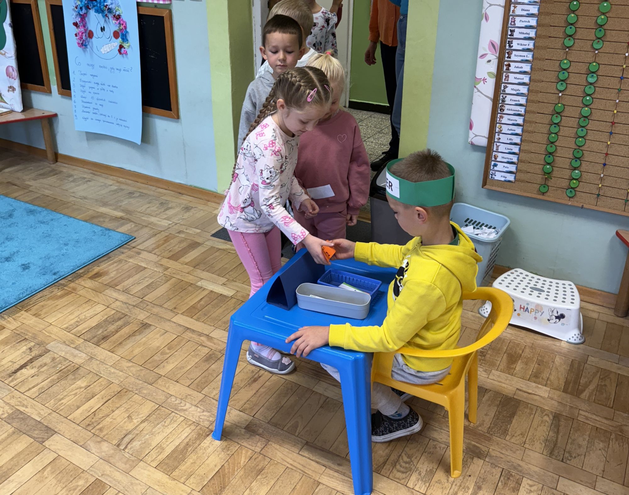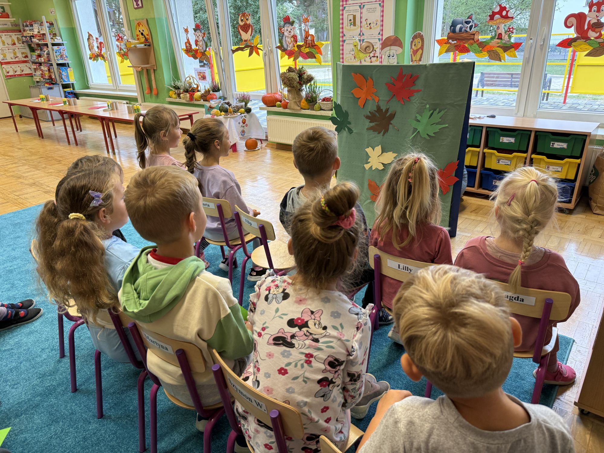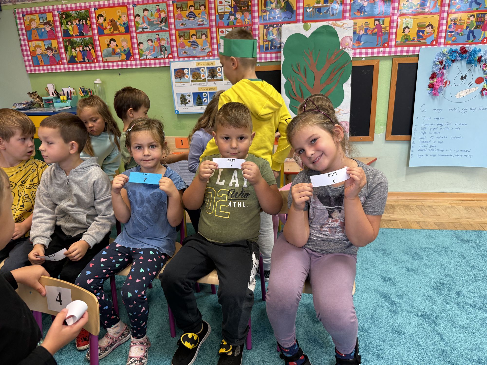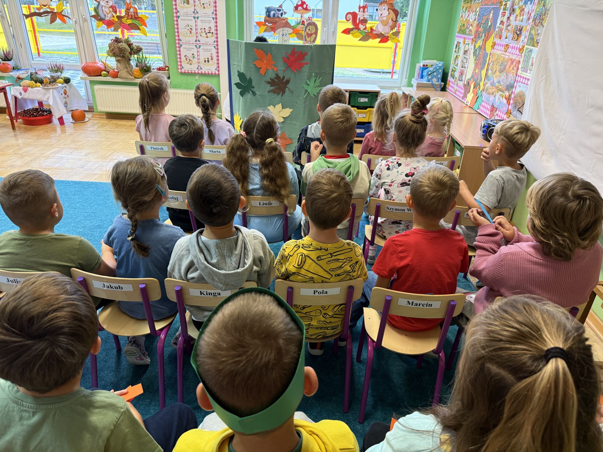 W grupie starszaków odbyło się wyjątkowe wydarzenie – teatrzyk kukiełkowy przygotowany przez panią Ewelinę i Dorotę. Już od samego początku dzieci mogły poczuć się jak prawdziwi widzowie teatru. Najpierw dowiedziały się, czym jest teatr i jak należy się w nim zachowywać. Następnie wybrano kasjera – w tej roli wystąpiło jedno z dzieci. Każdy przedszkolak otrzymał realistyczną kopię banknotu o nominale 10 zł, a następnie podchodził do kasy, by kupić bilet na przedstawienie. Podczas tej zabawy dzieci ćwiczyły także dobre maniery, używając magicznych słów: dzień dobry, poproszę, dziękuję. Bilety miały numery i kolory, które wskazywały miejsca na widowni. Kasjer sprawdzał, czy każdy usiadł na odpowiednim krzesełku. Po usłyszeniu dzwoneczka na scenie pojawił się grzybek, a chwilę później zwierzątka: jeżyk, myszka, ślimak, mrówki i żabka. Spektakl opowiadał o przyjaźni, współpracy i szacunku dla innych. Dzieci z ogromnym zainteresowaniem śledziły losy bohaterów i uważnie słuchały ich rozmów. Po występie chętnie przystąpiły do rozmowy na temat tego, czego nauczyła je bajka i jak ważne są dobre relacje w codziennym życiu. Po teatrzyku przedszkolaki uczestniczyły w dodatkowych zajęciach edukacyjnych. Przy tablicach demonstracyjnych poznały ciekawostki o grzybach – dowiedziały się, kiedy i w jaki sposób można je zbierać, jak należy się ubierać na wyprawę do lasu oraz dlaczego nigdy nie wolno chodzić tam samemu. Dzieci zapoznały się również z wybranymi gatunkami grzybów jadalnych i trujących. Na zakończenie nie zabrakło radosnej zabawy – przedszkolaki tańczyły do wesołej piosenki o muchomorku, a następnie wykonały pracę plastyczną – muchomorka z rolki po papierze toaletowym. Wielką atrakcją było także to, że po zajęciach mogły same pobawić się w teatr, odgrywając własne role.