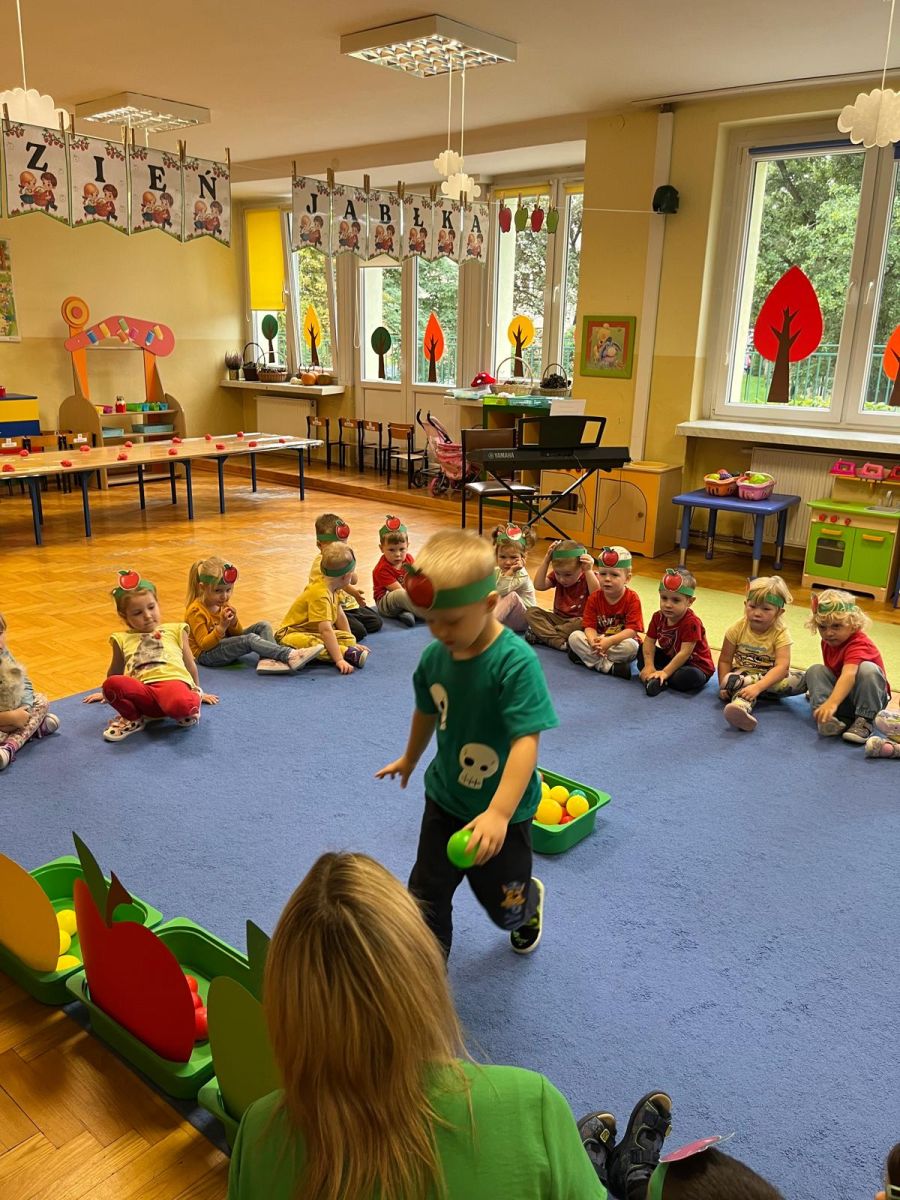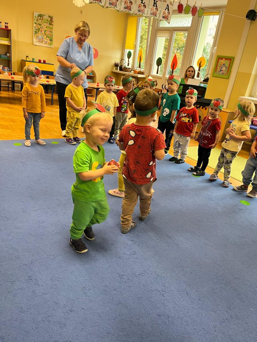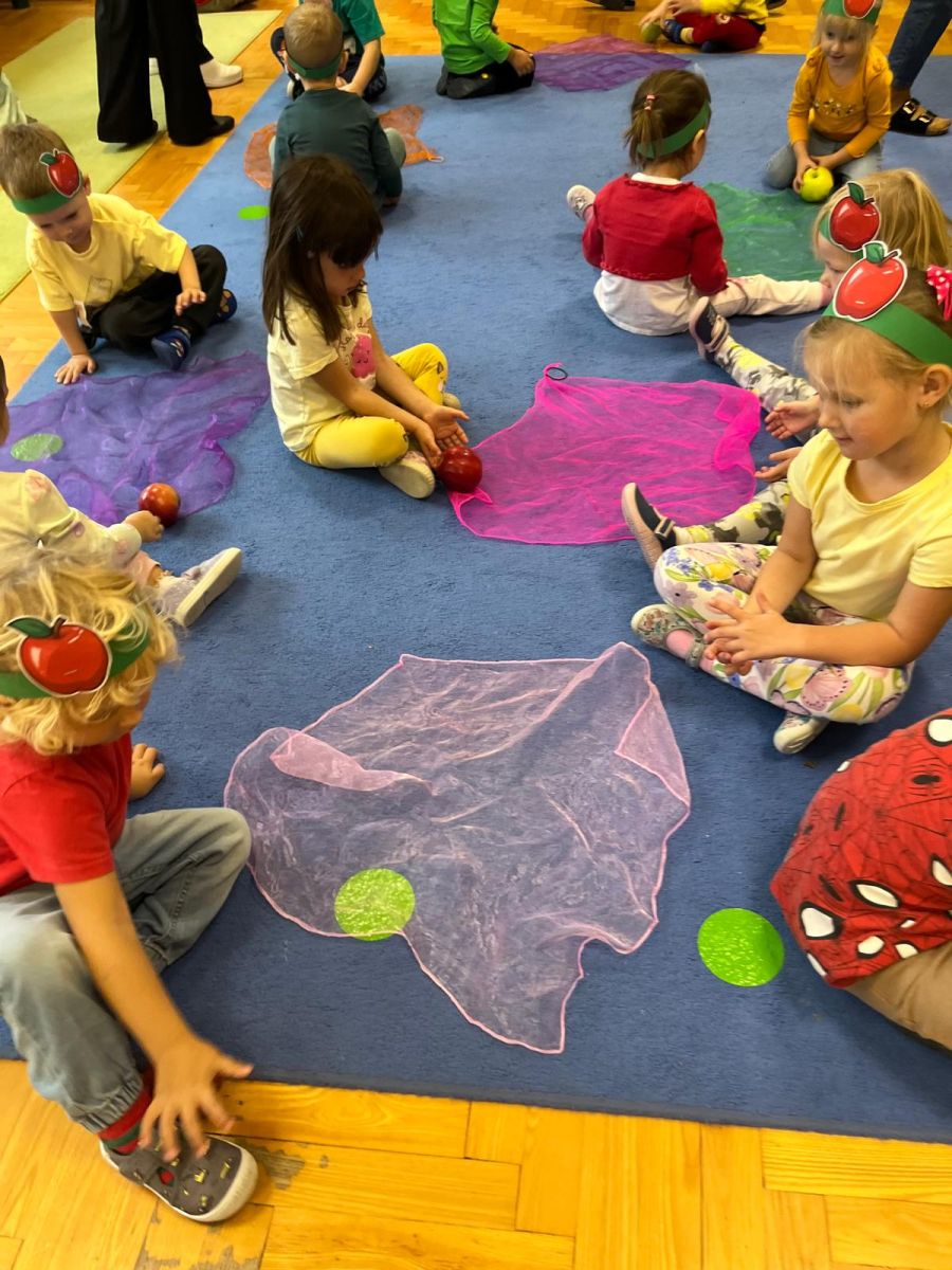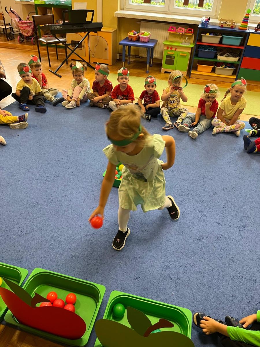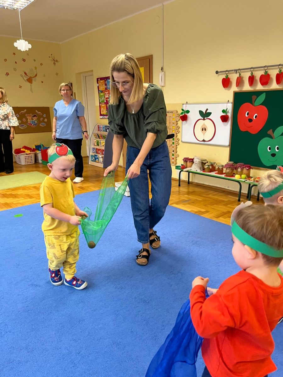 Uśmiechów dostarczyła również zabawa z jabłkiem przy melodii „Mam chusteczkę haftowaną”, która połączyła element muzyki, ruchu i wspólnej zabawy.