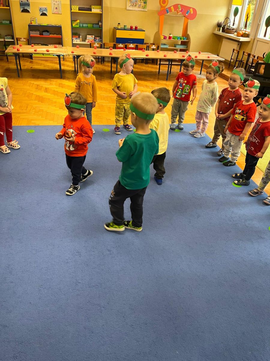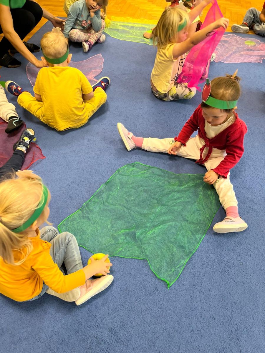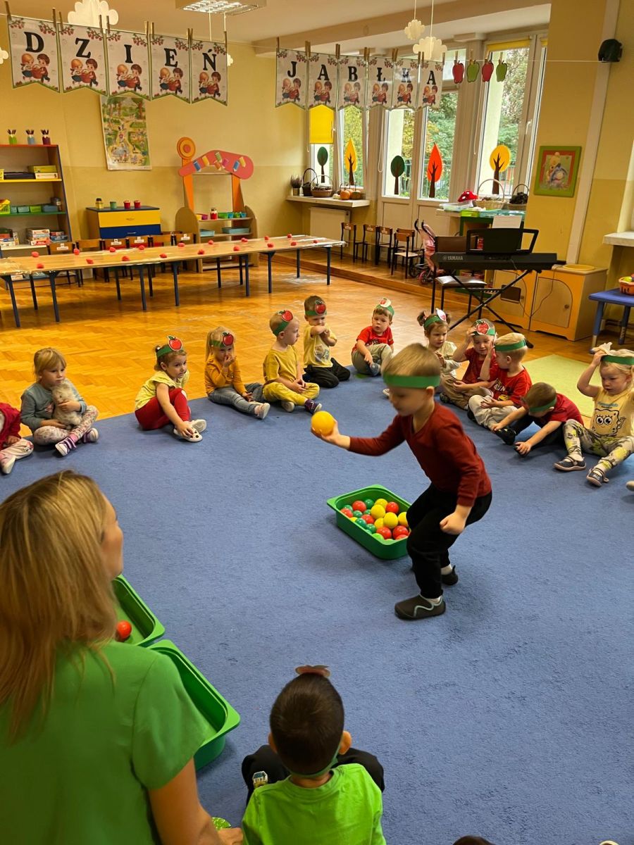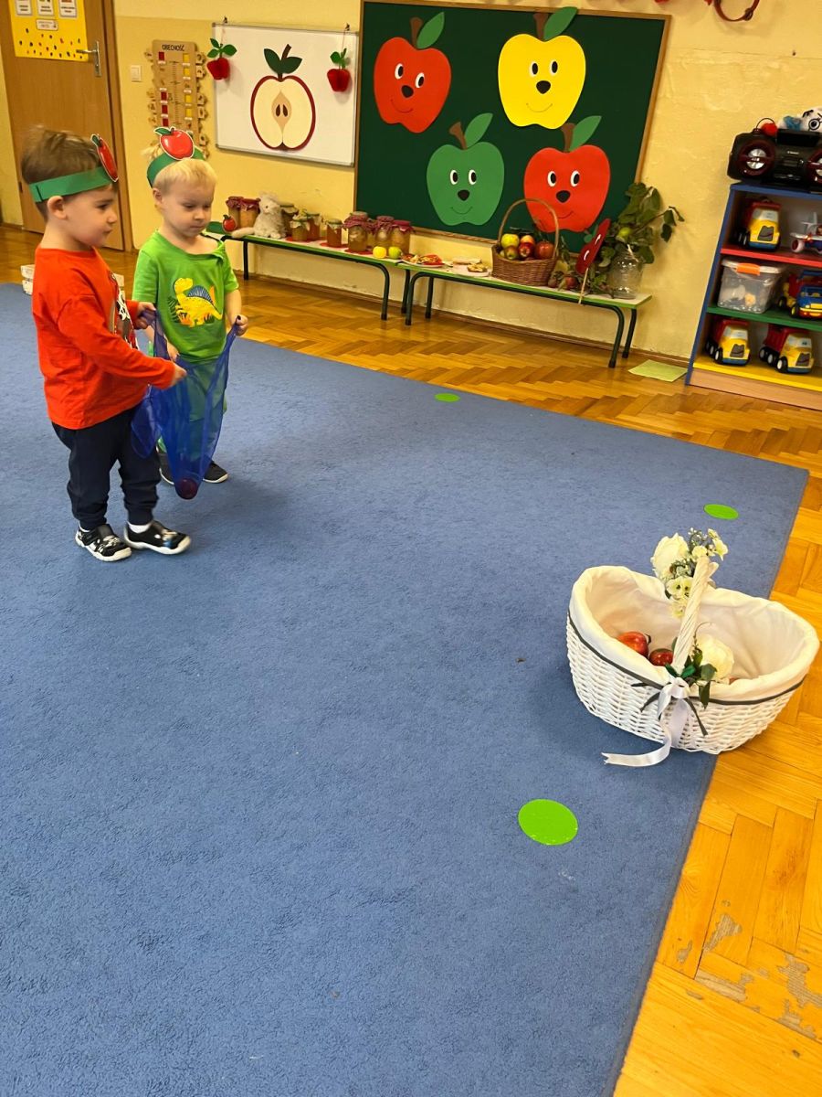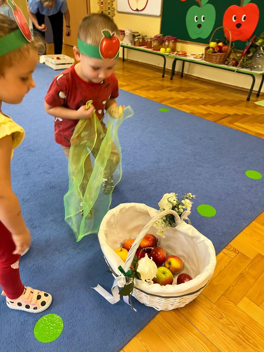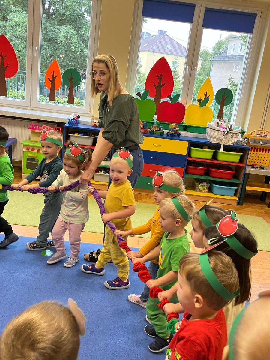 Uśmiechów dostarczyła również zabawa z jabłkiem przy melodii „Mam chusteczkę haftowaną”, która połączyła element muzyki, ruchu i wspólnej zabawy.