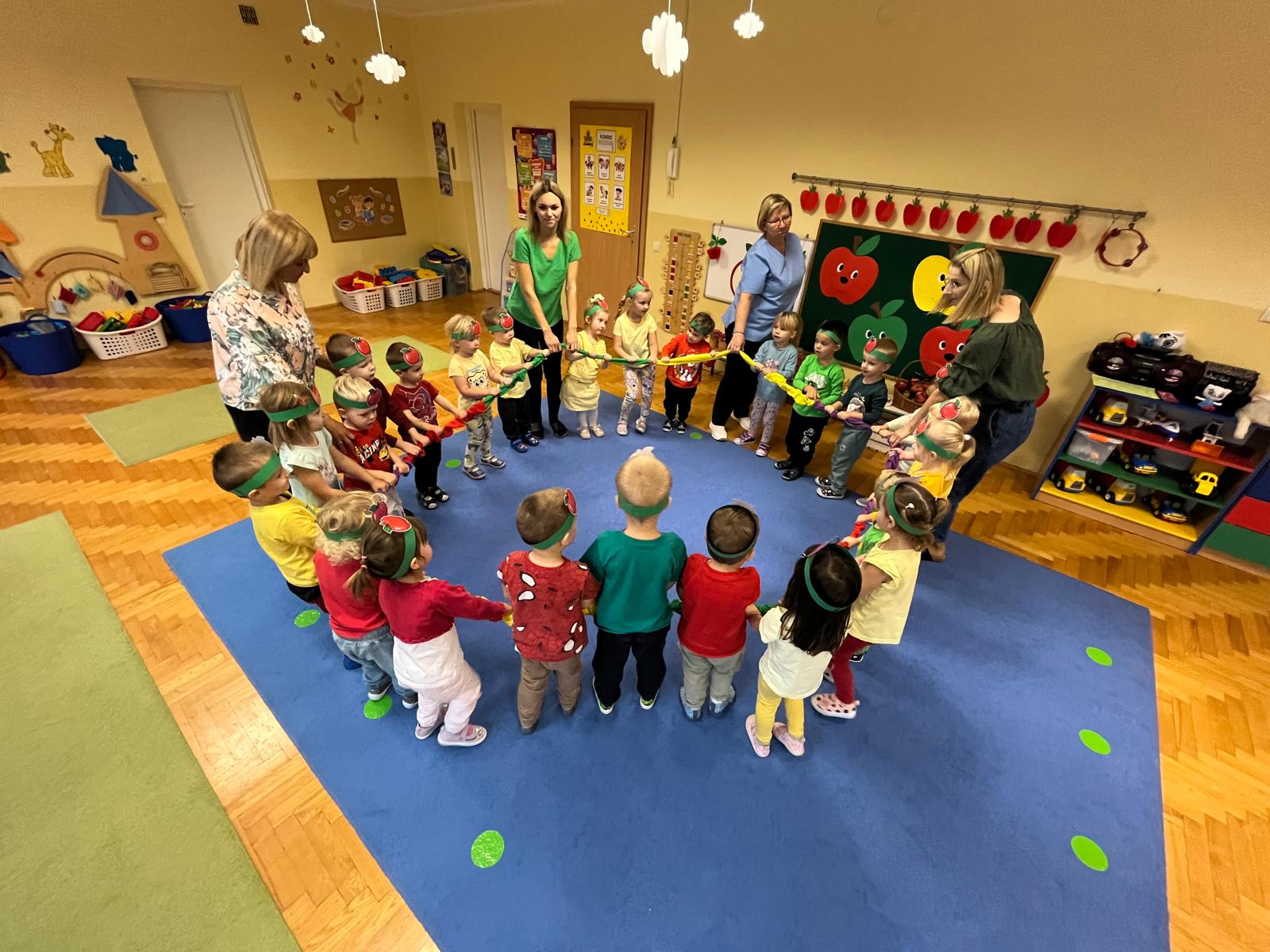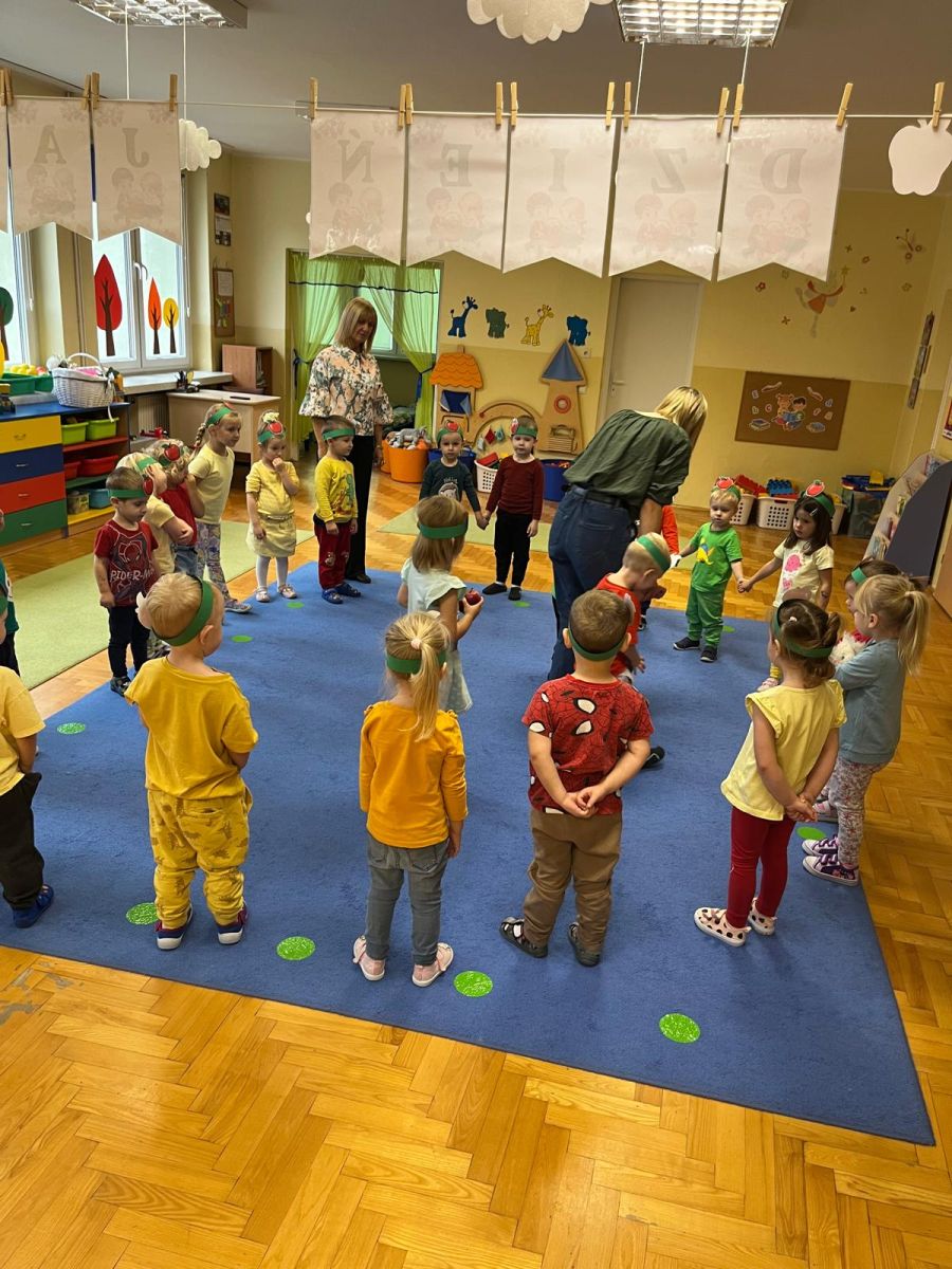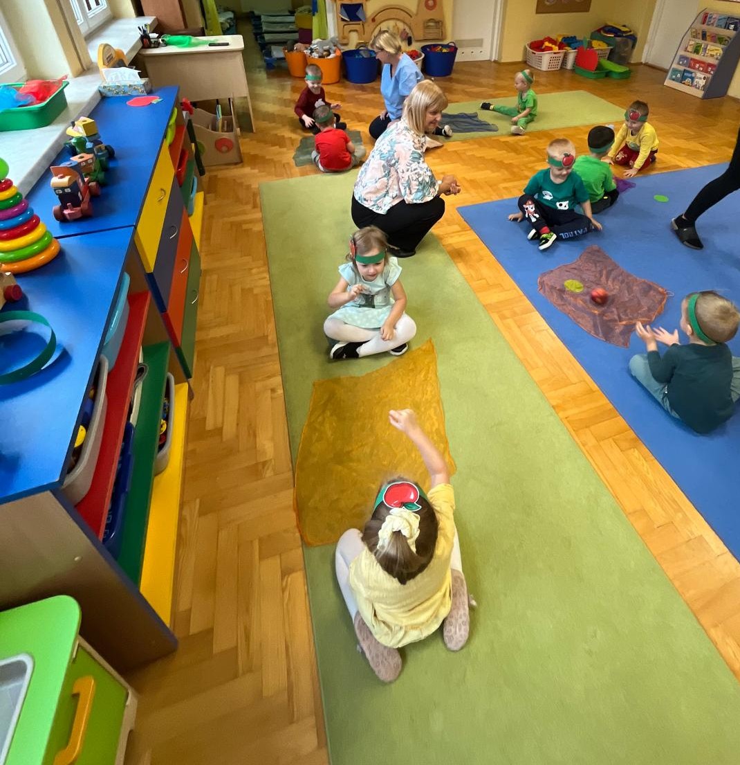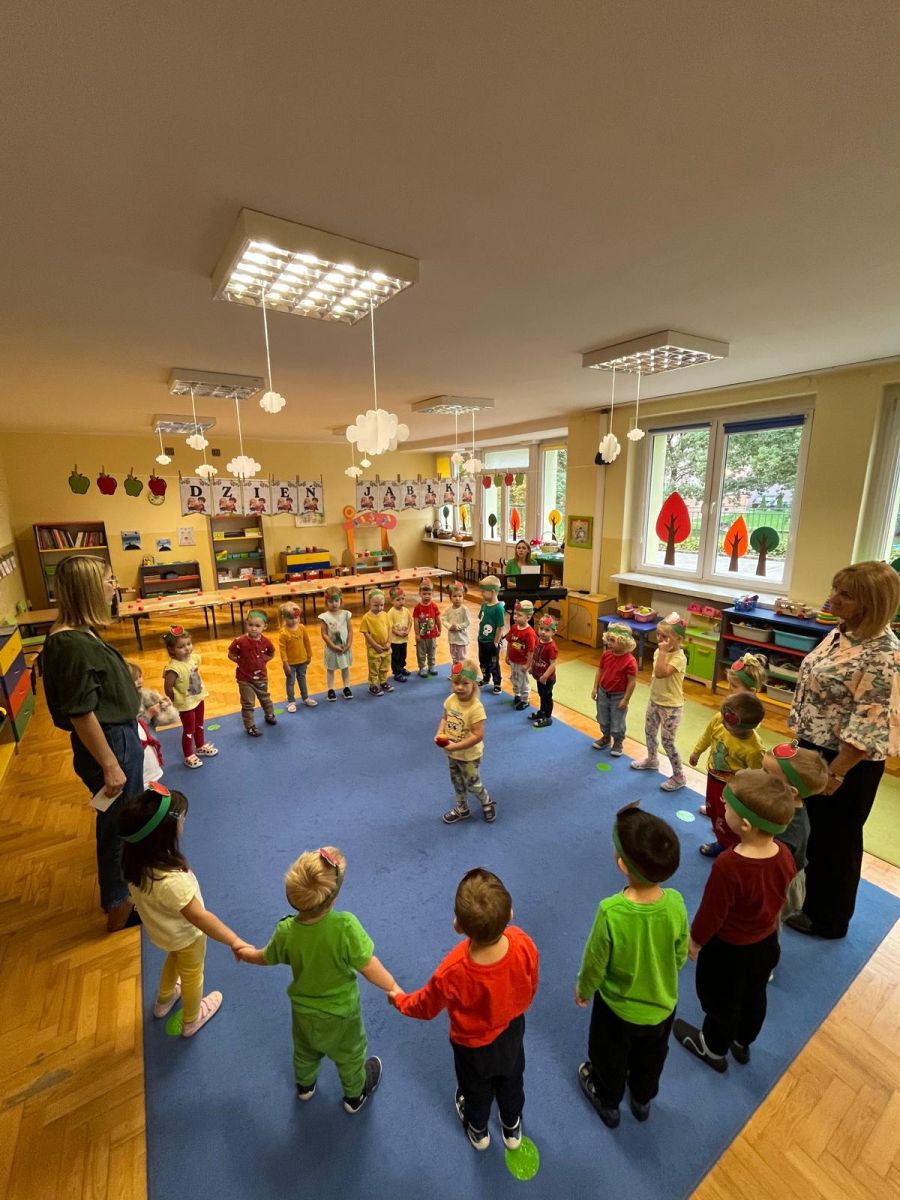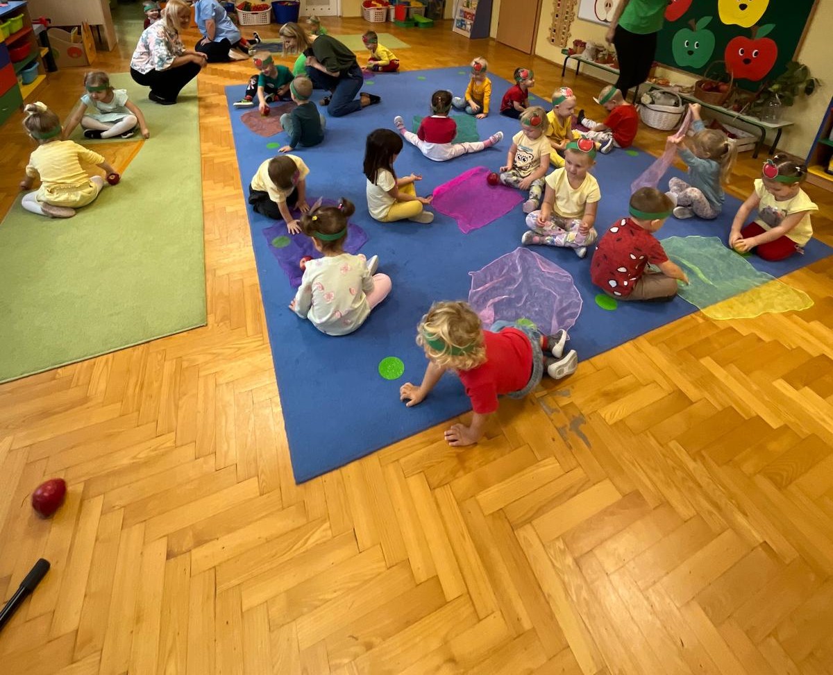 Uśmiechów dostarczyła również zabawa z jabłkiem przy melodii „Mam chusteczkę haftowaną”, która połączyła element muzyki, ruchu i wspólnej zabawy.