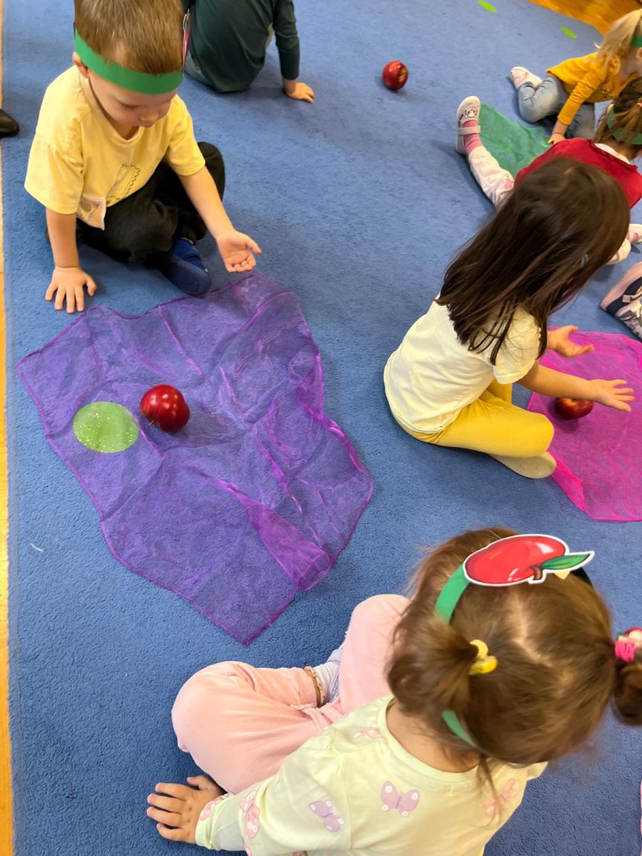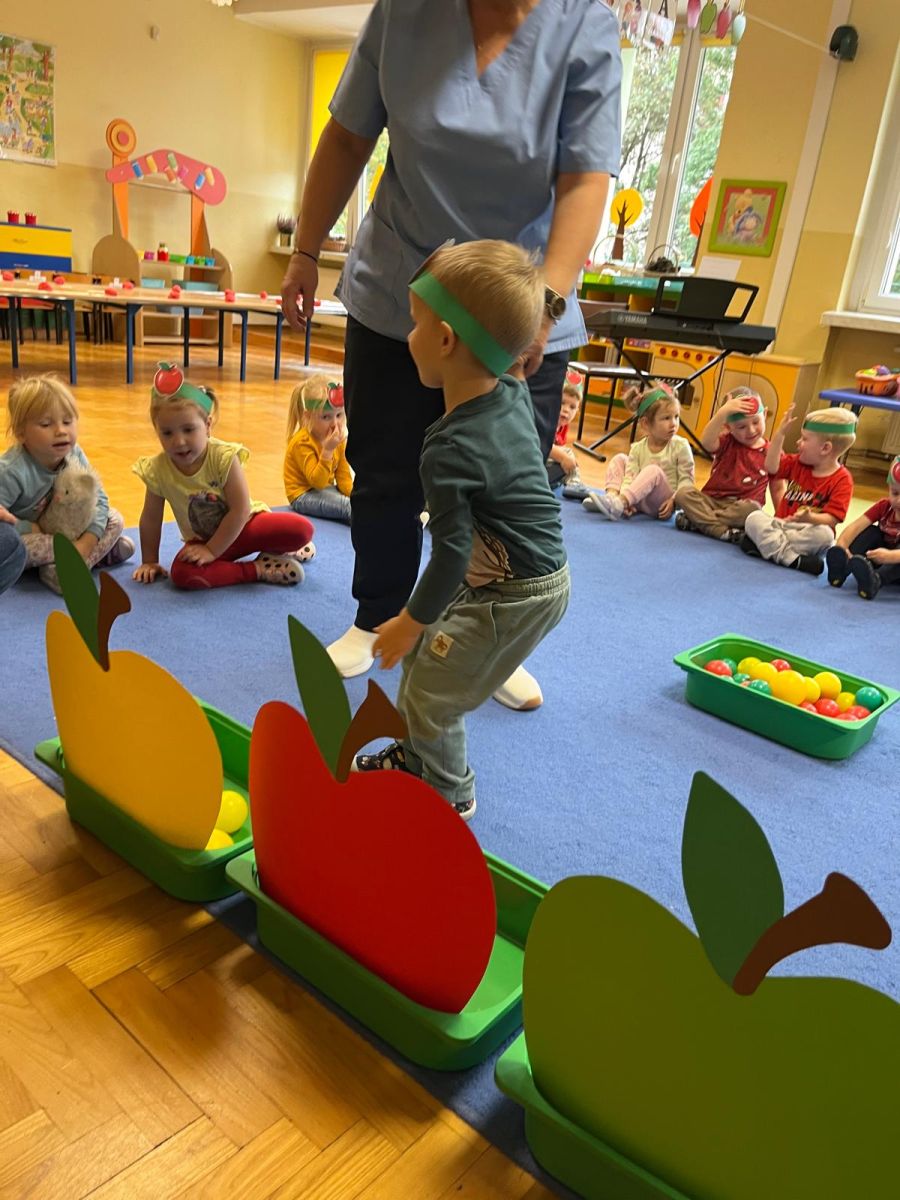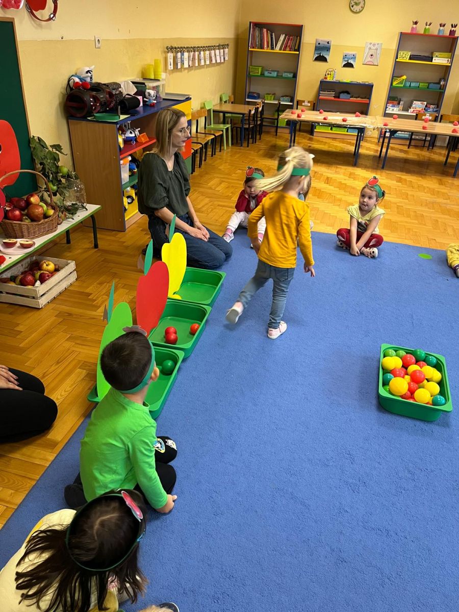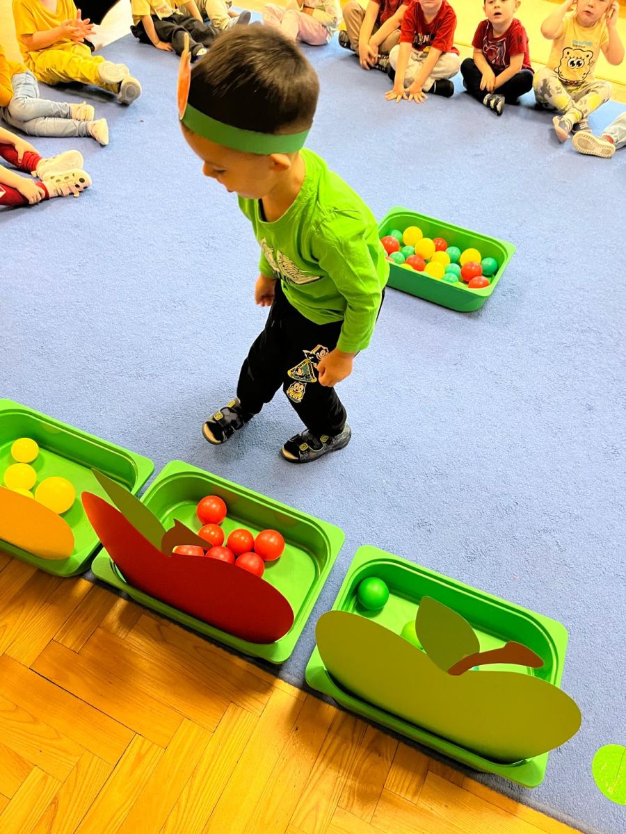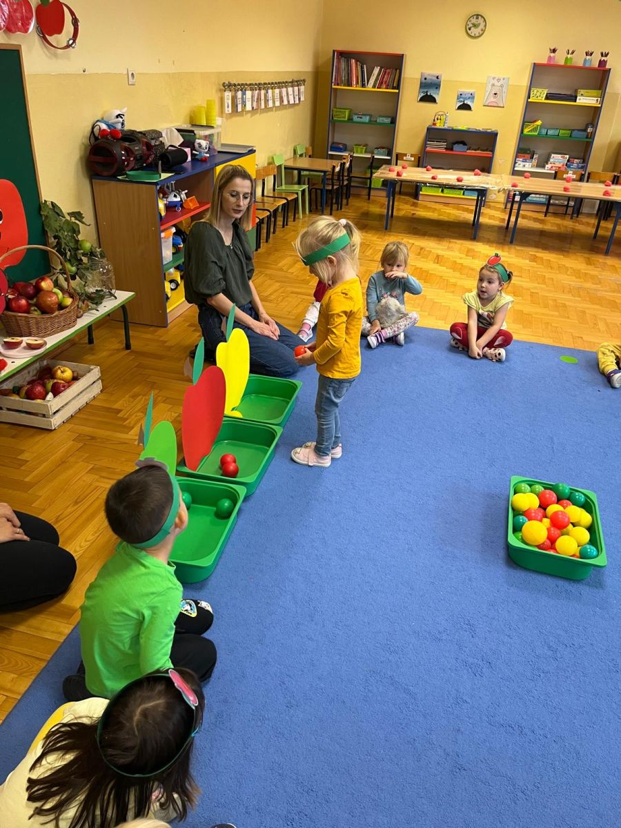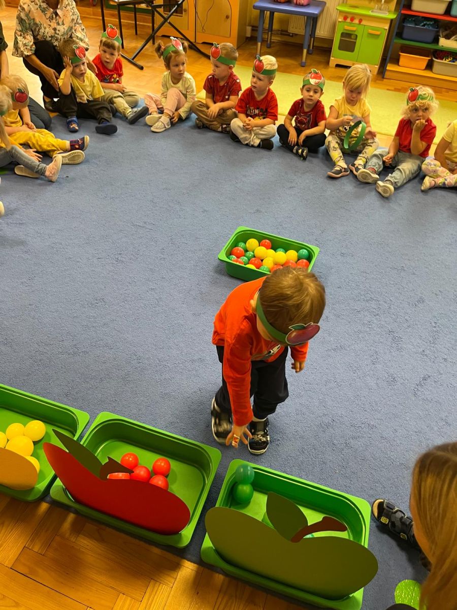 Następnie odbyła się zabawa dydaktyczna – segregacja jabłek według kolorów, dzięki której najmłodsi utrwalali znajomość barw i uczyli się logicznego porządkowania.