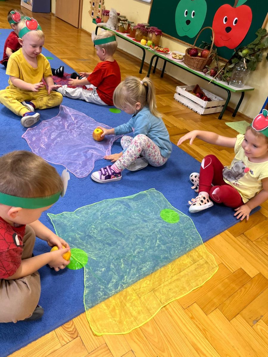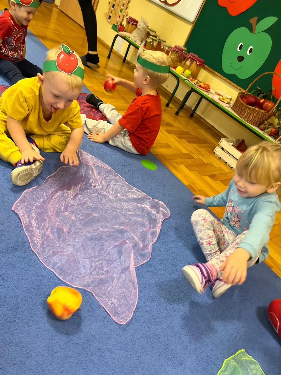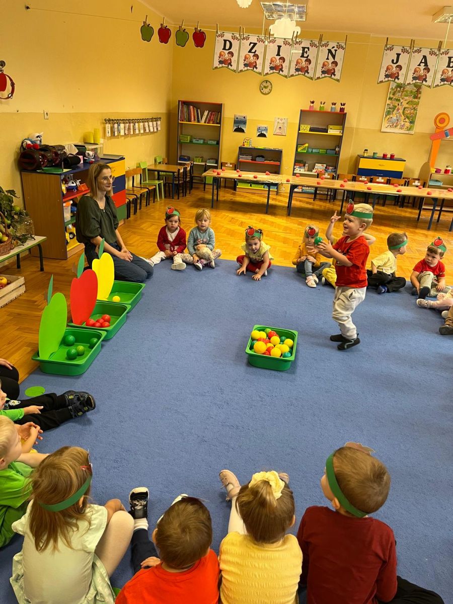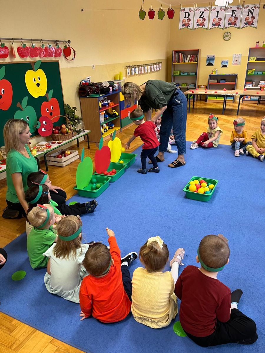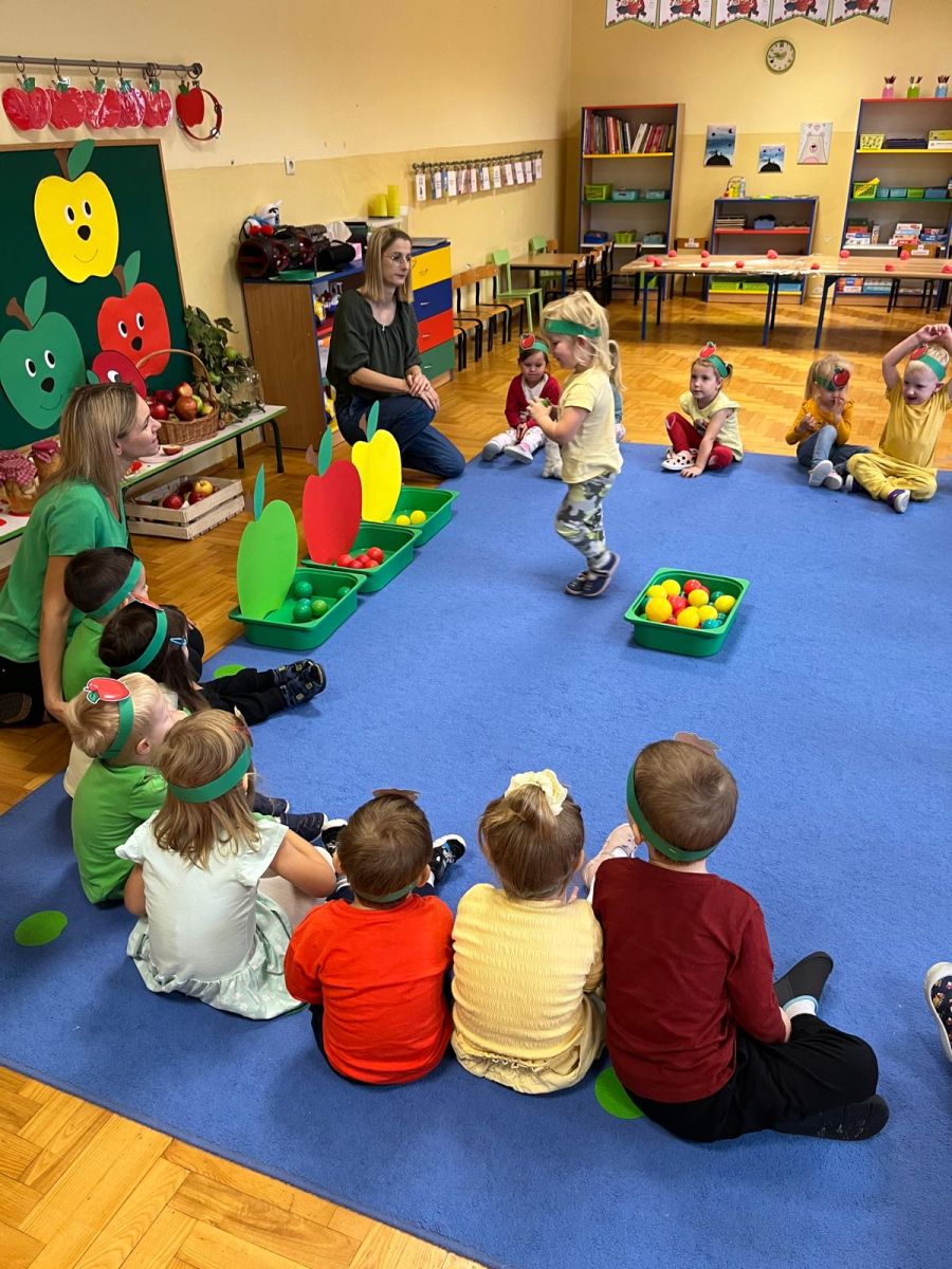 Następnie odbyła się zabawa dydaktyczna – segregacja jabłek według kolorów, dzięki której najmłodsi utrwalali znajomość barw i uczyli się logicznego porządkowania.