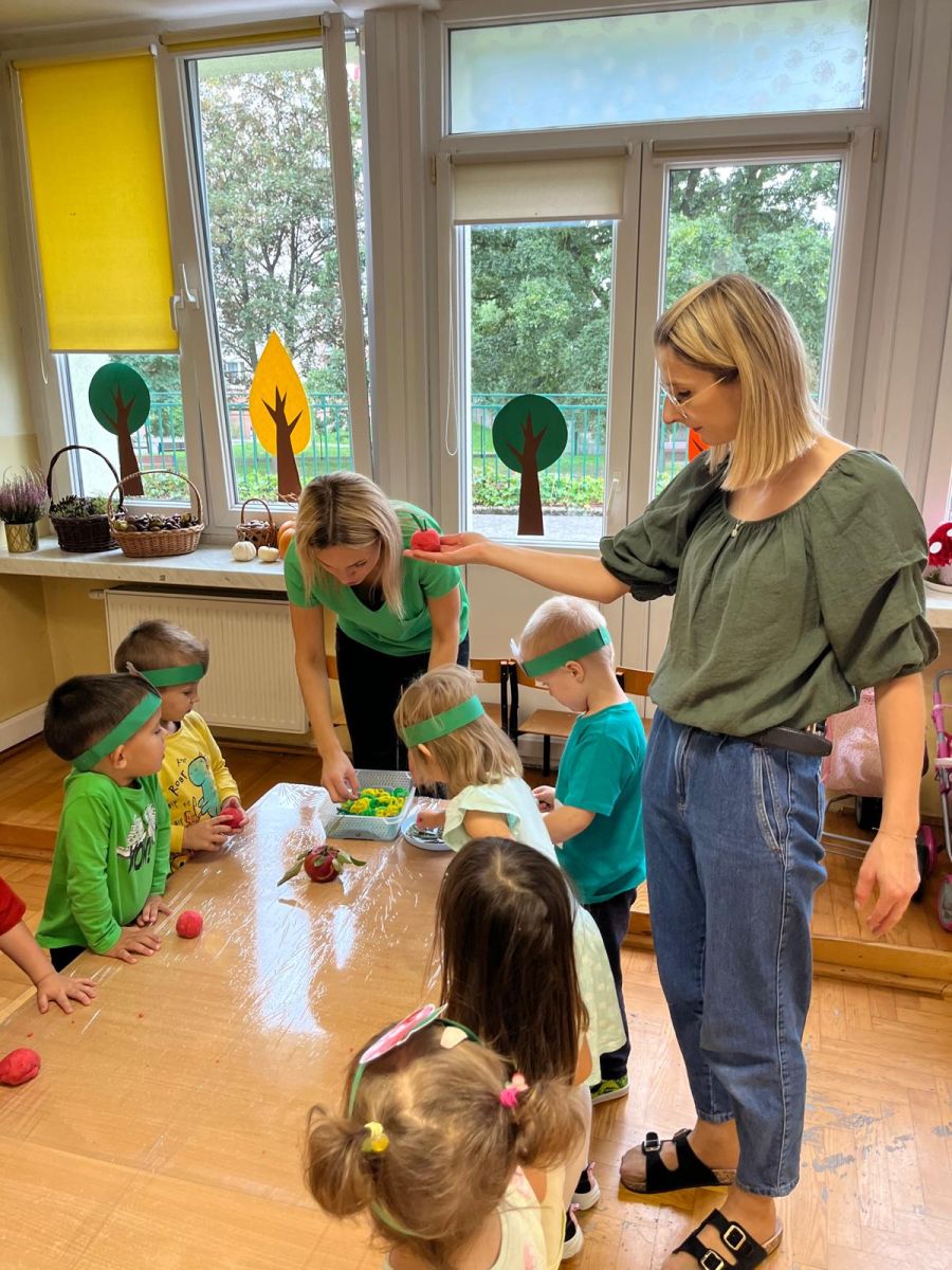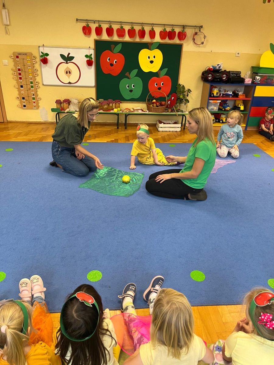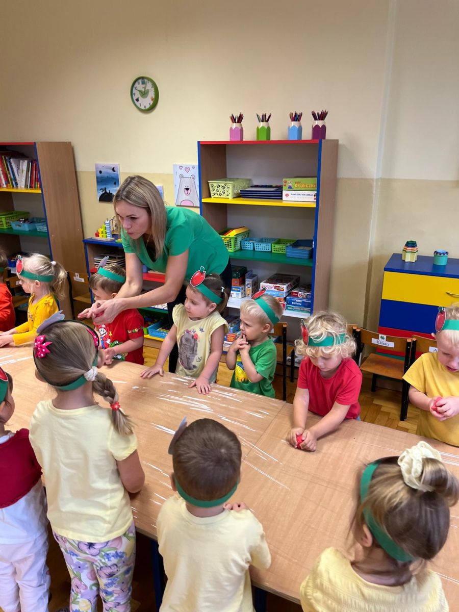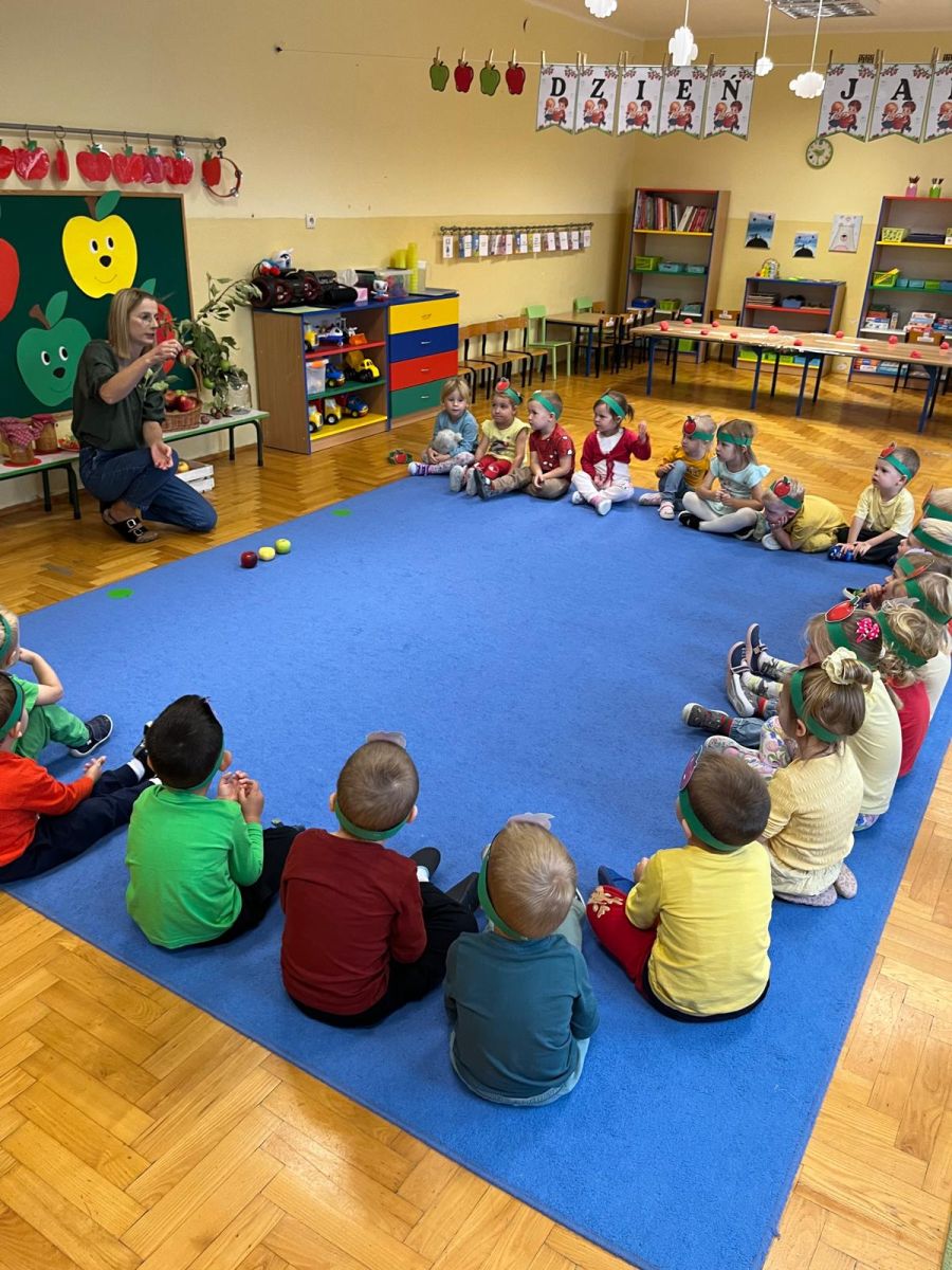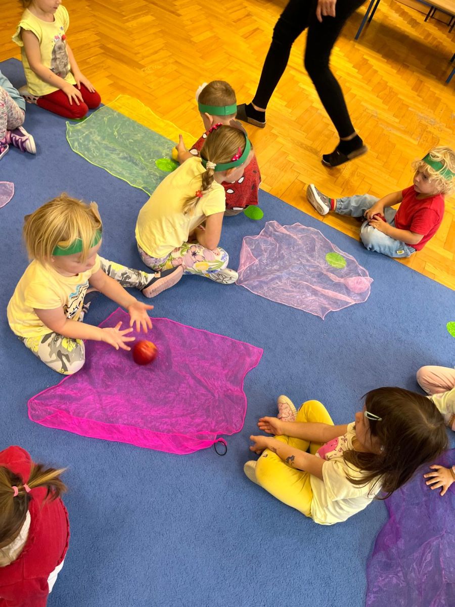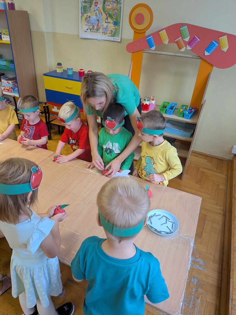 Następnie odbyła się zabawa dydaktyczna – segregacja jabłek według kolorów, dzięki której najmłodsi utrwalali znajomość barw i uczyli się logicznego porządkowania.