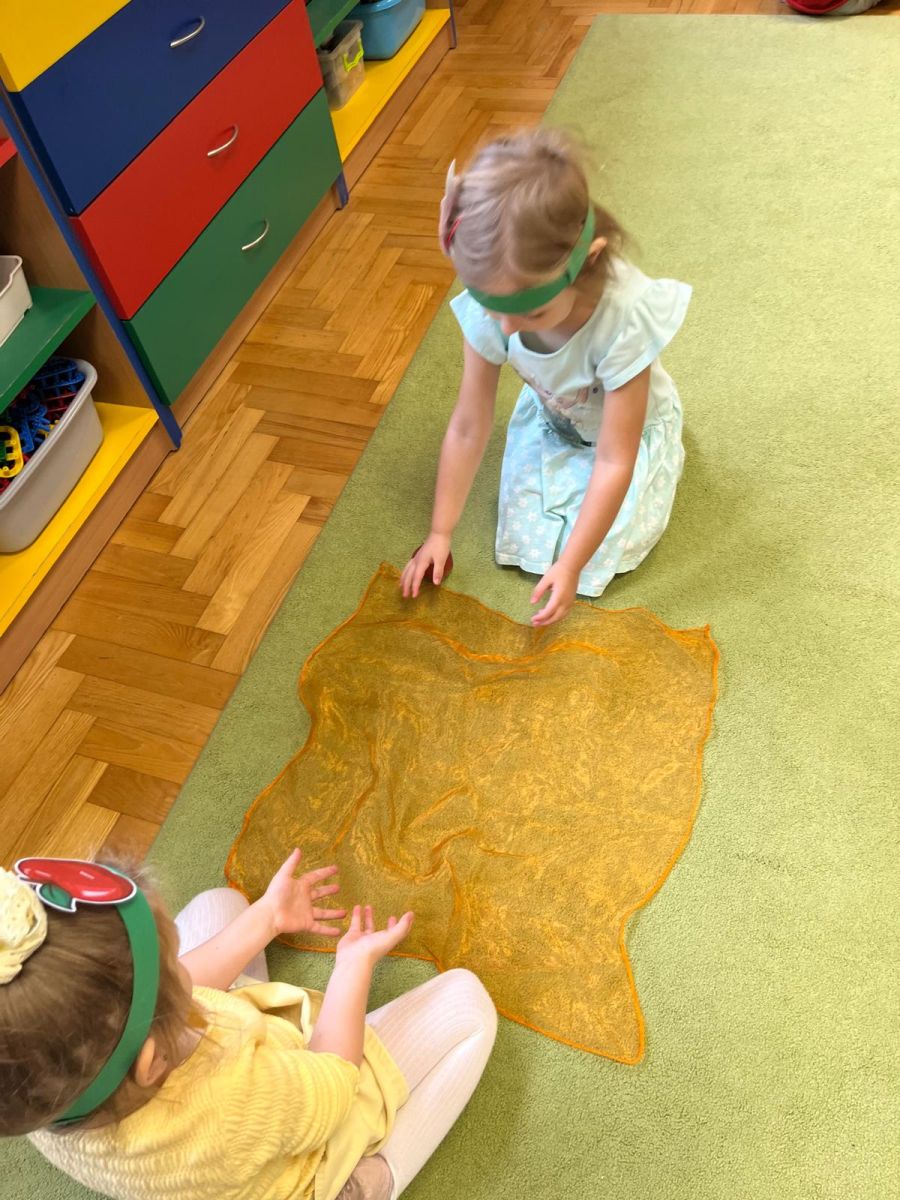 Kolejnym punktem programu były zabawy z gumą sensoryczną, które sprzyjały rozwojowi sprawności ruchowej oraz współpracy w grupie. Dużo radości przyniosły także zabawy integracyjne z wykorzystaniem kolorowych chusteczek, które wzmacniały więzi między dziećmi i uczyły koordynacji.