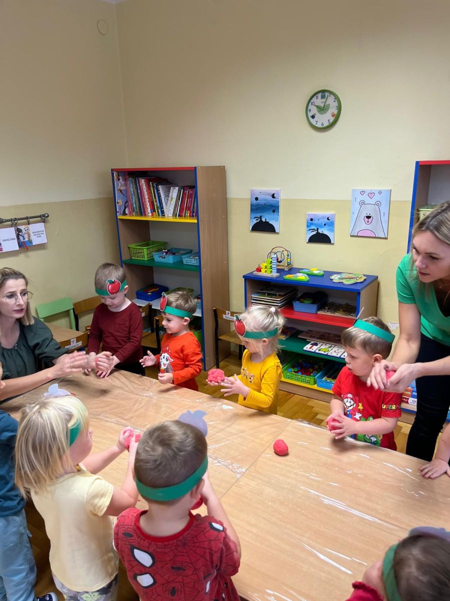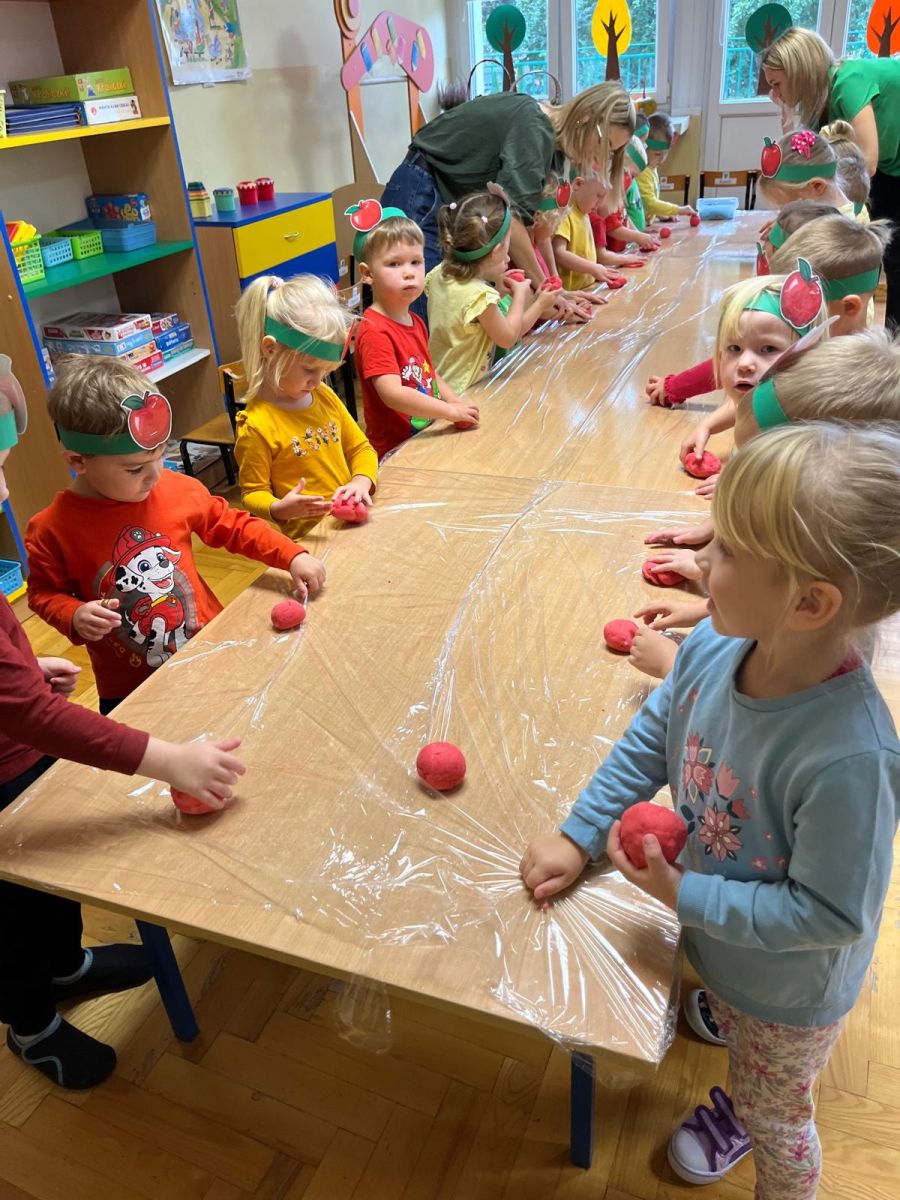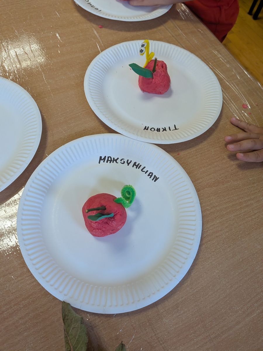Na zakończenie spotkania przedszkolaki rozwijały swoją kreatywność i zdolności manualne, tworząc jabłka z masy solnej.