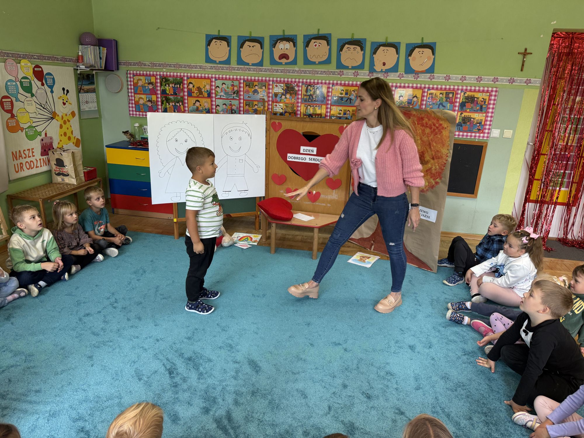 29 września w starszej grupie naszego przedszkola odbył się wyjątkowy dzień – „Dzień Dobrego Serduszka”, zorganizowany w ramach Tygodnia Dobrych Relacji. Była to okazja do rozmów, zabawy i wspólnej refleksji nad tym, co to znaczy mieć dobre serce i jak budować wartościowe przyjaźnie. Dzieci rozpoczęły zajęcia od burzy mózgów, podczas której wspólnie zastanawiały się, co oznacza bycie osobą o dobrym sercu. Następnie wysłuchały pięknej bajki pt. „Serduszko małego misia”. Opowieść stała się punktem wyjścia do rozmowy o miłości, przyjaźni i odwadze – wartościach szczególnie ważnych w codziennym życiu przedszkolaka. Aby lepiej zrozumieć treść bajki, dzieci ułożyły gałązkę logiczną, porządkując kolejno wydarzenia i ukazując ich sens. Nie zabrakło również aktywności rozwijających relacje rówieśnicze. Podczas zabawy „Wędrujące serduszko” dzieci mówiły sobie nawzajem coś miłego, ucząc się dostrzegać i doceniać innych. Odgrywały różne scenki dramowe, w których wyrażały emocje za pomocą ruchu i mimiki. Radosnym akcentem był udział w tańcach w parach oraz zabawach integrujących grupę. Szczególną atrakcją była praca plastyczna – dzieci w grupach kolorowały duże obrazki przedstawiające dziewczynkę i chłopca, a następnie rozmawiały o tym, jaki powinien być dobry kolega i dobra koleżanka. Dzięki temu mogły nie tylko rozwijać swoją kreatywność, ale także uświadomić sobie, jak ważne są pozytywne cechy w budowaniu przyjaźni. Powstało również niezwykłe Drzewo Przyjaźni – każde dziecko narysowało na serduszku siebie i swojego przyjaciela z grupy, a następnie zawiesiło je na wspólnym drzewie. Na zakończenie pełnego wrażeń dnia dzieci otrzymały wyjątkowe medale z napisem „Jestem dobrym kolegą/koleżanką”. Była to piękna nagroda za zaangażowanie, życzliwość i otwarte serca.