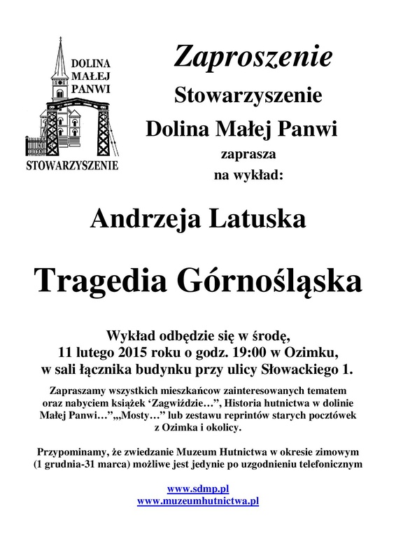 Stowarzyszenie Dolina Małej Panwi zaprasza na wykład Andrzeja Latuska zatykułowany "Tragedia Górnośląska", który odbędzie się 11.02 (środa) o godzinie 19:00, w sali PGKiM przy ulicy Słowackiego 1.Szczegóły na plakacie.