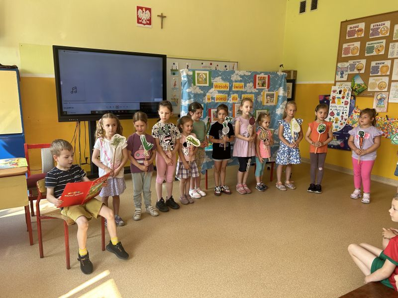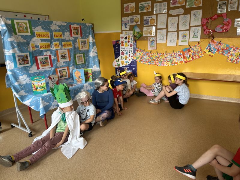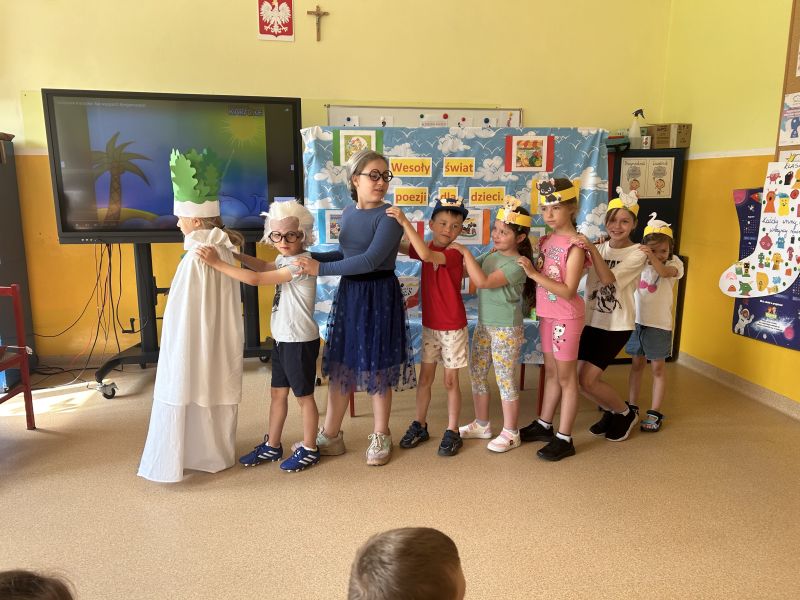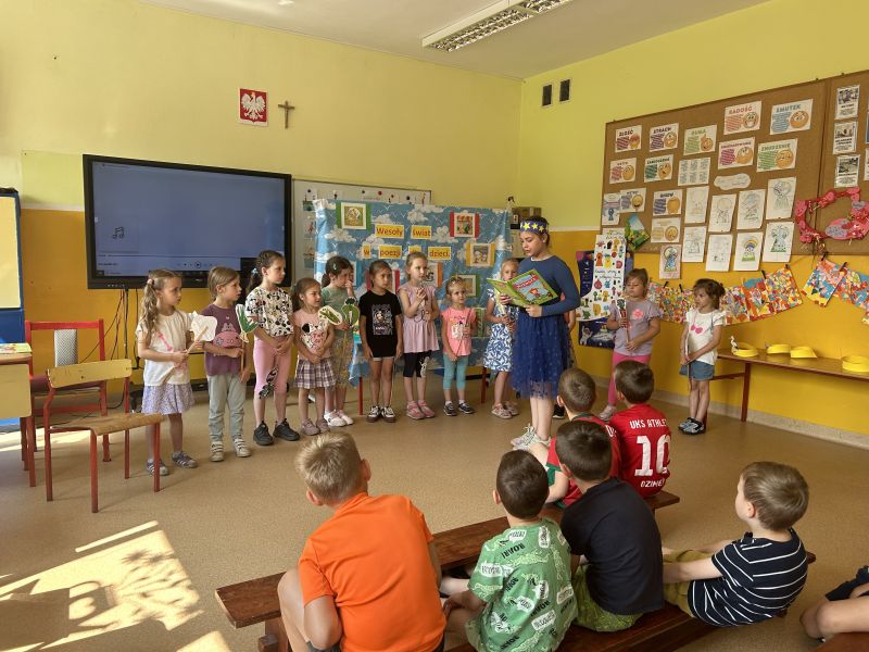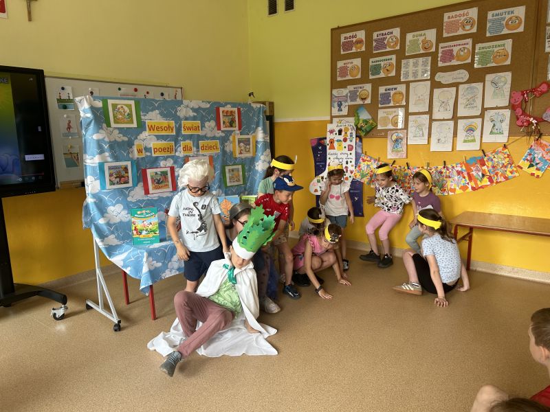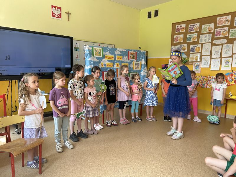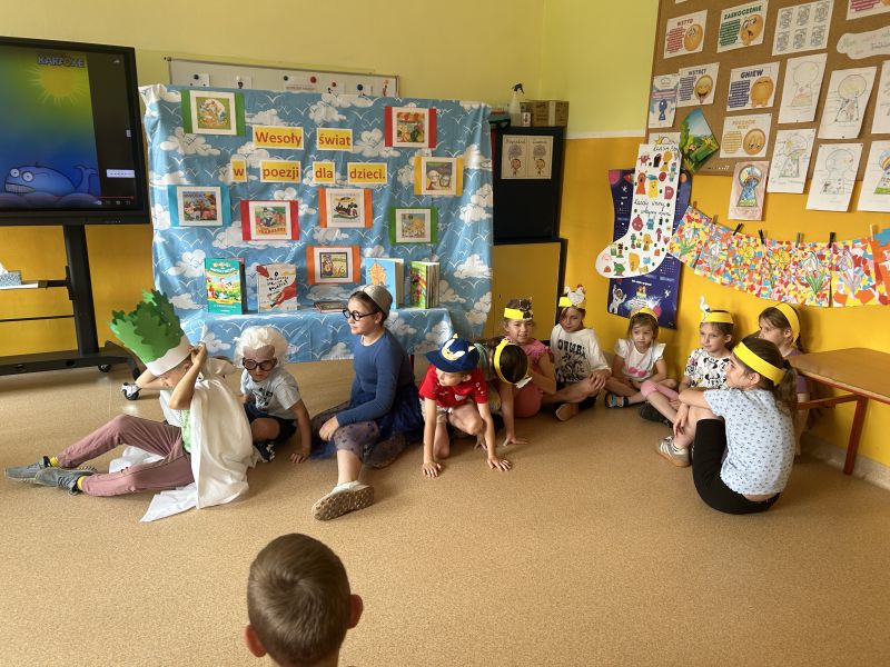 W czwartek, 5 czerwca 2025 r. na zaproszenie uczniów klasy 3b ze Szkoły Podstawowej Nr 1 w Ozimku, dzieci z grupy IV miały przyjemność odwiedzić szkołę i wziąć udział w wyjątkowym wydarzeniu pt. „Wesoły świat w poezji dla dzieci”.
