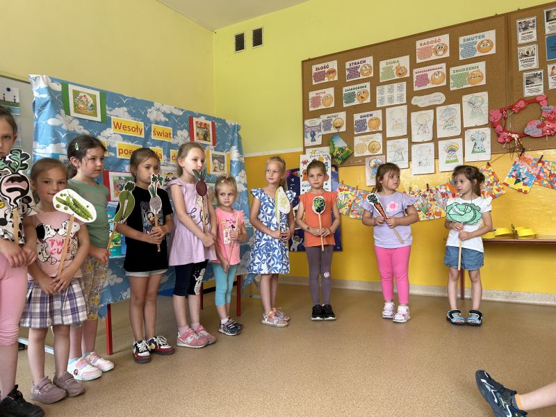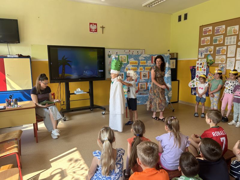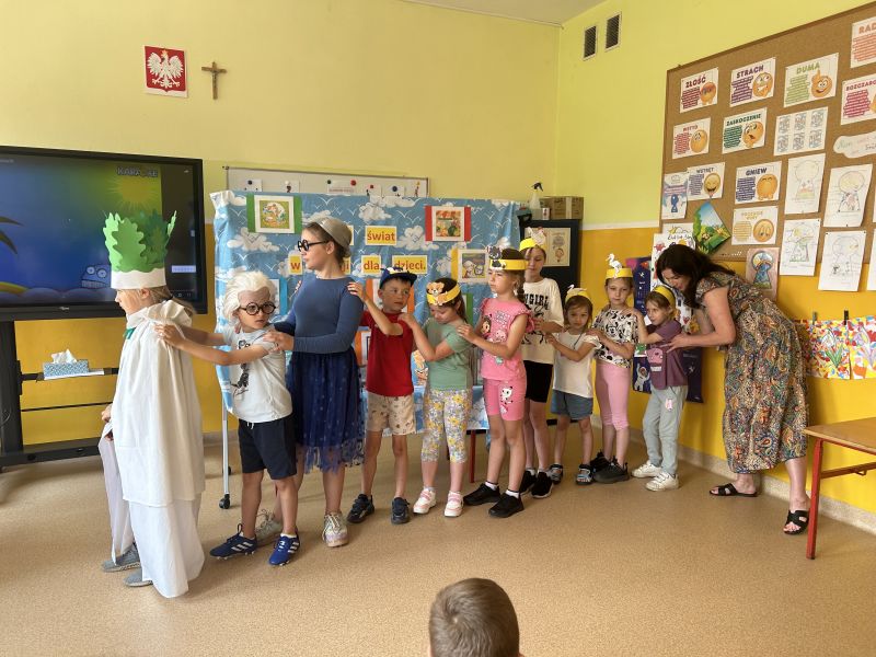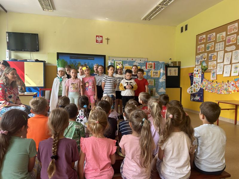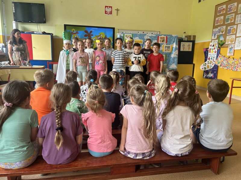 Następnie razem z uczniami, pod opieką Pani Karoliny i Pani Sonii, wzięliśmy udział w inscenizacji wiersza „Rzepka” Juliana Tuwima. Wystąpili w niej zarówno uczniowie, jak i przedszkolaki – wspólnie stworzyliśmy zabawną i pełną energii opowieść, która bardzo spodobała się publiczności. Po tym występie jedna z uczennic zaśpiewała piosenkę „Leń”, która wywołała wiele uśmiechów i rozbawiła wszystkich obecnych.