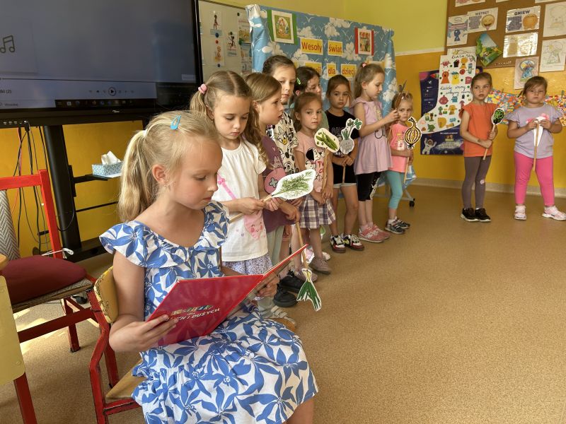 Kolejnym punktem programu był występ naszej przedszkolnej grupy. Dzieci czytały wybrane utwory znanych polskich poetów. Swoje umiejętności czytelnicze prezentował Krzysiu, czytając wiersz „Na straganie” Jana Brzechwy. Następnie Fabian przeczytał wiersz Wandy Chotomskiej „Co słychać na wsi”, a Liliana pięknie interpretowała utwór „Skarżypyta” Jana Brzechwy. Kolorowe rekwizyty i zaangażowanie dzieci sprawiły, że występ został nagrodzony gromkimi brawami.