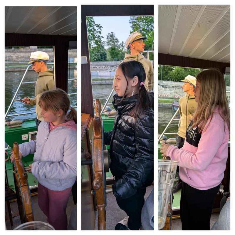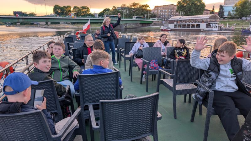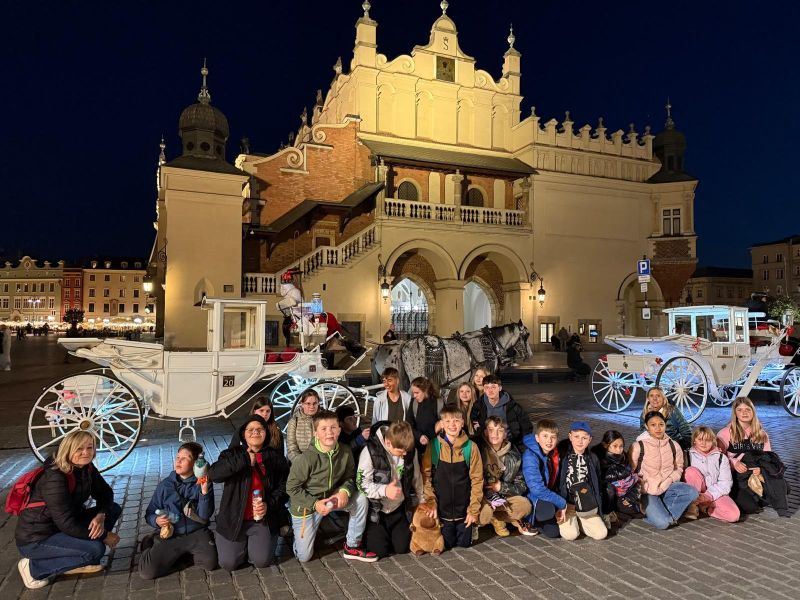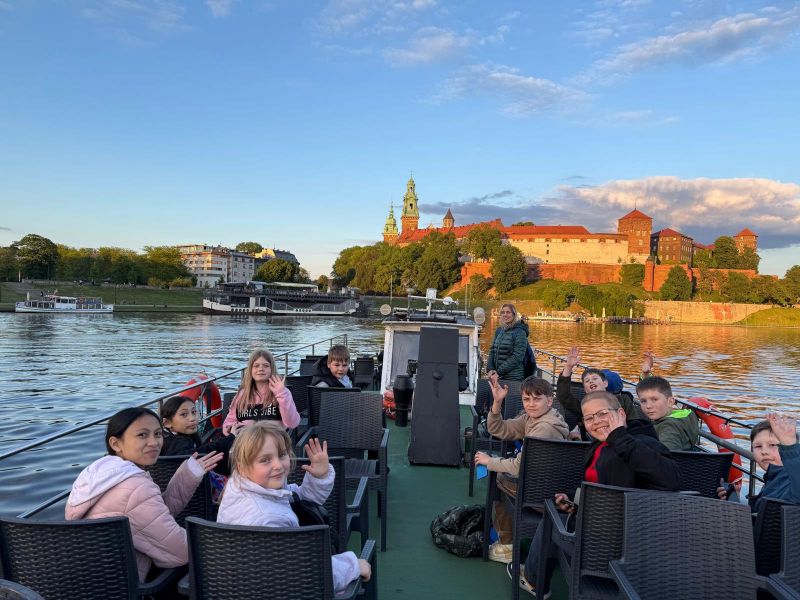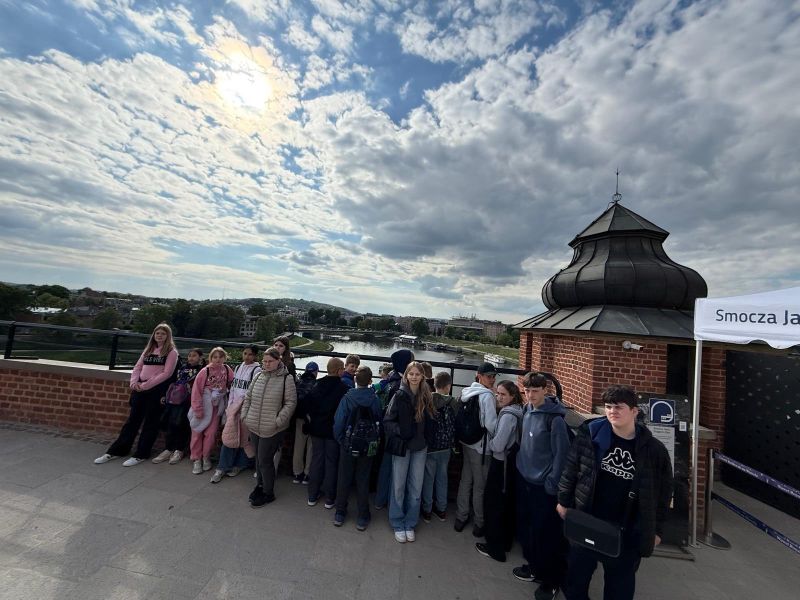 Po wielogodzinnym marszu udaliśmy się do hotelu. Szybkie zakwaterowanie, chwila na złapanie oddechu, pyszna obiadokolacja i ponownie ruszyliśmy na wieczorny podbój miasta. Rozpoczęliśmy go od rejsu po Wiśle. W świetle zachodzącego słońca Kraków prezentował się bajecznie. Widoki piękne, wiaterek przyjemny, ale największą atrakcją było zdobycie dyplomu Odkrywcy Wodnych Szlaków Krakowa. Każdy z nas miał również możliwość wcielić się w rolę sternika i co najważniejsze, nie rozbiliśmy łajby- szczęśliwie przycumowaliśmy w porcie. Powoli nadciągał zmrok, ale nam nie są straszne ciemności- pomaszerowaliśmy na Stare Miasto. Spustoszyliśmy sklepiki z pamiątkami, po czym udaliśmy się na przejażdżkę przepięknie oświetlonymi dorożkami. Czuliśmy się wyróżnieni z tłumu , chociaż nasz ubiór niezupełnie pasował do wystroju dorożek, ale i bez niego zabawa była prawdziwie w królewskim stylu. Moc wrażeń i późna pora zmusiły nas do powrotu w hotelowe zacisze. Może nie do końca zacisze, ale na pewno do bezpiecznej przystani. Czekała nas długa noc…I tu postawimy kropkę w temacie. Co się działo, niech pozostanie naszą słodką tajemnicą. I chociaż rano ciężko nam było „zwlec się z wyrka”, to punkt ósma wszyscy stawiliśmy się na zbiórkę. Trochę ponarzekaliśmy na niewyspanie, ale pyszne śniadanie postawiło nas na nogi i pełni wigoru ruszyliśmy na dalszy podbój Krakowa. Pierwszym celem było Muzeum Lotnictwa Polskiego. Ogromne hangary, samoloty z każdej epoki, śmigłowce, kokpity i …my, próbujący zrozumieć, jak to wszystko latało. Wielu z nas po tej wizycie nie tyle zyskało szacunek do pilotów, co straciło złudzenia o własnych zdolnościach technicznych. Ale było warto. Po zdobyciu wiedzy teoretycznej udaliśmy się na sprawdzian praktyczny, czyli warsztaty modelarskie. Naszym zadaniem było złożenie modelu śmigłowca. Skromnie dodamy, że poszło nam wyśmienicie. Po „lotniczych” atrakcjach potrzebowaliśmy ruchu. Padło na Ogród Doświadczeń im. Stanisława Lema- czyli miejsce, gdzie nauka spotyka zabawę, a człowiek kreci się na wirujących krzesłach jak w lunaparku fizyki. Dowiedzieliśmy się, że grawitacja działa. Naprawdę. Pomału nasza przygoda dobiegała końca. Wzruszeni, zmęczeni i trochę głodni zatrzymaliśmy się w…McDonald’s. Tak, to nie wstyd. Frytki ocaliły nasz poziom cukru. Kraków to miasto- legenda. Historia, smoki, lasery, rejsy, lotnictwo…- wszystko w jednym miejscu. Nie da się go ogarnąć w dwa dni, ale można spróbować. Czy przeżyliśmy? Tak! Czy wrócimy? Zdecydowanie. Nie pominiemy też McDonalda, bo każdy bohater zasługuje na frytki. Pragniemy serdecznie podziękować Biuro Podróży Agricola na czele z P. Grzegorzem za niezapomnianą przygodę. Do szybkiego zobaczenia