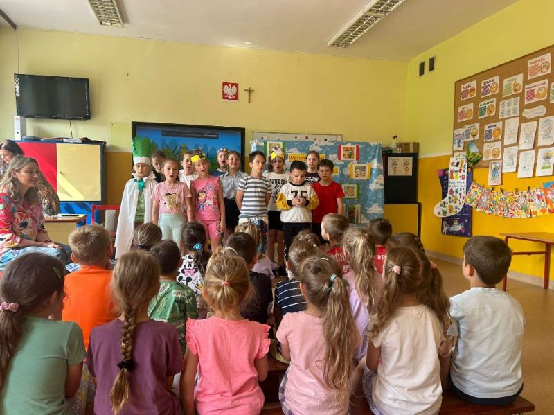 Następnie przedszkolaki zaprezentowały swoje talenty recytowały wierszyki, w tym znany utwór „Na straganie”, trzymając w rączkach piękne rekwizyty warzyw. Występy zakończyły się pięknym wierszem "Idzie niebo" wykonanym przez Hanię Wilczek. Na zakończenie czekał na nas słodki poczęstunek, a potem wspólna zabawa na szkolnym placu zabaw.