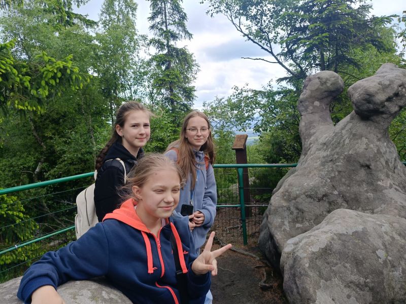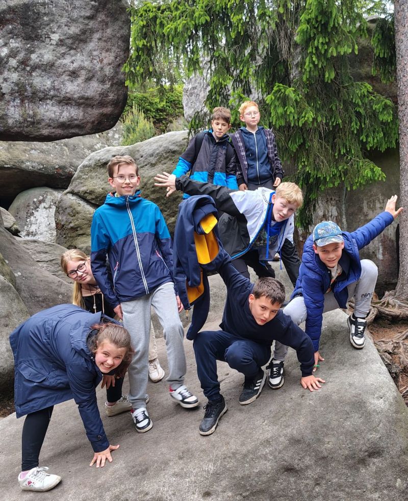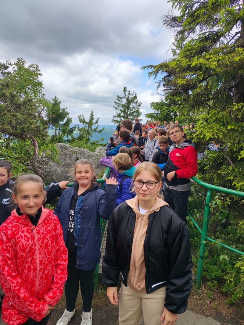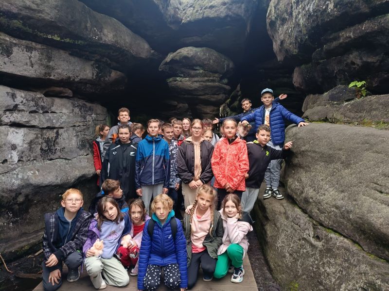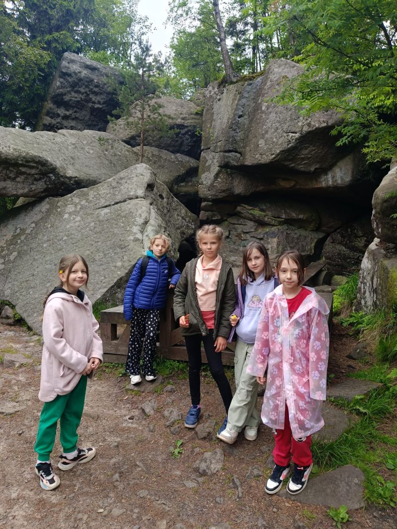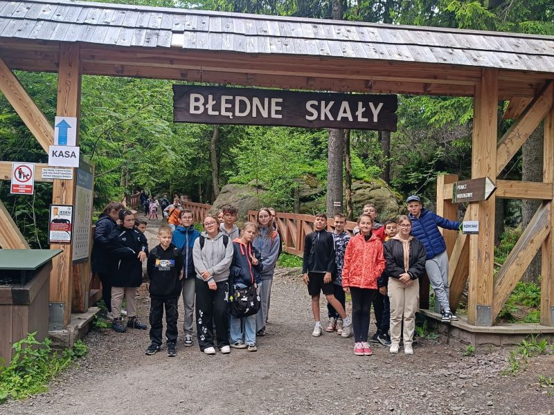 11 czerwca uczniowie klas V, VI i III, pod czujnym okiem swoich wychowawców, wyruszyli na pełną przygód wyprawę do Kotliny Kłodzkiej. Już od rana pogoda robiła nam psikusa - deszcz i ciemne chmury uparcie towarzyszyły nam aż do Złotego Stoku. Ale jak tylko wysiedliśmy z autokaru - niespodzianka! Przywitało nas słońce. Pierwszym punktem programu była niezwykła Kopalnia Złota. Zwiedzając jej tajemnicze korytarze, zobaczyliśmy jedyny w Polsce podziemny wodospad - robił wrażenie! Choć szukaliśmy złota z ogromnym zapałem, niestety nic nie znaleźliśmy. Może następnym razem! Potem przenieśliśmy się w czasie do osady rzemieślniczej. Tam wykorzystując siłę własnych mięśni (i całkiem sporo energii!) uruchamialiśmy różne dawne narzędzia. Można było poczuć się jak prawdziwy średniowieczny majster. Na deser - prawdziwa uczta dla zmysłów: spacer po Błędnych Skałkach. Niesamowite formacje skalne, wąskie przesmyki i fantastyczne widoki sprawiły, że czuliśmy się jak odkrywcy w zaczarowanym świecie. Wróciliśmy zmęczeni ale z szerokimi uśmiechami. To była fajna wycieczka i już nie możemy się doczekać następnej! Dziękujemy nauczycielom, którzy podczas wycieczki z pełnym zaangażowaniem objęli opieką uczniów i z zapałem zorganizowali całą wyprawę! Dziękujemy paniom: Tamarze Antczak, Justynie Lenartowicz oraz Joannie Niedźwiedź!