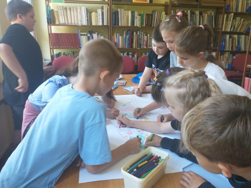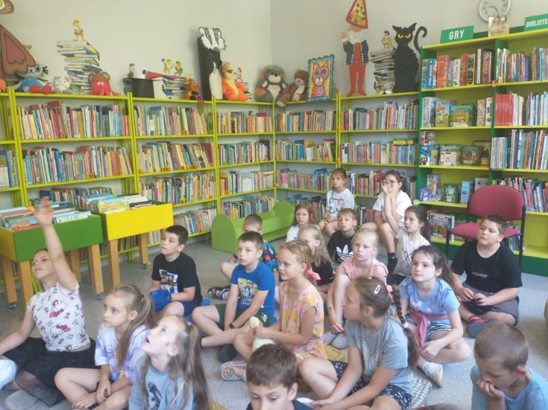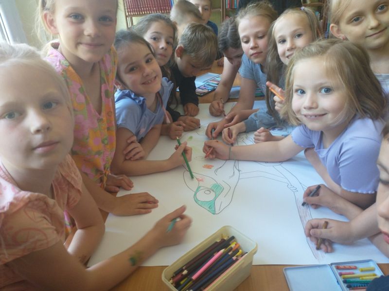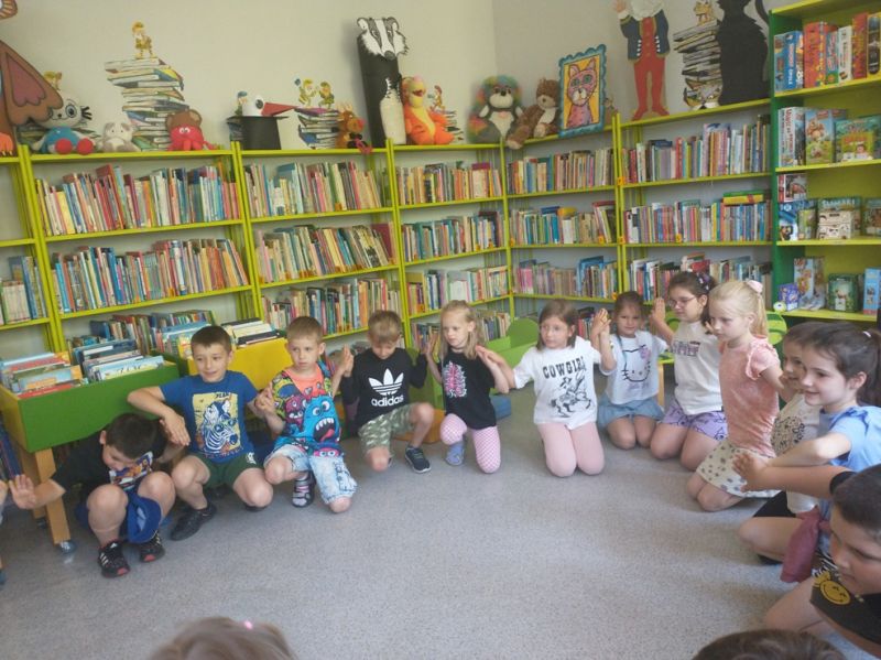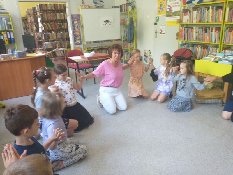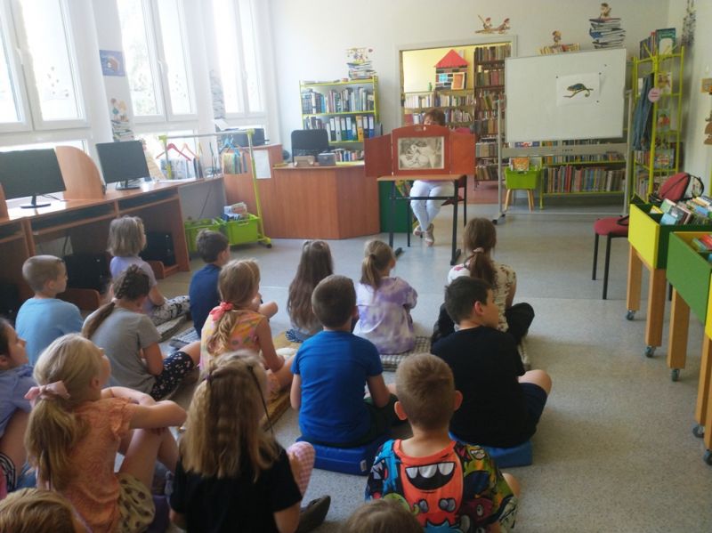 18 czerwca uczniowie klasy 1a uczestniczyli w zajęciach czytelniczych w Oddziale Dziecięcym MiGBP w Ozimku, poprowadzonych przez panią Wiesławę Piechaczek. Na początku dzieci z zainteresowaniem wysłuchały bajki o kameleonie Leonie oraz jego przyjacielu świerszczu Emilu. Bajka stała się przyczynkiem do rozmowy z dziećmi o samoakceptacji i wartości bycia sobą. Uczestnicząc w grach i zabawach dzieci zobaczyły, że każdy jest wyjątkowy, dostrzegły że mają wiele różnych talentów oraz zrozumiały, że najlepiej w każdej sytuacji jest być sobą. Na zakończenie wykonały pracę plastyczną, która polegała na pokolorowaniu dużego kameleona, wykazując się przy tym pomysłowością oraz tolerancją i zgodą przy wspólnej pracy.