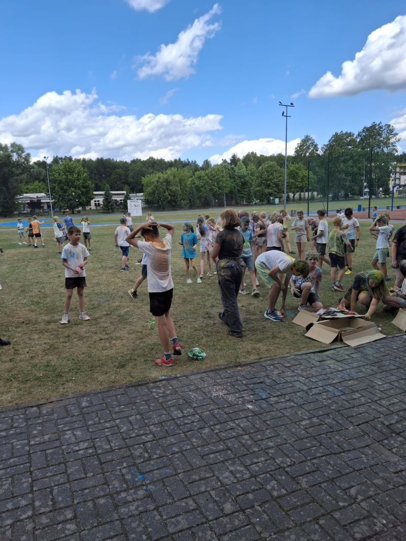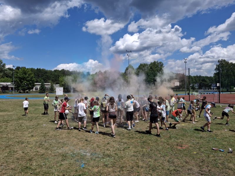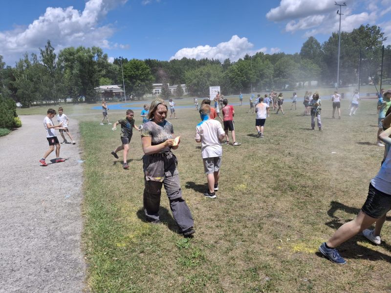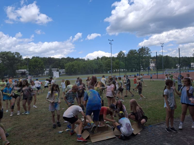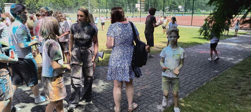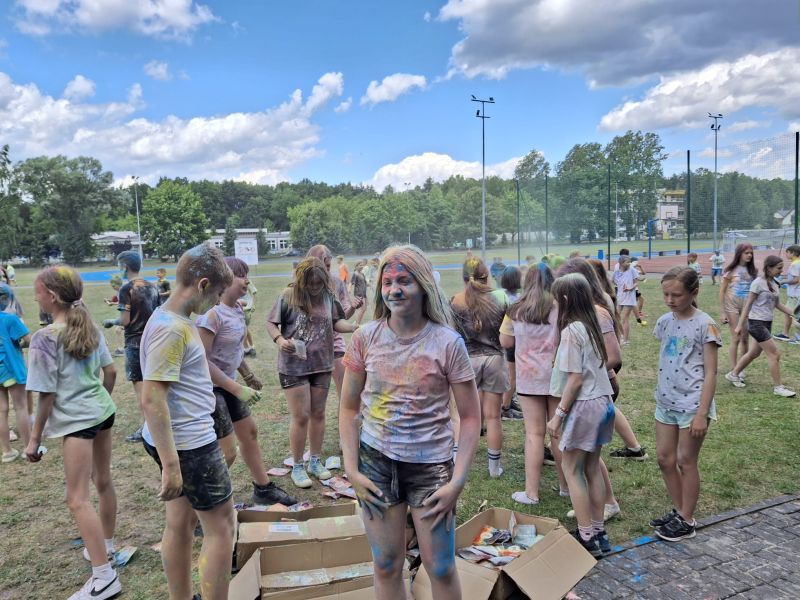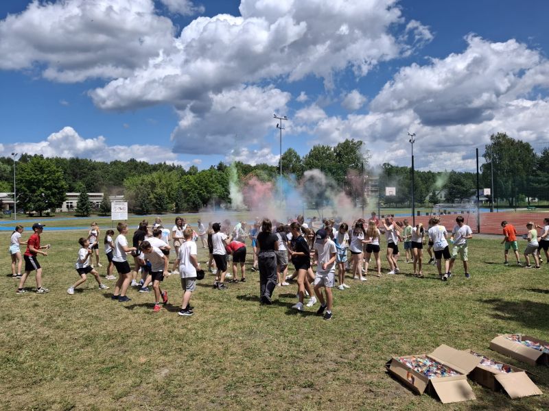Choć musieliśmy chwilkę poczekać – było warto! Dzięki sprzyjającej pogodzie udało się zrealizować niespodziankę od Rady Rodziców z okazji Dnia Dziecka – radosne i pełne barw Święto Kolorów!