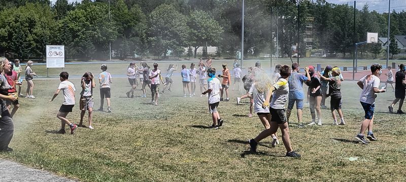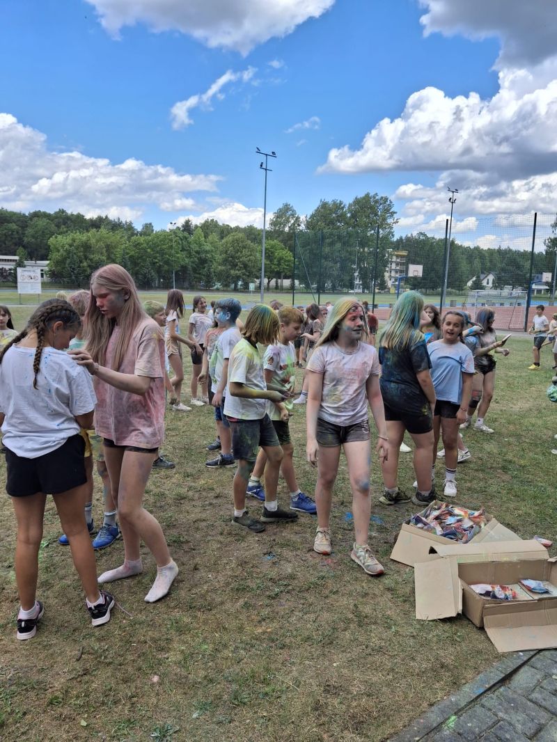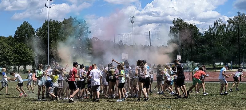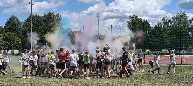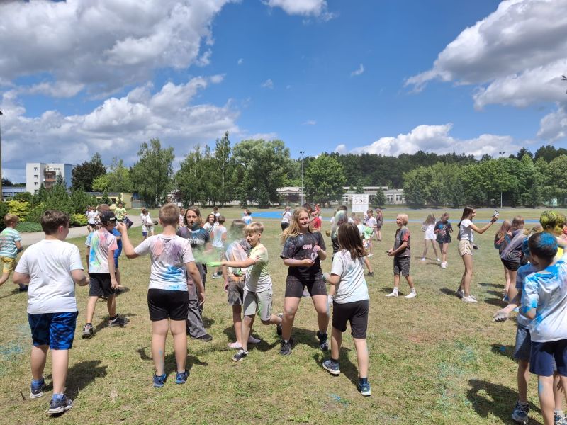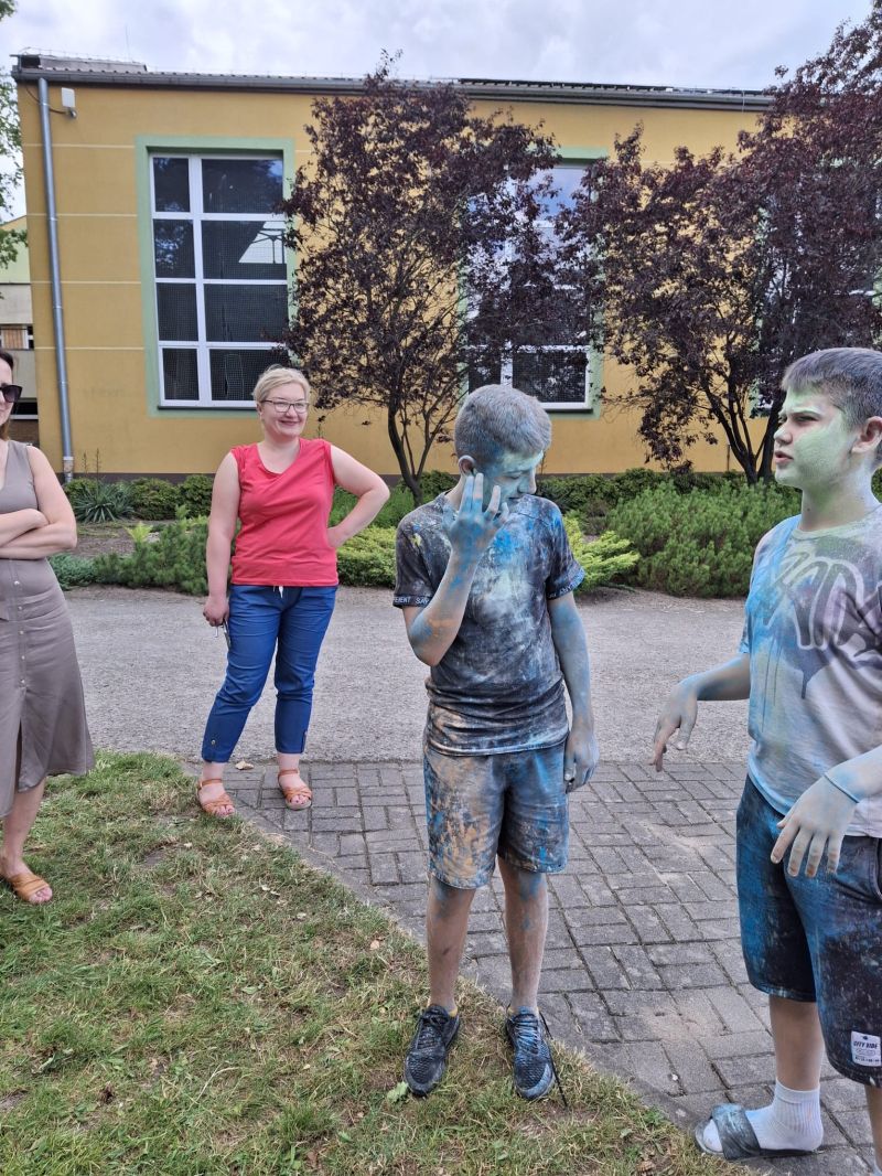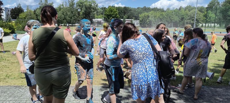 Choć musieliśmy chwilkę poczekać – było warto! Dzięki sprzyjającej pogodzie udało się zrealizować niespodziankę od Rady Rodziców z okazji Dnia Dziecka – radosne i pełne barw Święto Kolorów!