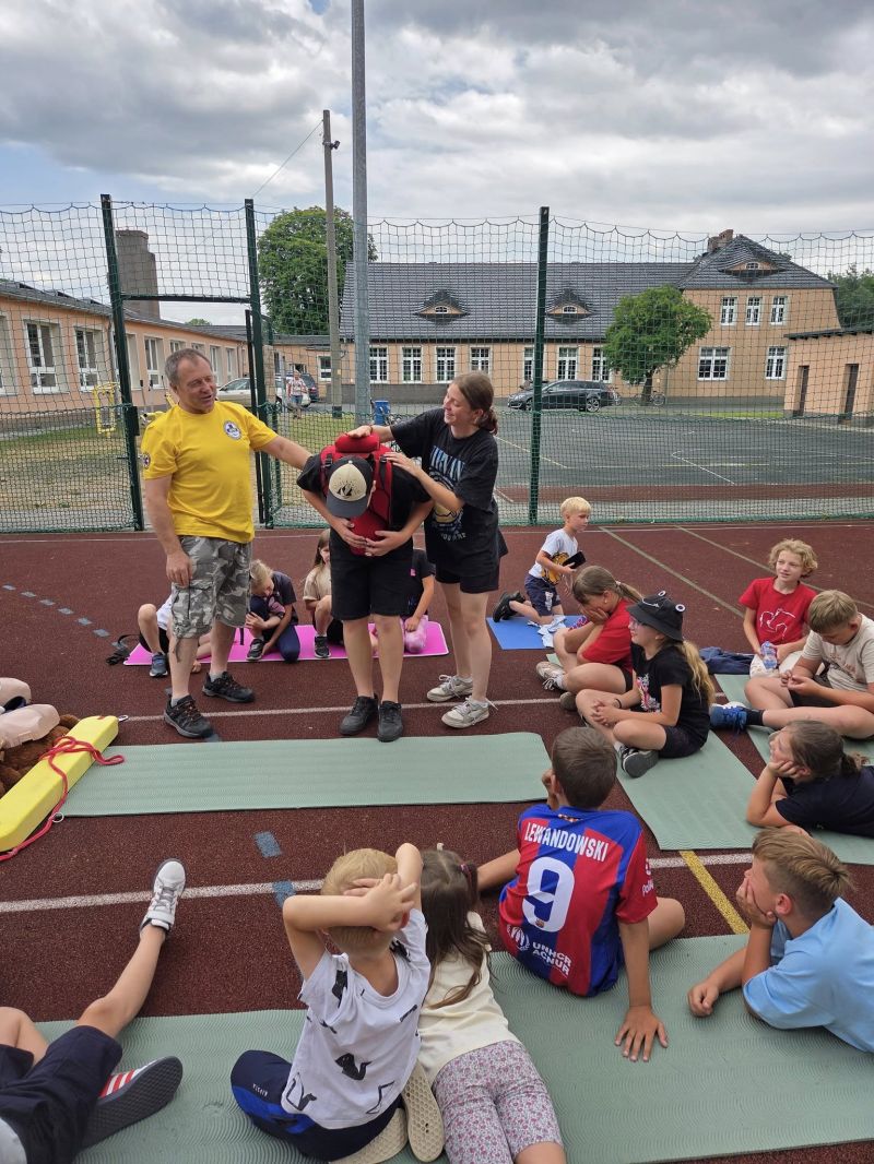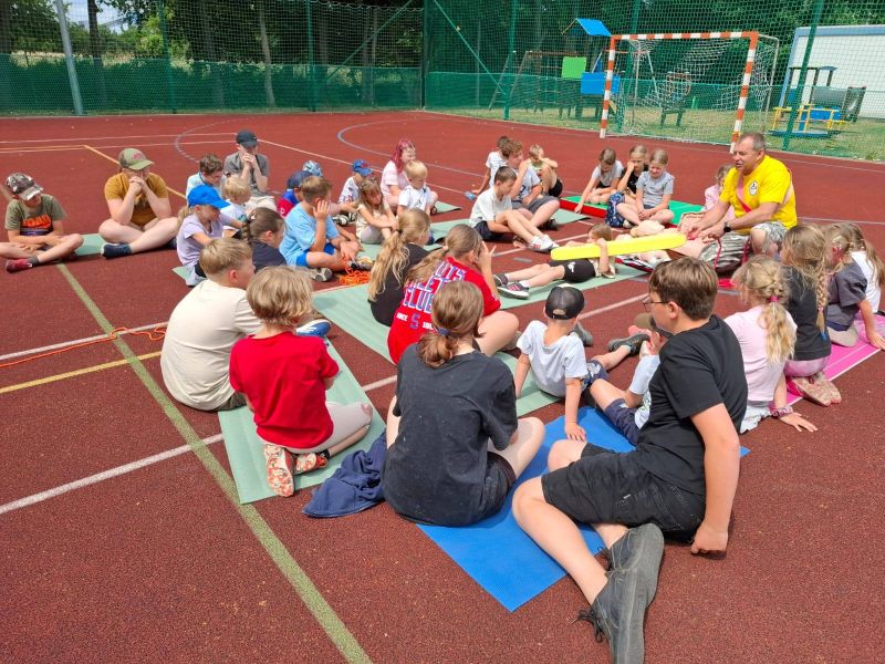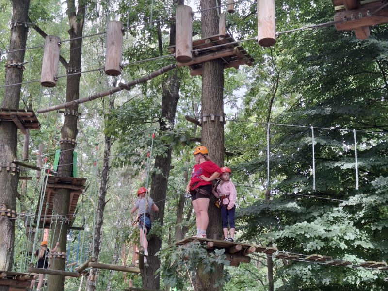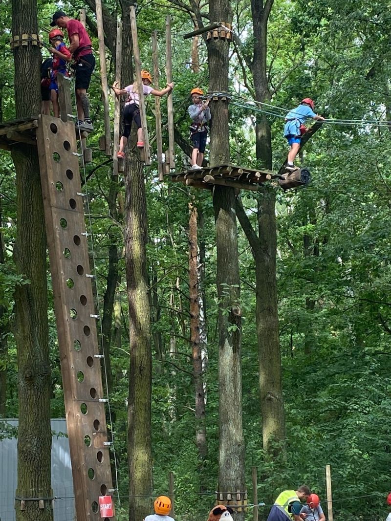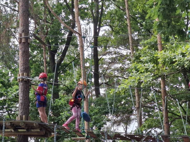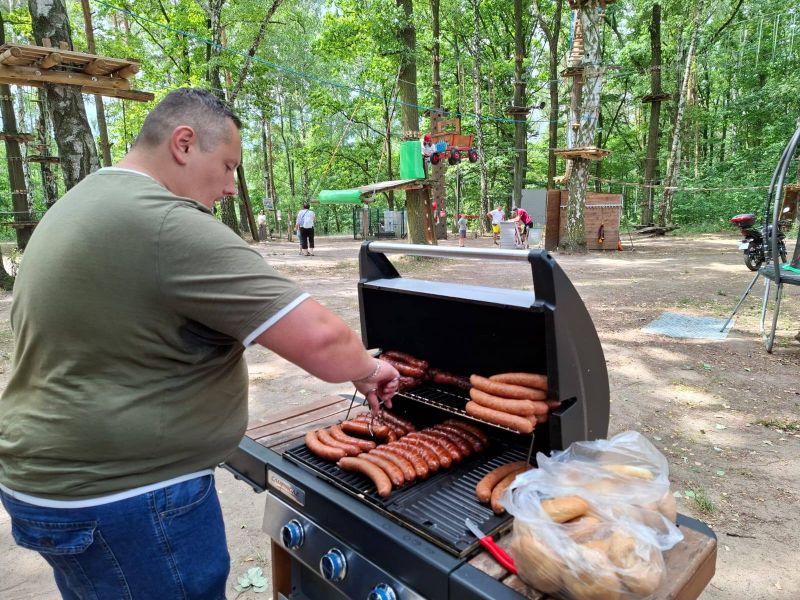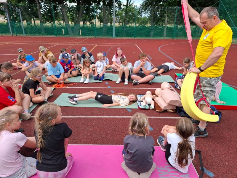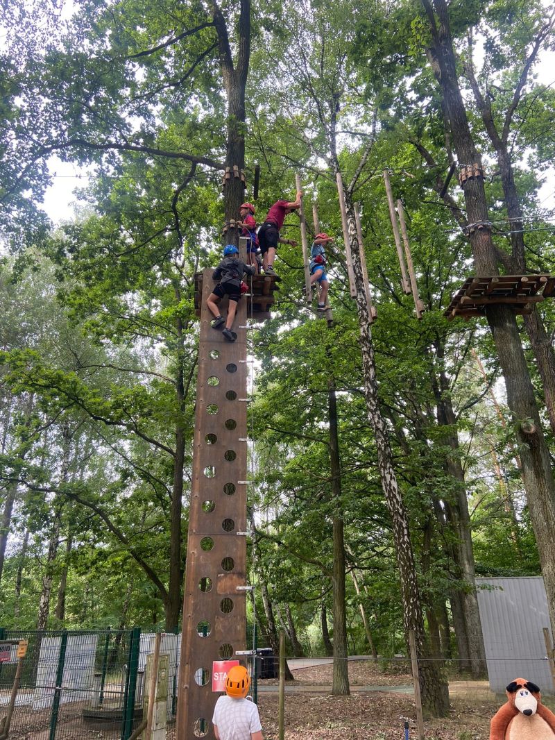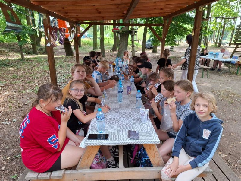 Dzisiaj ostatni dzień naszych półkolonii. Uczestnicy pojechali do Linolandii - Parku Linowego Turawa. Tam każdy miał do przejścia 2 trasy. Świetny sposób na aktywnie spędzony czas. Dużo radości, trochę zmęczenia i potu. Po przejściu na każdego czekała już upieczona kiełbaska. Dziękujemy naszemu Grill - Majstrowi Panu Grzegorzowi Filipkowi. W tak wspaniały dzień nie mogło zabraknąć oczywiście pysznych lodów. Po powrocie czekał już na nas Człowiek Orkiestra Pan Janusz Bajorek - Strażak, Ratownik, Wychowawca, Trener... I można by tak wymieniać dalej. Pan Janusz w bardzo ciekawy sposób pokazał nam jak zachować się nad wodą. Sprawdził wiedzę przekazaną przez Strażaków z OSP Schodnia. Brawo dla nich. Zdali na medal z wyróżnieniem. Poznali, co to jest defibrylator AED i jak go obsługiwać. Oby nigdy nie musieli tej wiedzy używać, ale wiemy, że wiedzą, co robić w takich sytuacjach. Na koniec czekała jeszcze słodka niespodzianka. Wafelek i wata cukrowa.