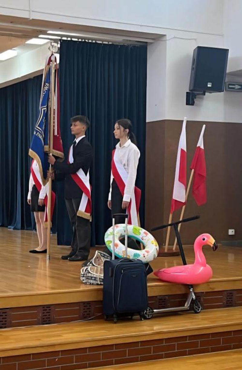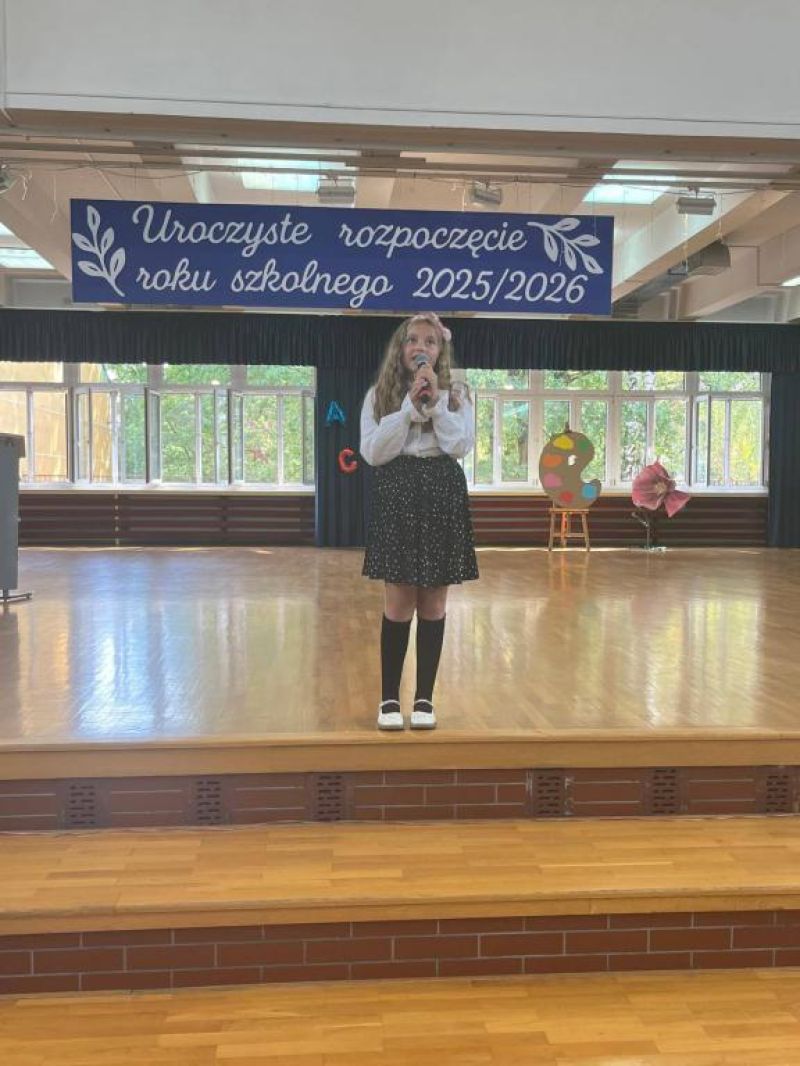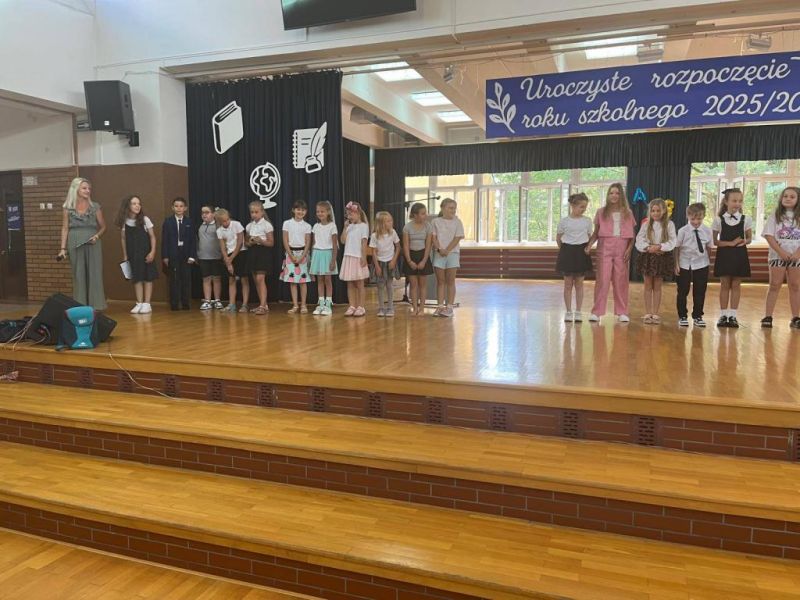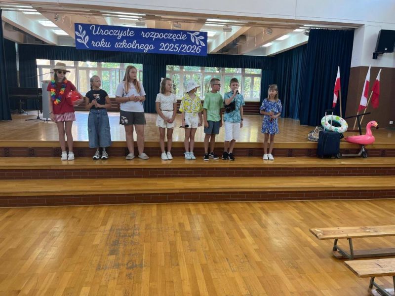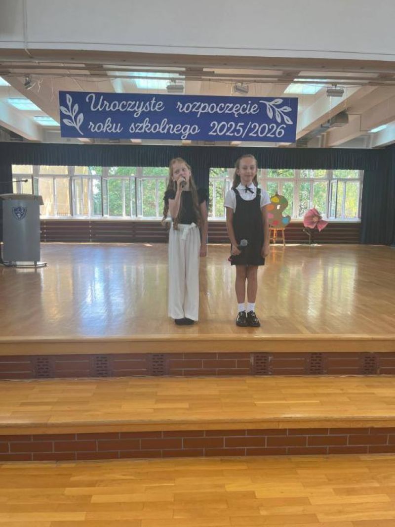 Poranne spotkanie uczniów klas starszych rozpoczęło się częścią artystyczną przygotowaną przez uczniów klas piątych. Rolę konferansjerów dzielne pełniły Anna Szulc i Natalia Kiełmińska z klasy 5C. Inscenizacja była pełna energii, radości i pozytywnego przekazu na nowy rok nauki. Niezwykle zaangażowane w przygotowanie tego wydarzenia były nauczycielki: Pani Monika Sobczyk, Pani Joanna Ciekalska oraz Pani Karolina Pawlik-Grajcar, które z pełnym profesjonalizmem i oddaniem zadbały o każdy szczegół występu. Podczas tej uroczystości uroczyście przywitano uczniów klas czwartych, którzy rozpoczęli nowy etap edukacji z nowymi wychowawcami: Panią Justyną Młotek (4a), Panią Małgorzatą Szpalą (4b) oraz Panem Michałem Bieniasem (4c).
