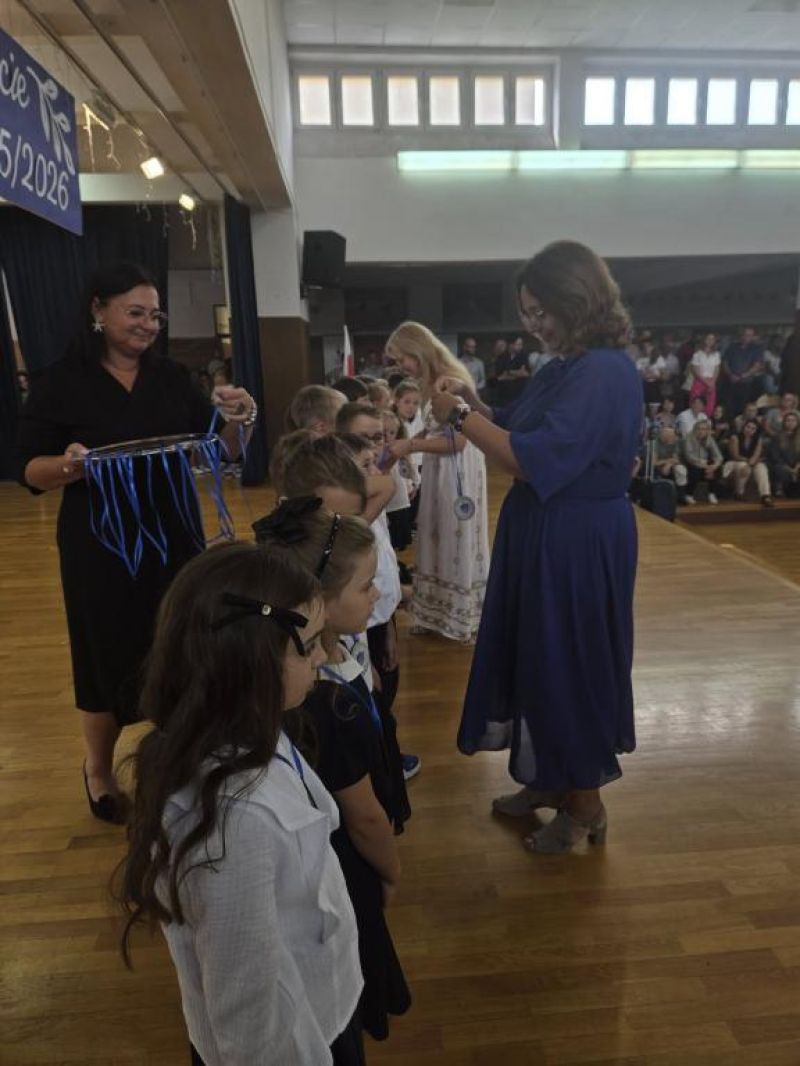 Następnie na scenę zostali zaproszeni uczniowie klas pierwszych, którzy po raz pierwszy oficjalnie rozpoczęli swoją edukacyjną przygodę w naszej szkole. Powitali ich wychowawcy: Pani Violetta Wińska (1a) oraz Pani Dorota Olearczyk (1b). Każde dziecko zostało przywitane uściskiem dłoni od Pani Dyrektor i Pań Wicedyrektor, a na pamiątkę tego dnia otrzymało pamiątkowy medal z wizerunkiem tarczy szkoły. Pamiątkowe zdjęcia każdej klasy wykonał Pan Michał Bienias.