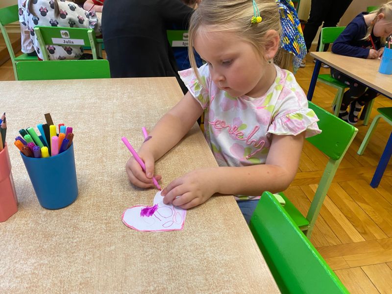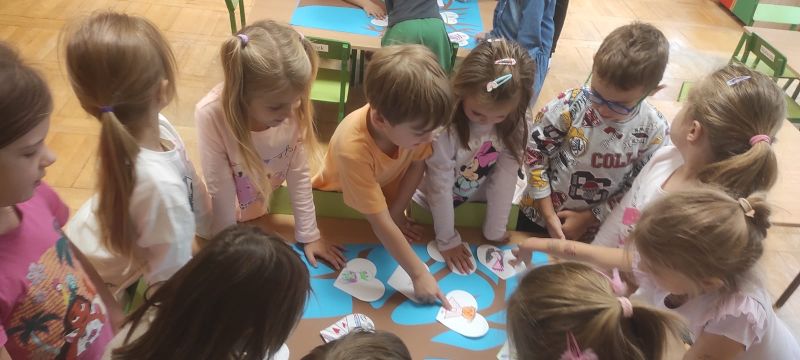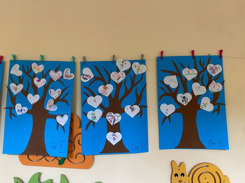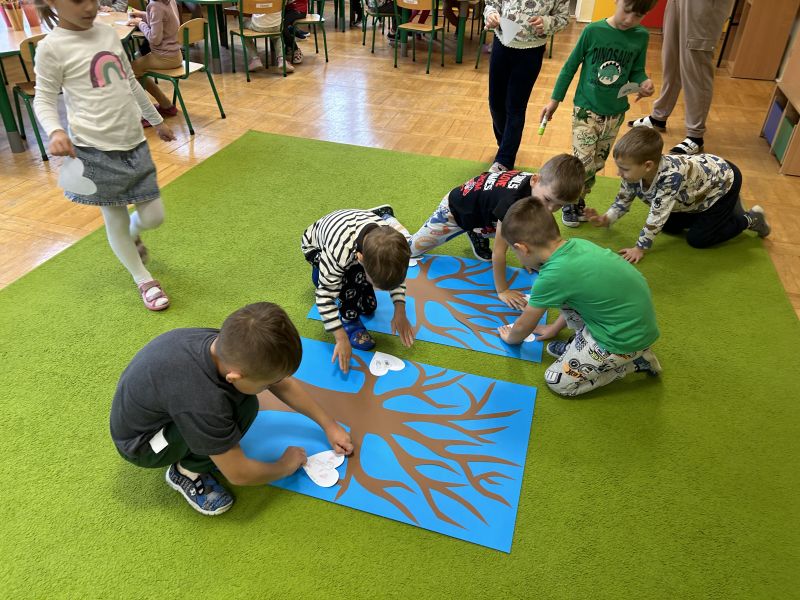 Na zakończenie, nawiązując do historii z bajki, w której Prosiaczek malował portrety swoich przyjaciół, każde dziecko wykonało na serduszku portret swojego przyjaciela. Prace zostały zawieszone na specjalnie przygotowanym Drzewku Przyjaźni, które powstało w każdej z grup. To symboliczne drzewko stało się pięknym świadectwem dziecięcej przyjaźni i dowodem na to, że dobre relacje buduje się każdego dnia – poprzez życzliwość, wsparcie i uśmiech.