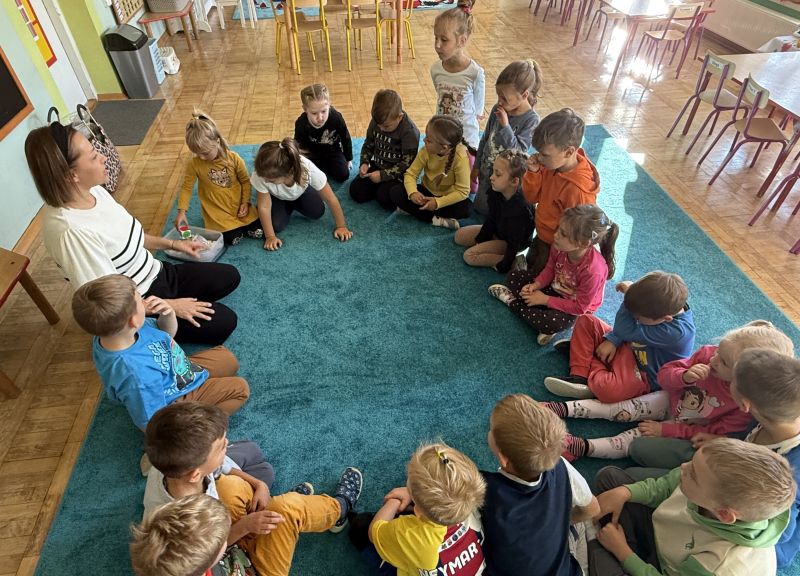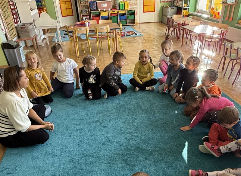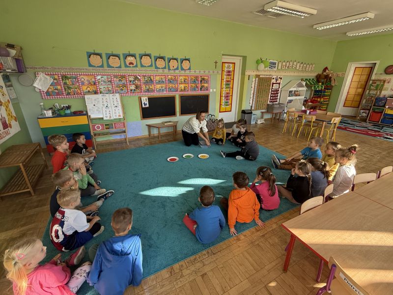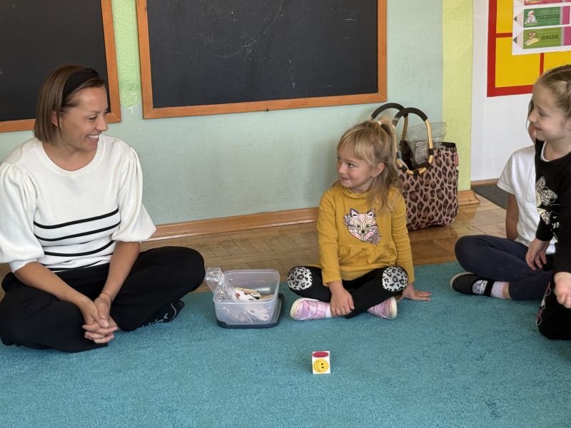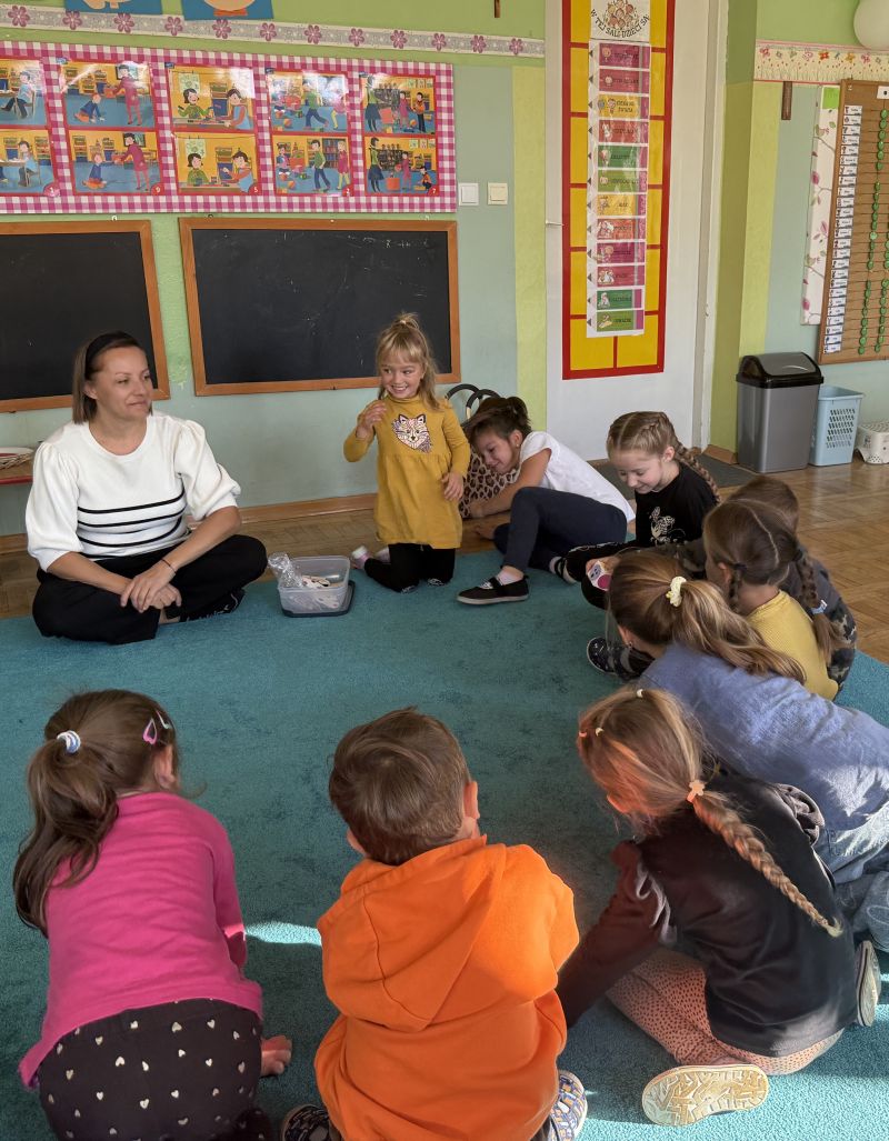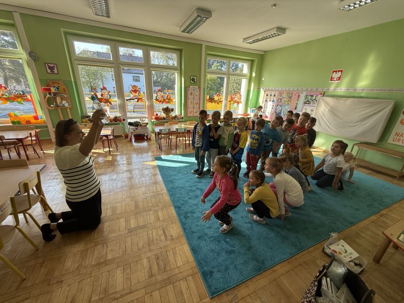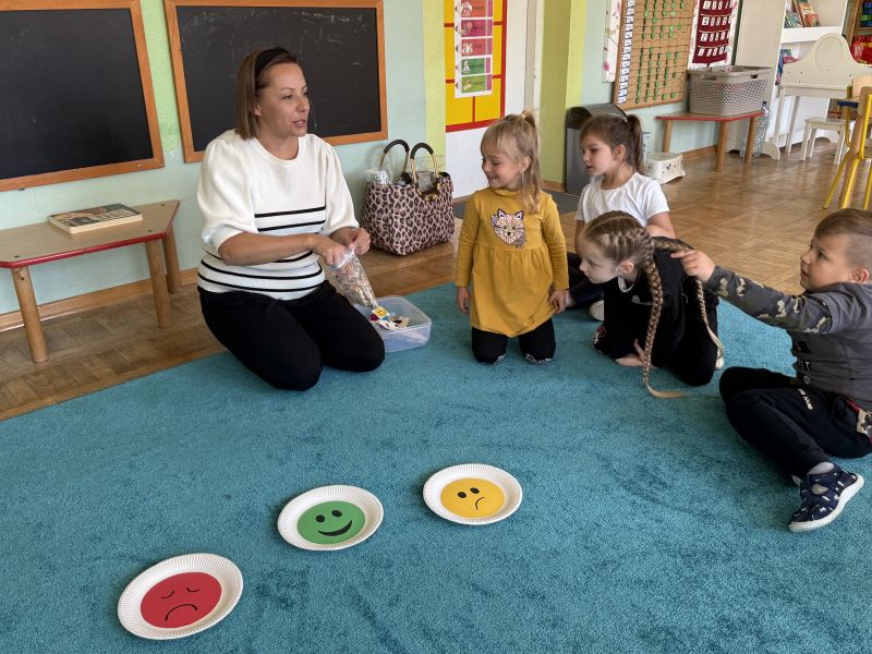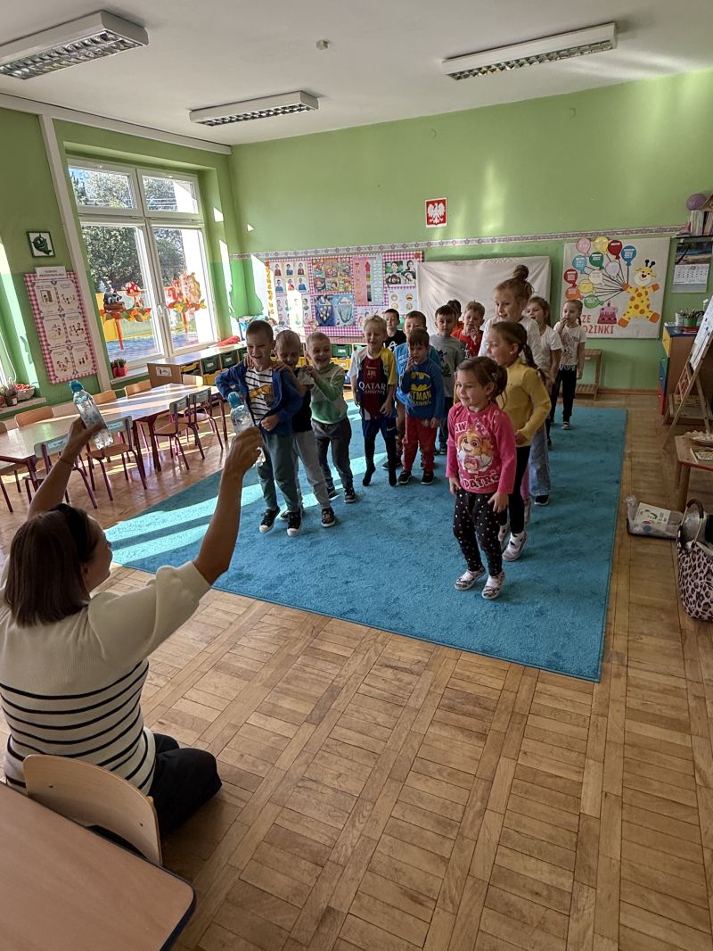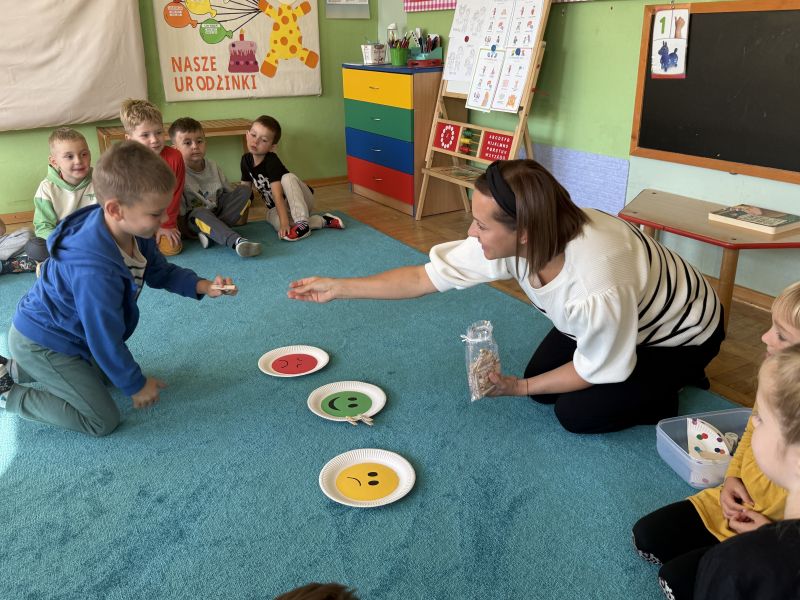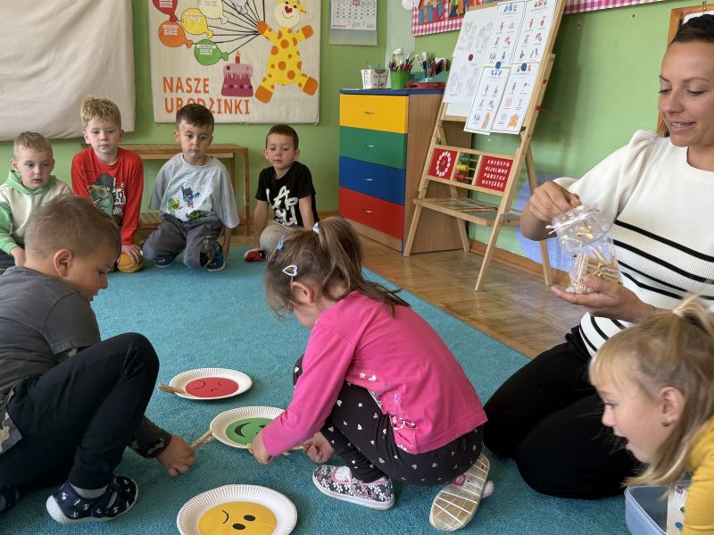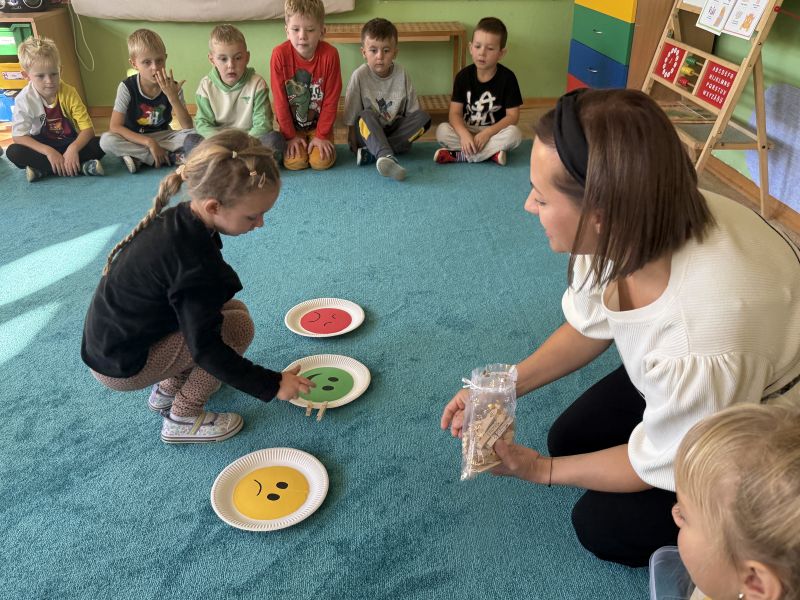 3 października w grupie starszej gościliśmy Panią Halinę Szubert, mamę Liwii, która przygotowała dla dzieci niezwykłe zajęcia. Był to czas pełen emocji, radości i kreatywnej zabawy. Na początku przedszkolaki wysłuchały książki „Feluś i Gucio poznają emocje”. Wraz z bohaterami bajki uczyły się rozpoznawać i nazywać uczucia, a także odkrywały, że wszystkie emocje są ważne i potrzebne. Dzieci dowiedziały się, skąd biorą się emocje, jak można je wyrażać i w jaki sposób radzić sobie z trudnymi uczuciami. Chwilę później każdy mógł zaznaczyć swój nastrój, przypinając klamerkę do odpowiedniej buźki. Sporo radości przyniosła zabawa z kostką emocji, podczas której dzieci nie tylko nazywały wylosowane emocje, ale też pokazywały je mimiką bądź ruchem. Kolejnym punktem spotkania była opowieść „Gucio się boi”. Historia o małym jednorożcu, którego tęczowa grzywa zmienia kolor zależnie od uczuć, pomogła dzieciom zrozumieć, że strach to naturalna emocja, z którą można sobie poradzić. Potem przyszedł czas na ruch. Zabawa z butelkami, polegająca na naśladowaniu ich kołyszących się ruchów, rozruszała wszystkich i wywołała wiele uśmiechów. Eksperyment sensoryczny z kredą i solą był kolejną atrakcją tego dnia. Dzieci pocierały kredę o sól, obserwując, jak zmienia się barwa kuchennej przyprawy. Barwioną sól przesypywały następnie do kubeczków, tworząc kolorowe tęcze. Ta aktywność nie tylko pobudziła ich ciekawość, ale też doskonale wspierała rozwój motoryki małej i dawała mnóstwo frajdy. Na zakończenie nagrodziliśmy naszego gościa wielkimi brawami i wykonaliśmy pamiątkowe zdjęcie. Były to wyjątkowe zajęcia, które na długo pozostaną nam w pamięci.