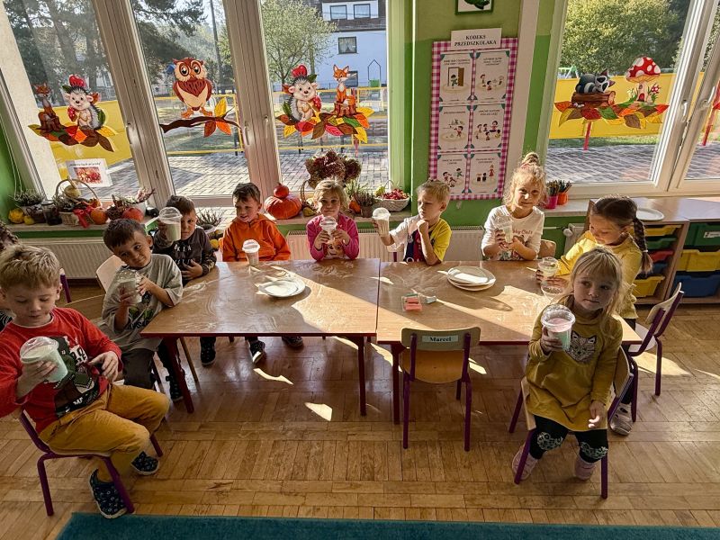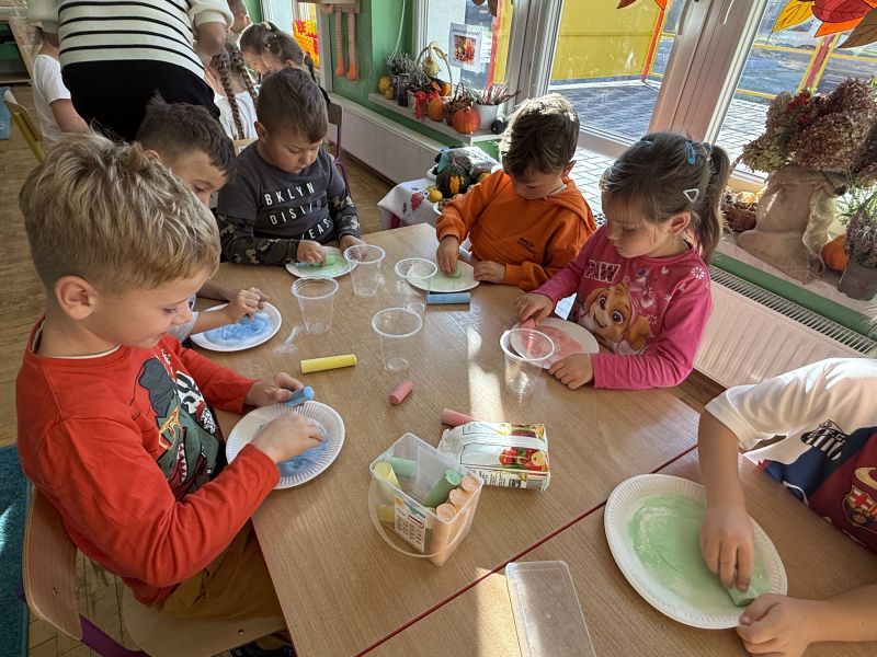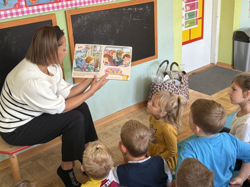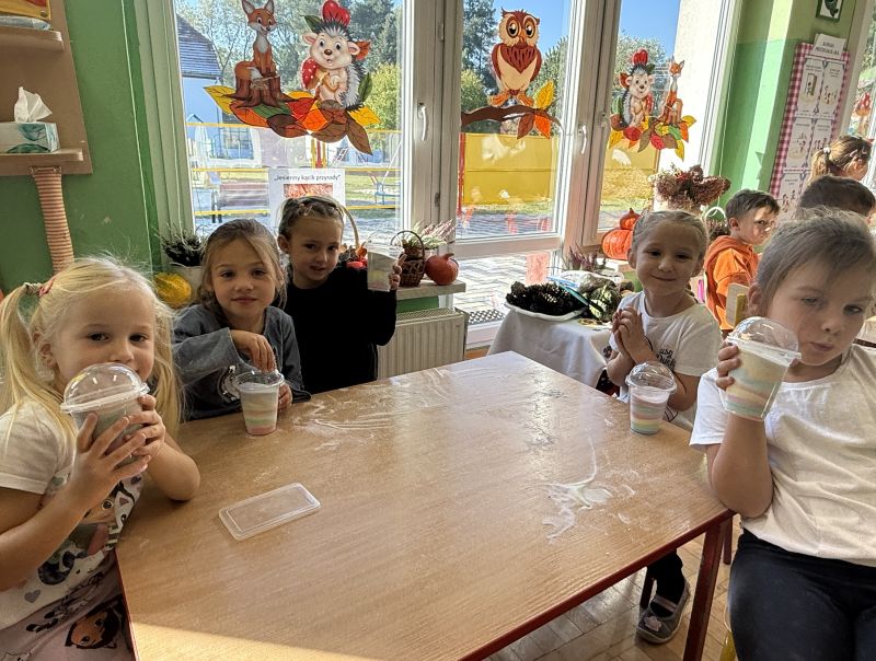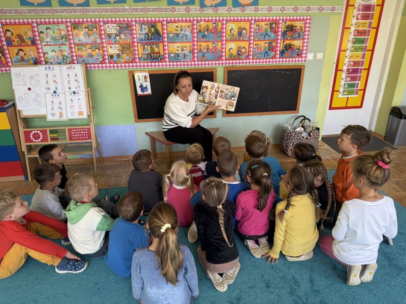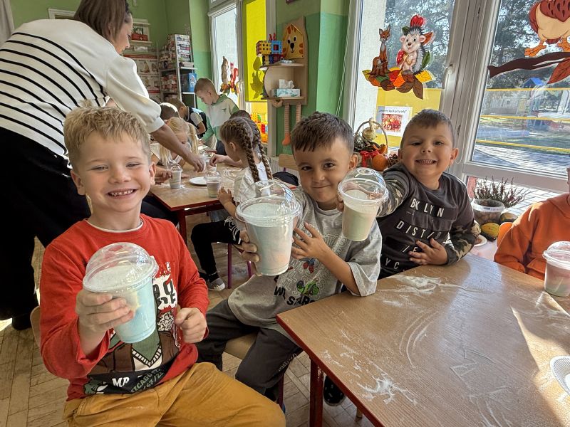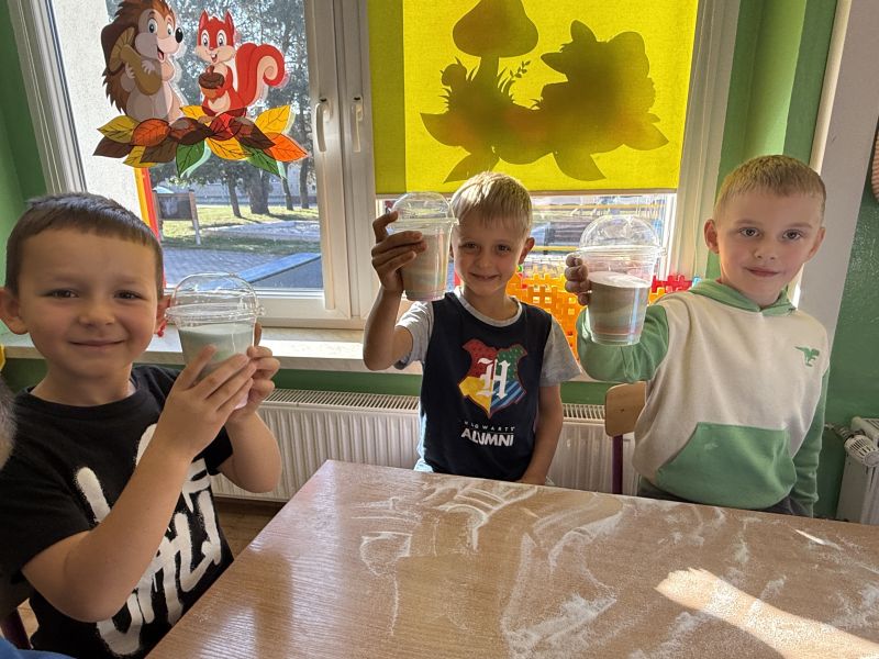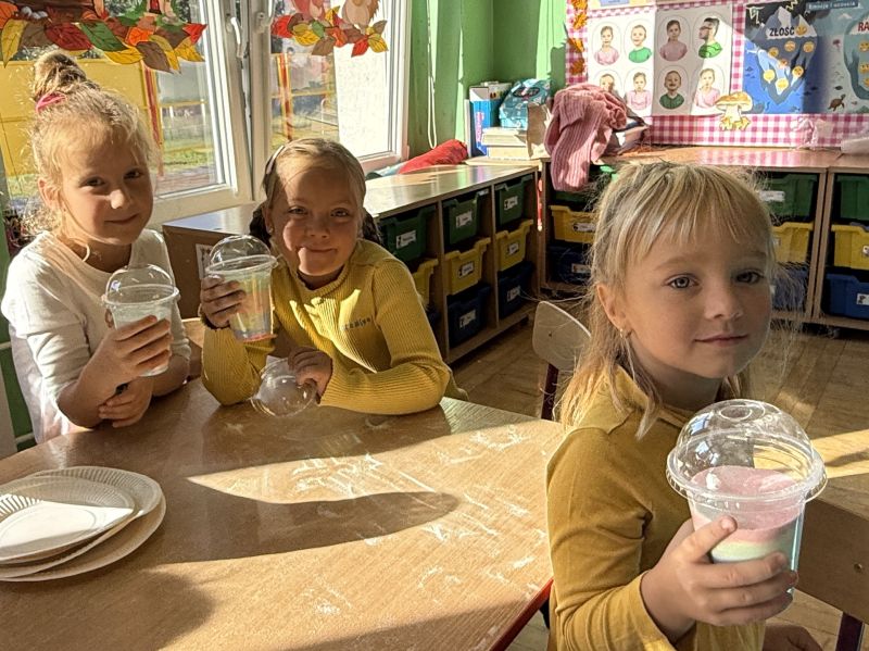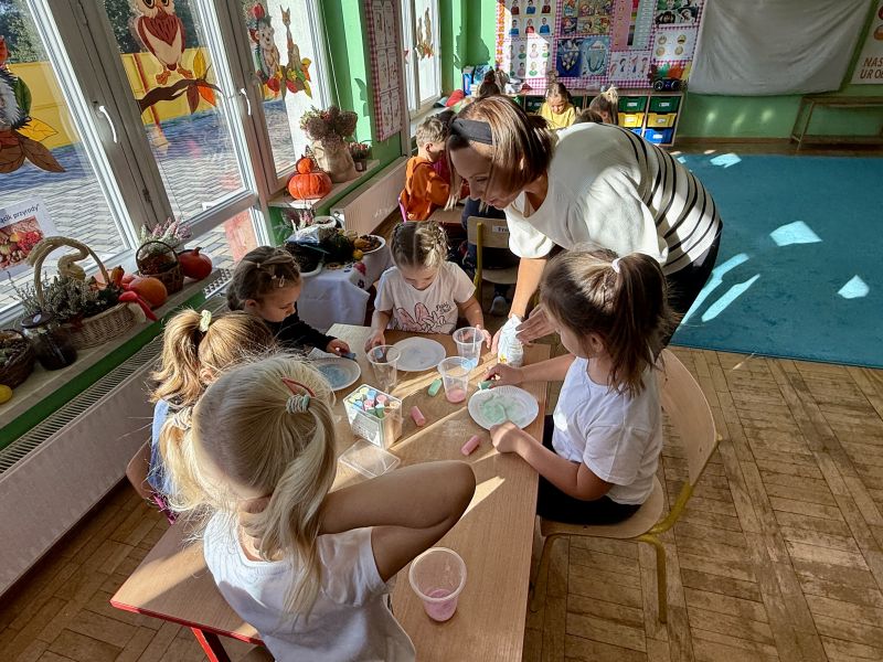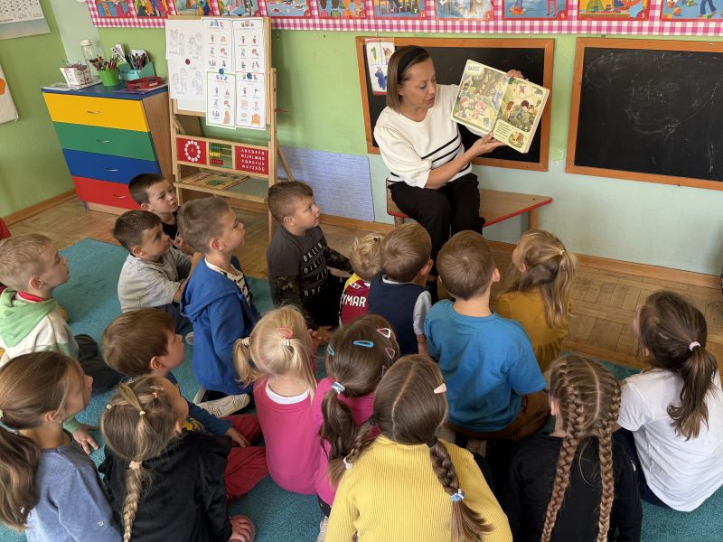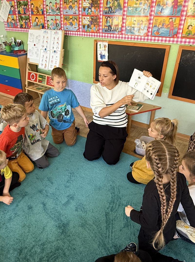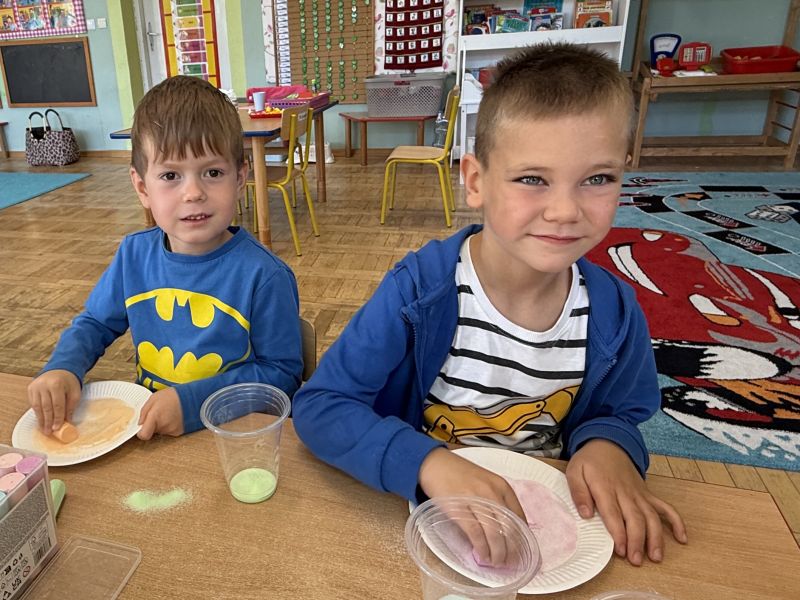 3 października w grupie starszej gościliśmy Panią Halinę Szubert, mamę Liwii, która przygotowała dla dzieci niezwykłe zajęcia. Był to czas pełen emocji, radości i kreatywnej zabawy. Na początku przedszkolaki wysłuchały książki „Feluś i Gucio poznają emocje”. Wraz z bohaterami bajki uczyły się rozpoznawać i nazywać uczucia, a także odkrywały, że wszystkie emocje są ważne i potrzebne. Dzieci dowiedziały się, skąd biorą się emocje, jak można je wyrażać i w jaki sposób radzić sobie z trudnymi uczuciami. Chwilę później każdy mógł zaznaczyć swój nastrój, przypinając klamerkę do odpowiedniej buźki. Sporo radości przyniosła zabawa z kostką emocji, podczas której dzieci nie tylko nazywały wylosowane emocje, ale też pokazywały je mimiką bądź ruchem. Kolejnym punktem spotkania była opowieść „Gucio się boi”. Historia o małym jednorożcu, którego tęczowa grzywa zmienia kolor zależnie od uczuć, pomogła dzieciom zrozumieć, że strach to naturalna emocja, z którą można sobie poradzić. Potem przyszedł czas na ruch. Zabawa z butelkami, polegająca na naśladowaniu ich kołyszących się ruchów, rozruszała wszystkich i wywołała wiele uśmiechów. Eksperyment sensoryczny z kredą i solą był kolejną atrakcją tego dnia. Dzieci pocierały kredę o sól, obserwując, jak zmienia się barwa kuchennej przyprawy. Barwioną sól przesypywały następnie do kubeczków, tworząc kolorowe tęcze. Ta aktywność nie tylko pobudziła ich ciekawość, ale też doskonale wspierała rozwój motoryki małej i dawała mnóstwo frajdy. Na zakończenie nagrodziliśmy naszego gościa wielkimi brawami i wykonaliśmy pamiątkowe zdjęcie. Były to wyjątkowe zajęcia, które na długo pozostaną nam w pamięci.