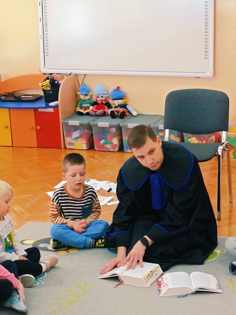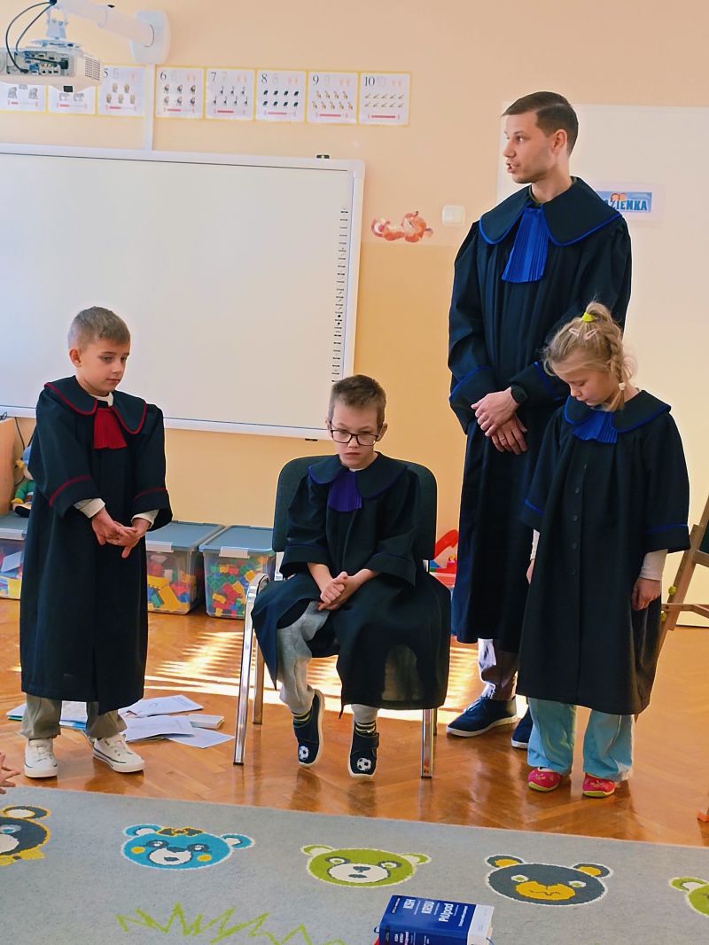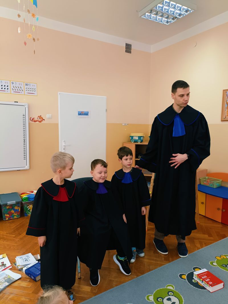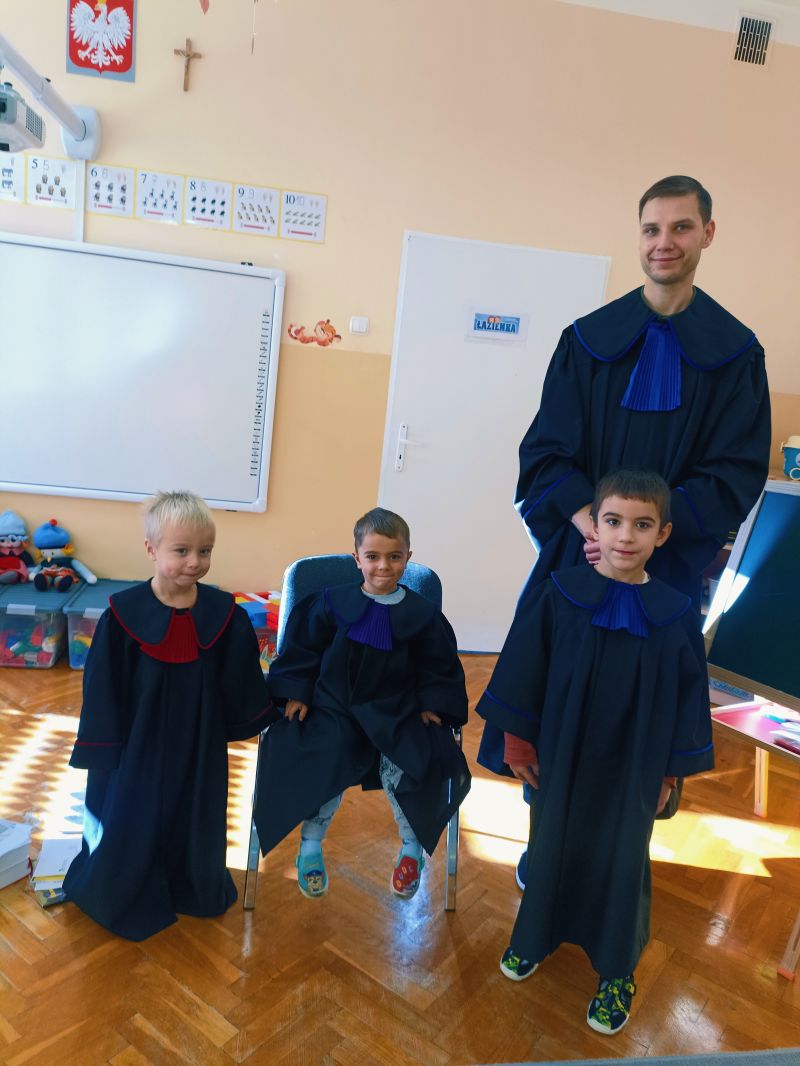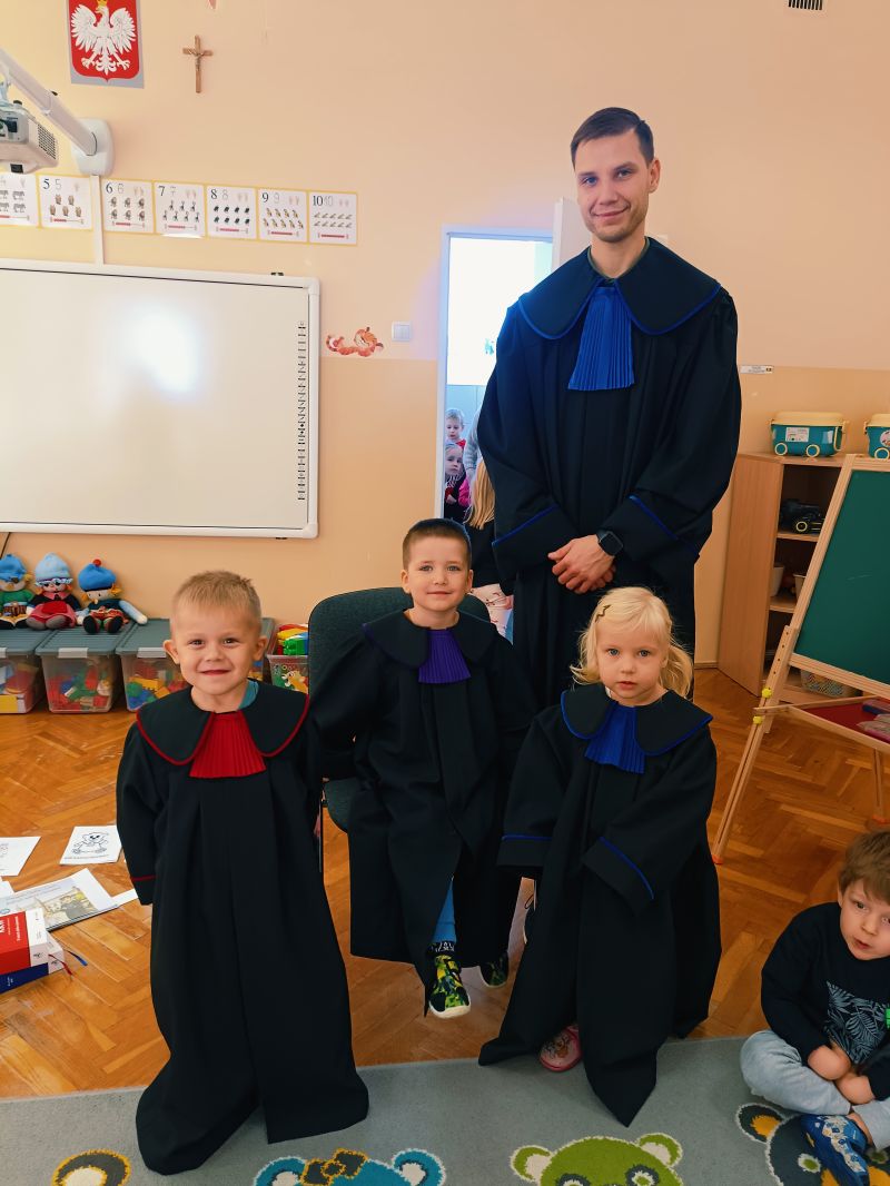 Dnia 4 listopada 2025r. Przedszkole Publiczne Nr 1 w Ozimku odwiedził tato Kajetana , pan Damian Dulnik. Podczas zajęć ,dla każdej grupy naszego przedszkola przybliżył dzieciom zakres pracy radców prawnych. Sala zamieniła się w sądową wokandę. Pokazał swój urzędowy strój – toga i żabot. Nauczył dzieci rozpoznawać skład sędziowski. Przedszkolaki z zainteresowaniem przyglądały się togom i chętnie je przymierzały. Tata Kajetana pokazał dzieciom książeczki, które w atrakcyjny sposób prezentują pracę radcy prawnego. Przedszkolaki mogły dowiedzieć się do czego potrzebne są w życiu regulacje i przepisy, jakie dzieci mają obowiązki i prawa oraz jak mogą ich dochodzić. Wszystko dzięki ogólnopolskiemu projektowi z zakresu edukacji prawnej Krajowej Izby Radców Prawnych, który objął swoim zasięgiem przedszkola publiczne w całej Polsce. Na zakończenie nasz gość przygotował dzieciom drobne upominki, które sprawiły im wiele radości. Dzieci wręczyły podziękowania panu Damianowi za ciekawe i pouczające spotkanie, pełne radości i inspiracji.
