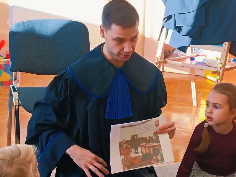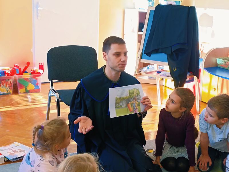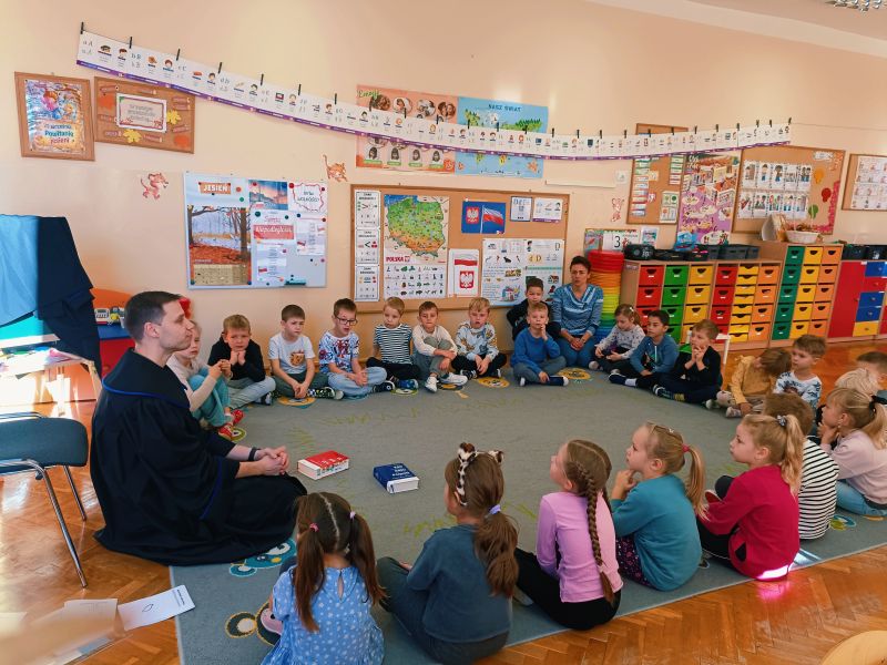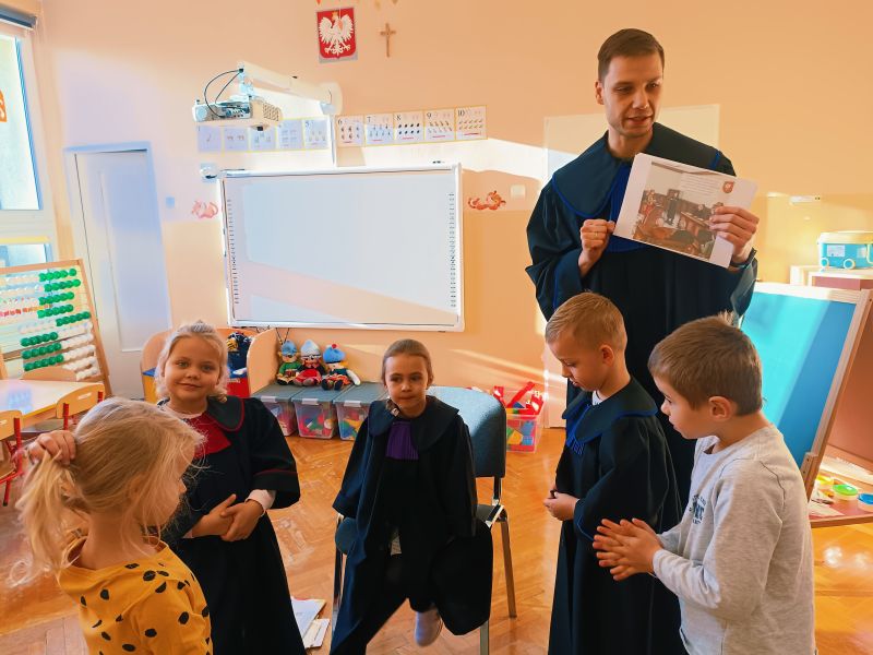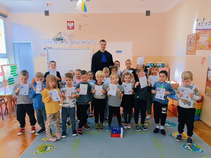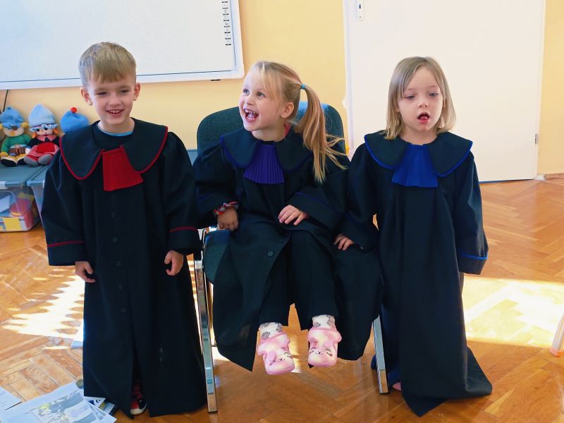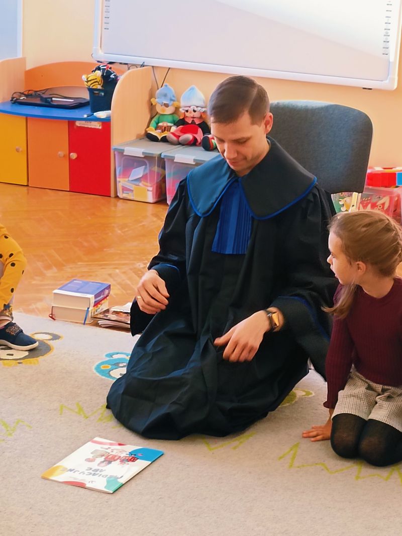 Dnia 4 listopada 2025r. Przedszkole Publiczne Nr 1 w Ozimku odwiedził tato Kajetana , pan Damian Dulnik. Podczas zajęć ,dla każdej grupy naszego przedszkola przybliżył dzieciom zakres pracy radców prawnych. Sala zamieniła się w sądową wokandę. Pokazał swój urzędowy strój – toga i żabot. Nauczył dzieci rozpoznawać skład sędziowski. Przedszkolaki z zainteresowaniem przyglądały się togom i chętnie je przymierzały. Tata Kajetana pokazał dzieciom książeczki, które w atrakcyjny sposób prezentują pracę radcy prawnego. Przedszkolaki mogły dowiedzieć się do czego potrzebne są w życiu regulacje i przepisy, jakie dzieci mają obowiązki i prawa oraz jak mogą ich dochodzić. Wszystko dzięki ogólnopolskiemu projektowi z zakresu edukacji prawnej Krajowej Izby Radców Prawnych, który objął swoim zasięgiem przedszkola publiczne w całej Polsce. Na zakończenie nasz gość przygotował dzieciom drobne upominki, które sprawiły im wiele radości. Dzieci wręczyły podziękowania panu Damianowi za ciekawe i pouczające spotkanie, pełne radości i inspiracji.
