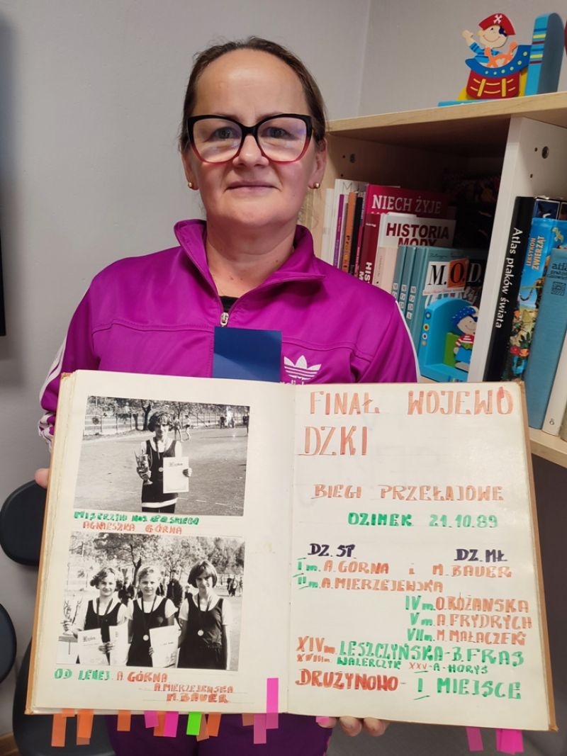 Prawdziwą niespodzianką wystawy była stara, szkolna "Kronika Sportowa" z lat 1984( i późniejszych). Tu uczniowie odnaleźli wpisy o  naszej utalentowanej nauczycielce, Pani Agnieszce Kaczmarek, i podziwiali jej szkolne sukcesy w sporcie, kiedy to wielokrotnie reprezentowała JEDYNKĘ, zdobywała złote medale i puchary.