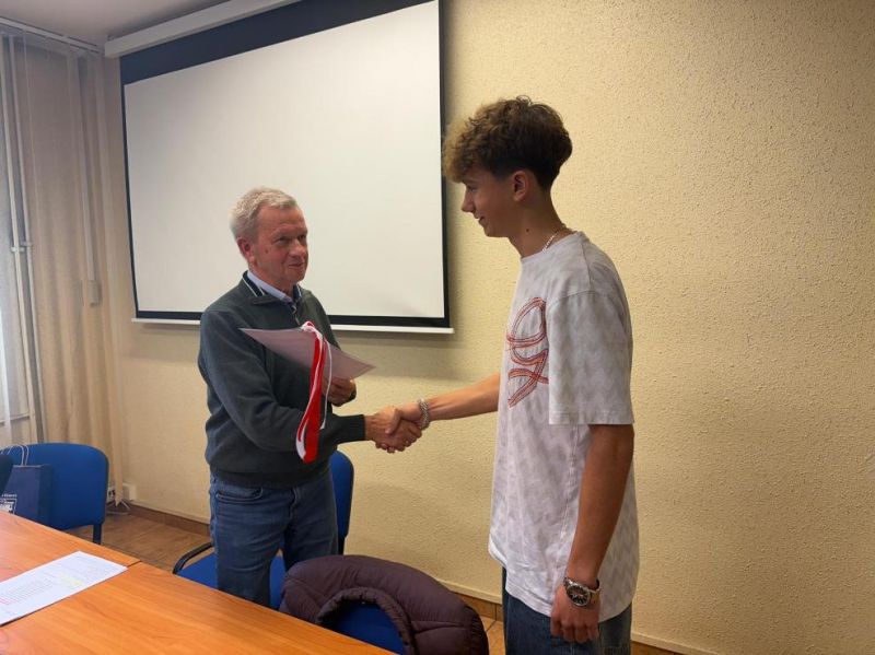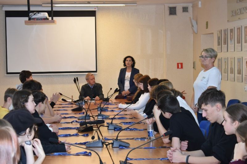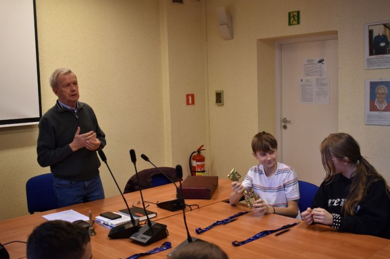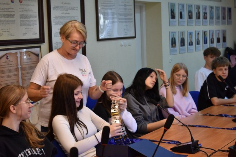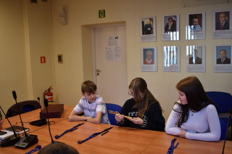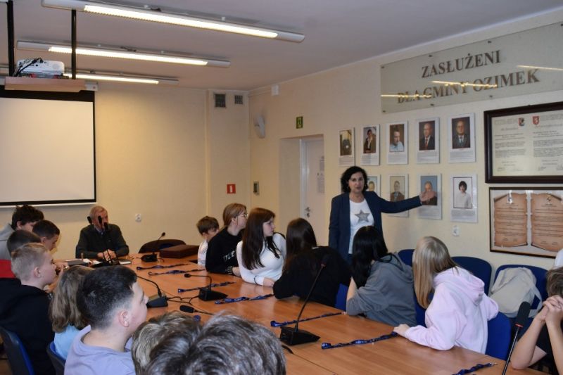 Kolejnym etapem naszej podróży była sala, gdzie odbywają się posiedzenia komisji i sesje Rady Miejskiej w Ozimku. Tu specjalnie na spotkanie z nami przyszedł Przewodniczący Rady Miejskiej w Ozimku Pan Zygmunt Olbryt. Pan Olbryt omówił zadania jakie stoją przed radą miejską, opowiedział jak działają komisje w naszej gminie, jak przebiega podział władzy na uchwałodawczą i wykonawczą. Wszystko  to poparte szeroką wiedzą i bogatym, kilkudziesięcioletnim doświadczeniem. Pan Przewodniczący Olbryt zadawał naszym ósmoklasistom pytania, które  przede wszystkim   miały ich pobudzić do przemyśleń.  Uczniowie mogli zobaczyć  (i przymierzyć ) łańcuch przewodniczącego rady, a także symboliczny "Klucz do Bram Ozimka".
