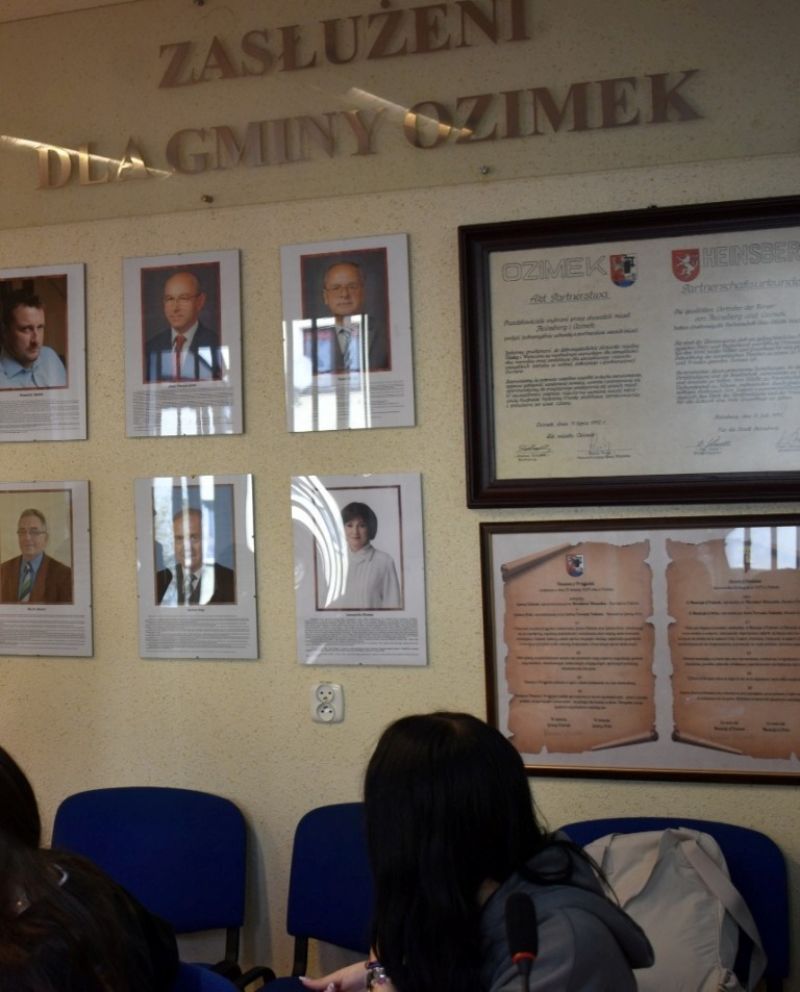 W sali narad znajdują się Akty Partnerstwa i Akty o Przyjaźni Ozimka z zaprzyjaźnionymi miastami w Europie, a także galeria sylwetek Honorowych Obywateli Ozimka oraz Zasłużonych dla Ozimka. Tu szczególne miejsce zajmuje Pani Leonarda Płoszaj, obecnie wieloletni Wicestarosta Opolski. Pani Płoszaj jest nam szczególnie bliska, gdyż jest absolwentką naszej JEDYNKI  i wzorem do naśladowania. Jest też znaną postacią w naszej szkole: z realizacji projektów z Czechami, różnorodnych działań i wizyt w JEDYNCE, do której z sentymentem wraca.