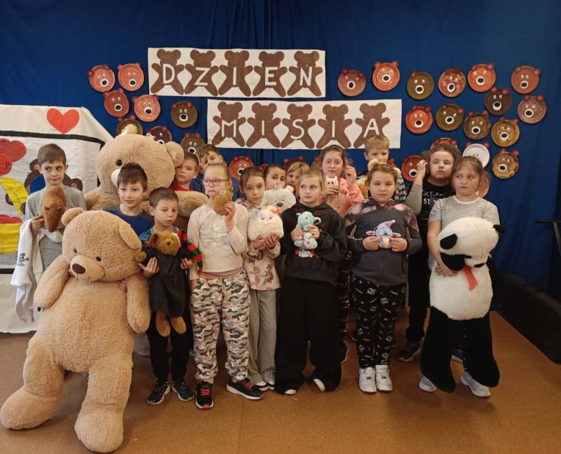 25 listopada w naszej szkole świętowaliśmy Dzień Pluszowego Misia! Cała szkoła wypełniła się puchatymi przyjaciółmi – od malutkich misiów po ogromne pluszaki! Uczniowie mieli okazję uczestniczyć w wielu zabawach i konkursach, które rozwijały wyobraźnię i kreatywność. Tworzyli własne misie z papierowych talerzyków, malując je i ozdabiając według własnego pomysłu. Rozwiązywali misiowe zagadki i łamigłówki, co wywołało mnóstwo radości i śmiechu. Śpiewali piosenki o misiach, ucząc się nowych rymowanek i melodii. Największą atrakcją okazały się tradycyjne zawody w „jedzeniu” miodu bez użycia rąk. Dzieci rywalizowały z wielkim zaangażowaniem, a publiczność nie mogła powstrzymać śmiechu, obserwując tę słodką rywalizację!