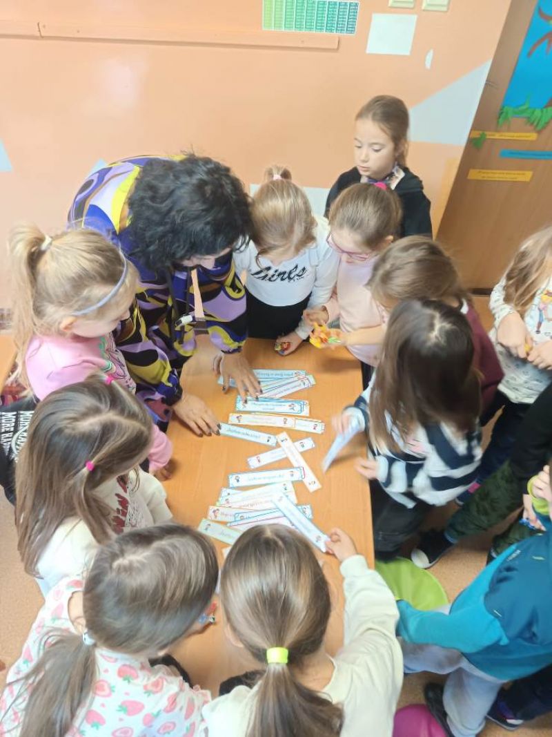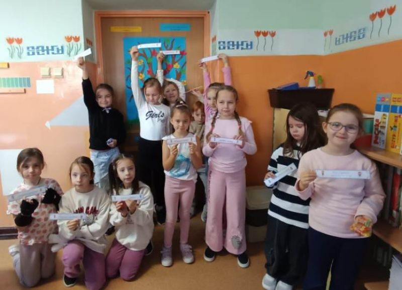 Książka okazała się tak ciekawa i zaskakująca, że aż zaczęliśmy podejrzewać, że supermoce naprawdę mieszkają w naszej klasie! Po przeczytaniu pani Grażyna koniecznie chciała poznać nasze supermoce… i wiecie co? Okazało się, że mamy ich CAŁĄ MASĘ! Każdy bohater, który zdradził swoją moc, dostał słodki upominek – bo wiadomo, energię trzeba uzupełniać! Na koniec otrzymaliśmy zakładki do książek, które już wkrótce wykorzystamy z pełną mocą czytelniczą!