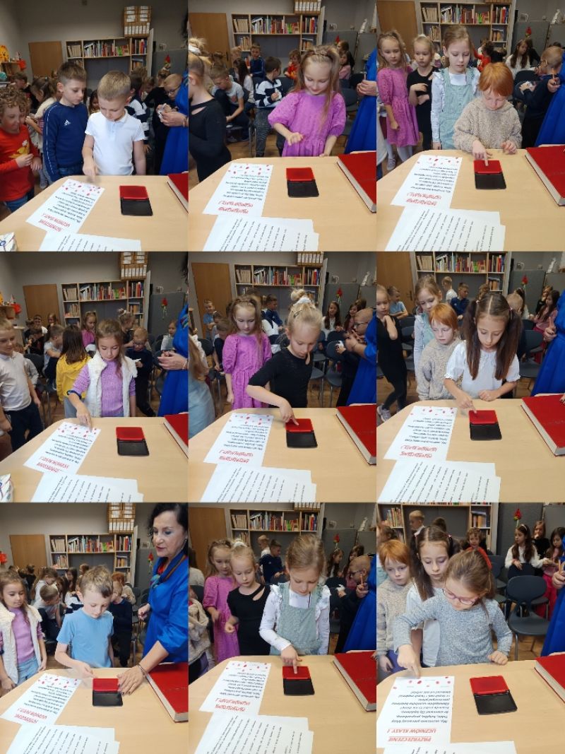 A żeby wszystko było naprawdę „na serio”, złożyli odcisk kciuka oraz zostawili miejsce na podpisy pani bibliotekarki i wychowawcy.