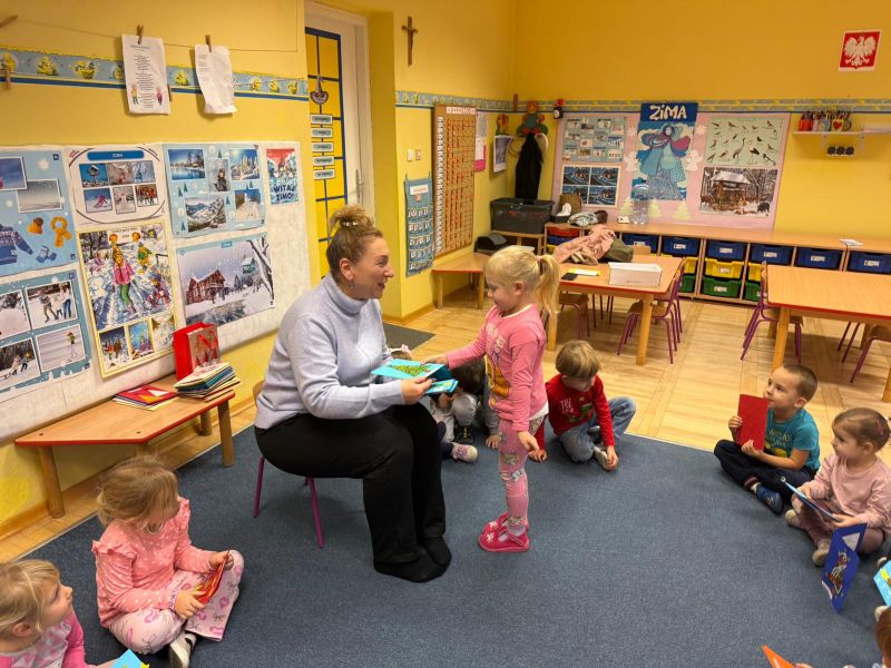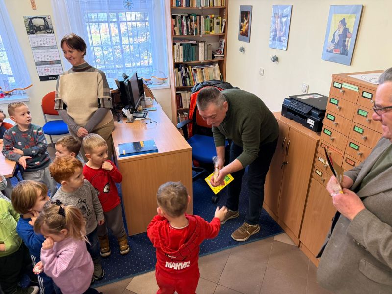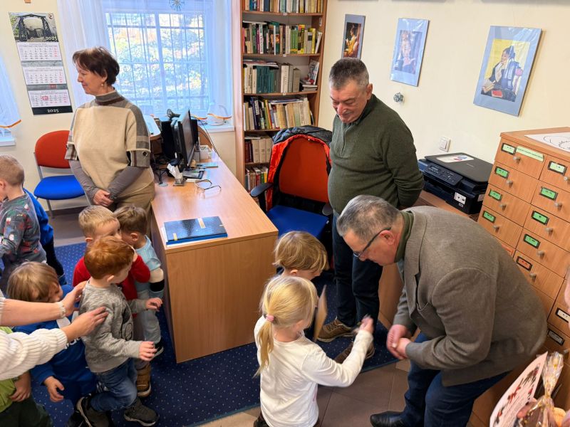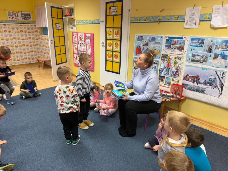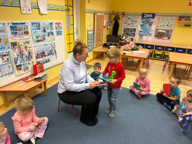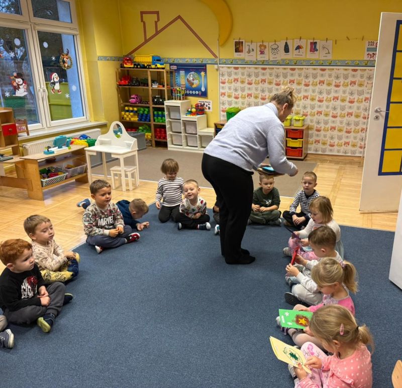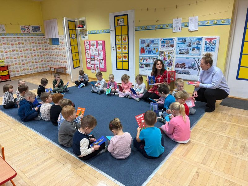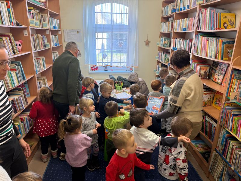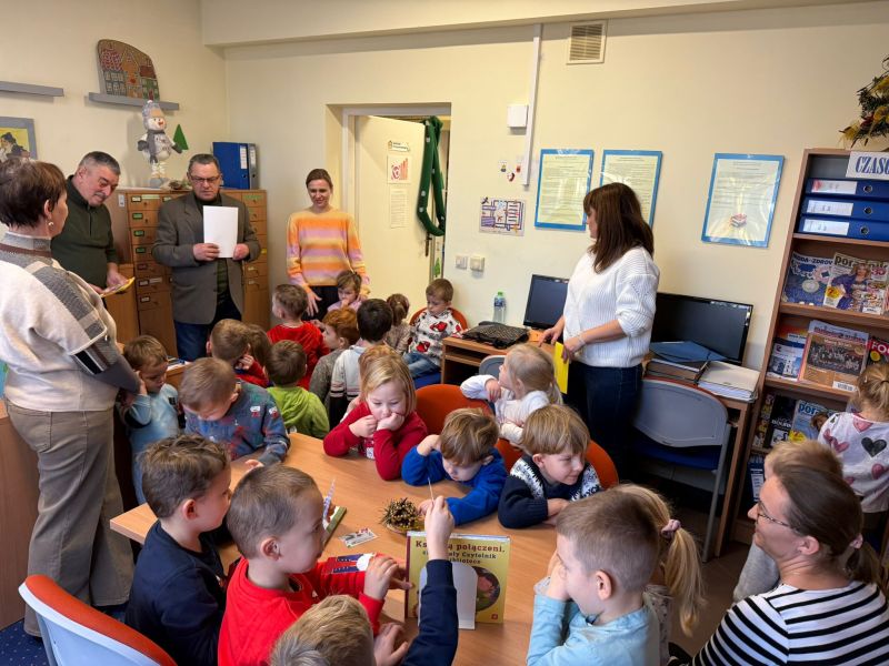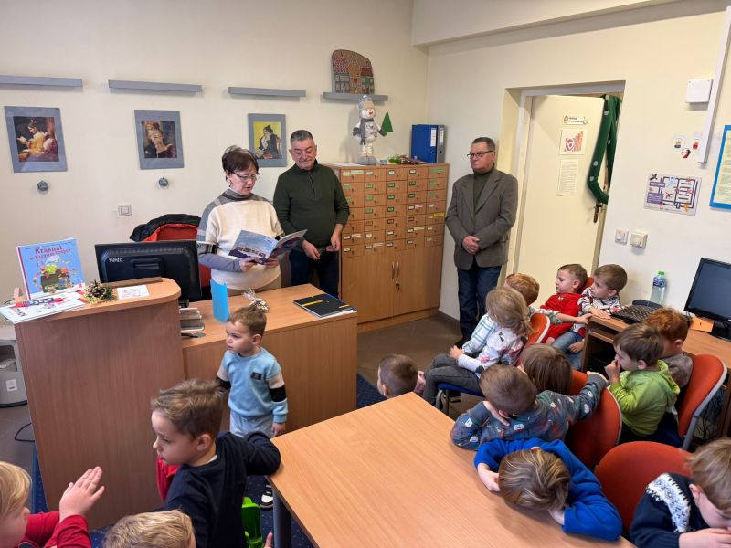 W pierwszych tygodniach grudnia, przedszkolaki z Piąteczki wzięły udział w wyjątkowej akcji wymiany kartek świątecznych w ramach "Innowacji pedagogicznej - Weihnachtskartenaustausch" autorstwa Dominiki Gerlich. Celem przedsięwzięcia było rozwijanie wrażliwosci oraz budowanie relacji z lokalną społecznością i dziećmi z innego przedszkola. Przedszkolaki z wielkim zaangażowaniem przygotowywały kartki świąteczne, wkładając w nie dużo serca i radości. W ramach tej akcji 11 grudnia do naszego przedszkola przyjechała pani Ewa Wąsowicz z Zespołu Szkolono - Przedszkolnego w Grodźcu, w celu wymienienia się z naszymi dziećmi kartkami i życzeniami bożonarodzeniowymi. Sprawiło to naszym wychowankom wiele radości i było dla nich cennym doświadczeniem, uczącym życzliwości i radości płynącej z obdarowywania innych. W piątek 12 grudnia przedszkolanki odwiedziły bibliotekę w Krasiejowie. Spotkanie miało wyjątkowy charakter, ponieważ połączyło w sobie miłość do książek, świąteczną tradycję oraz piękny gest pamięci o osobach zaangażowanych w życie lokalnej społeczności. Na to spotkanie zaproszono sołtysa wsi pana Tadeusza Markulaka, przedstawiciela DFK Krasiejów pana Piotra Szubert oraz bibliotekarkę panią Aldonę Kuśmierską. Dzieci wręczyły im własnoręcznie wykonane kartki świąteczne składając jednocześnie serdeczne życzenia bożonarodzeniowe. Szczególnym momentem spotkania było czytanie opowiadania światecznego przez Pana Piotra i Panią Aldonę. Wszyscy z zainteresowaniem słuchali histroii, która wprowadziła w magiczną atmosferę zbliżających się świąt Bożego Narodzenia. Spotkanie było miłym i wzruszającym momentem, a uśmiechy na twarzach obdarowanych były najlepszym dowodem na to, jak ważne są takie gesty. Podczas wizyty w bibliotece przedszkolaki miały okazję obejrzeć bogate zbiory w bibliotece w Krasiejowie.