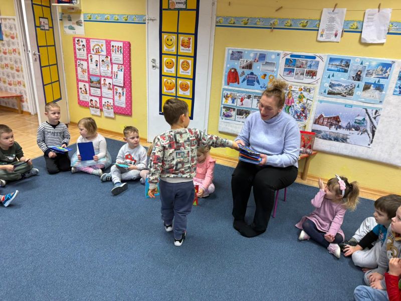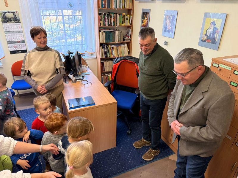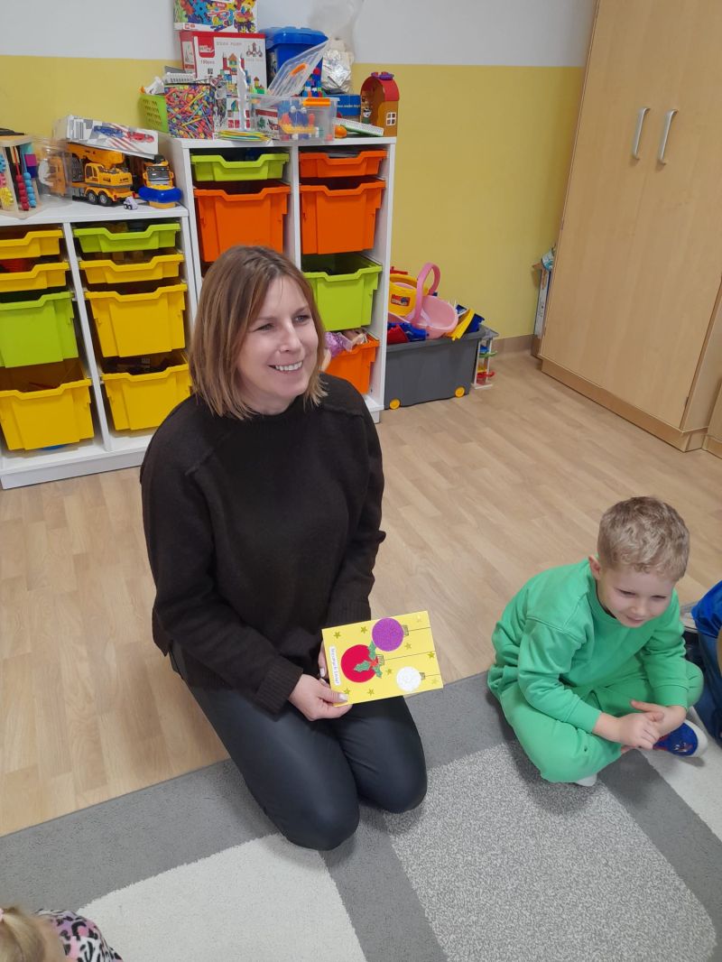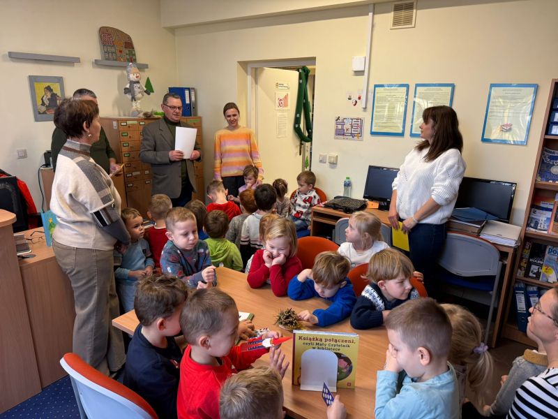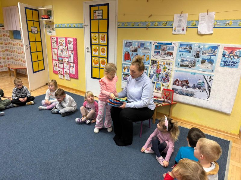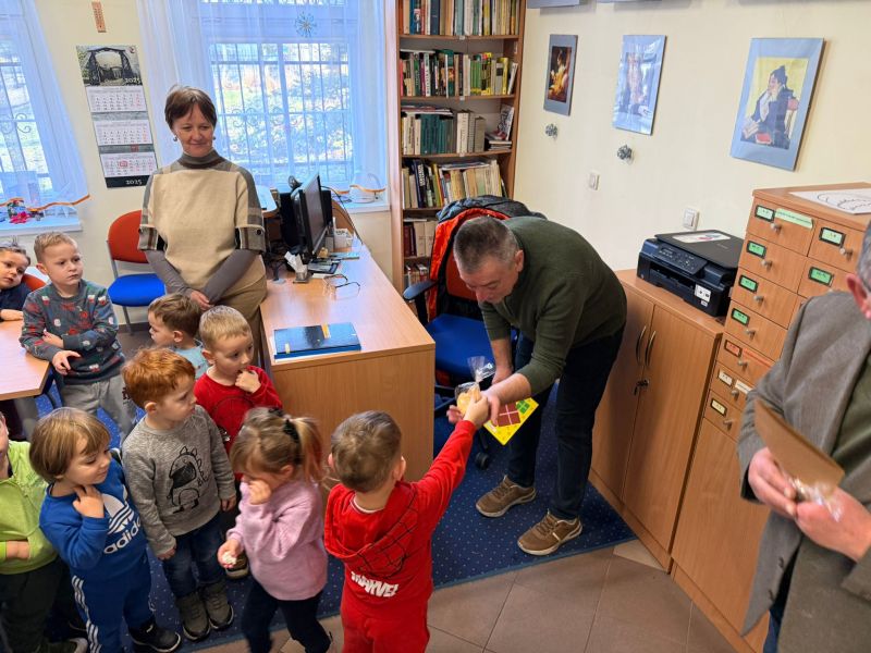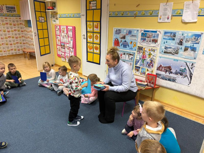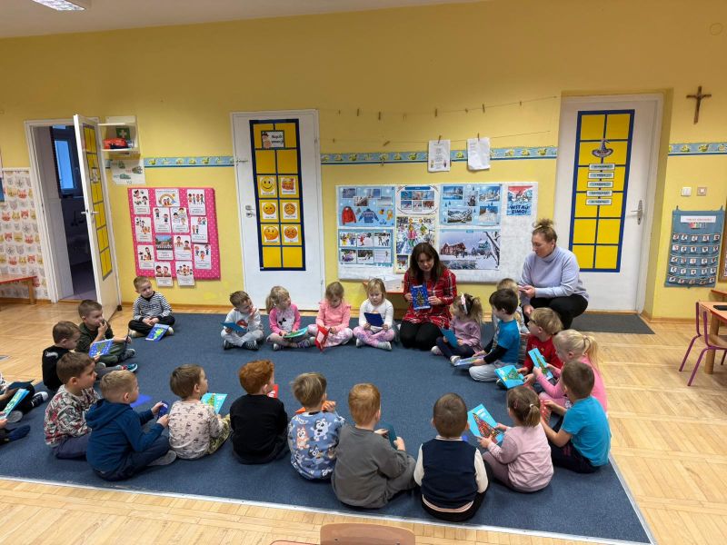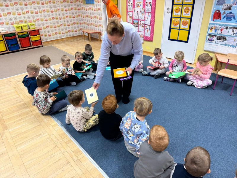 W pierwszych tygodniach grudnia, przedszkolaki z Piąteczki wzięły udział w wyjątkowej akcji wymiany kartek świątecznych w ramach "Innowacji pedagogicznej - Weihnachtskartenaustausch" autorstwa Dominiki Gerlich. Celem przedsięwzięcia było rozwijanie wrażliwosci oraz budowanie relacji z lokalną społecznością i dziećmi z innego przedszkola. Przedszkolaki z wielkim zaangażowaniem przygotowywały kartki świąteczne, wkładając w nie dużo serca i radości. W ramach tej akcji 11 grudnia do naszego przedszkola przyjechała pani Ewa Wąsowicz z Zespołu Szkolono - Przedszkolnego w Grodźcu, w celu wymienienia się z naszymi dziećmi kartkami i życzeniami bożonarodzeniowymi. Sprawiło to naszym wychowankom wiele radości i było dla nich cennym doświadczeniem, uczącym życzliwości i radości płynącej z obdarowywania innych. W piątek 12 grudnia przedszkolanki odwiedziły bibliotekę w Krasiejowie. Spotkanie miało wyjątkowy charakter, ponieważ połączyło w sobie miłość do książek, świąteczną tradycję oraz piękny gest pamięci o osobach zaangażowanych w życie lokalnej społeczności. Na to spotkanie zaproszono sołtysa wsi pana Tadeusza Markulaka, przedstawiciela DFK Krasiejów pana Piotra Szubert oraz bibliotekarkę panią Aldonę Kuśmierską. Dzieci wręczyły im własnoręcznie wykonane kartki świąteczne składając jednocześnie serdeczne życzenia bożonarodzeniowe. Szczególnym momentem spotkania było czytanie opowiadania światecznego przez Pana Piotra i Panią Aldonę. Wszyscy z zainteresowaniem słuchali histroii, która wprowadziła w magiczną atmosferę zbliżających się świąt Bożego Narodzenia. Spotkanie było miłym i wzruszającym momentem, a uśmiechy na twarzach obdarowanych były najlepszym dowodem na to, jak ważne są takie gesty. Podczas wizyty w bibliotece przedszkolaki miały okazję obejrzeć bogate zbiory w bibliotece w Krasiejowie.