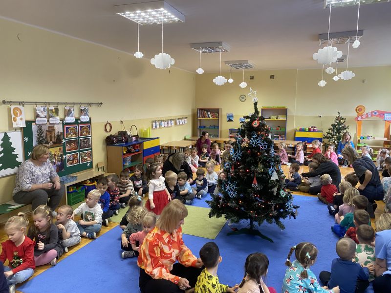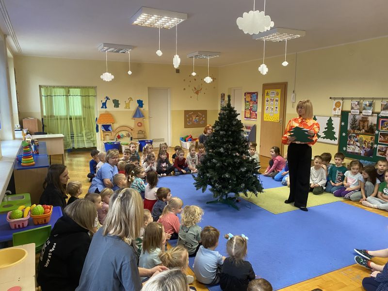 Nasza uroczystość rozpoczęła się wspólnym spotkaniem w sali maluszków. Tam Pani Dyrektor odczytała dzieciom wyjątkowy „List od choinki”, który wzbudził wiele radości i zainteresowania. Po tej miłej niespodziance każda grupa kolejno podchodziła do choinki, aby zawiesić przygotowane wcześniej ozdoby.