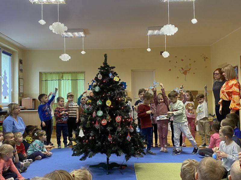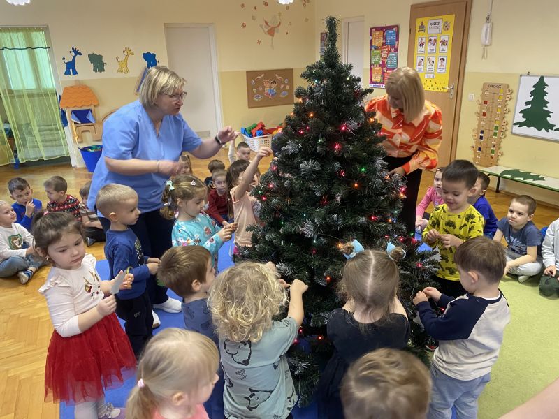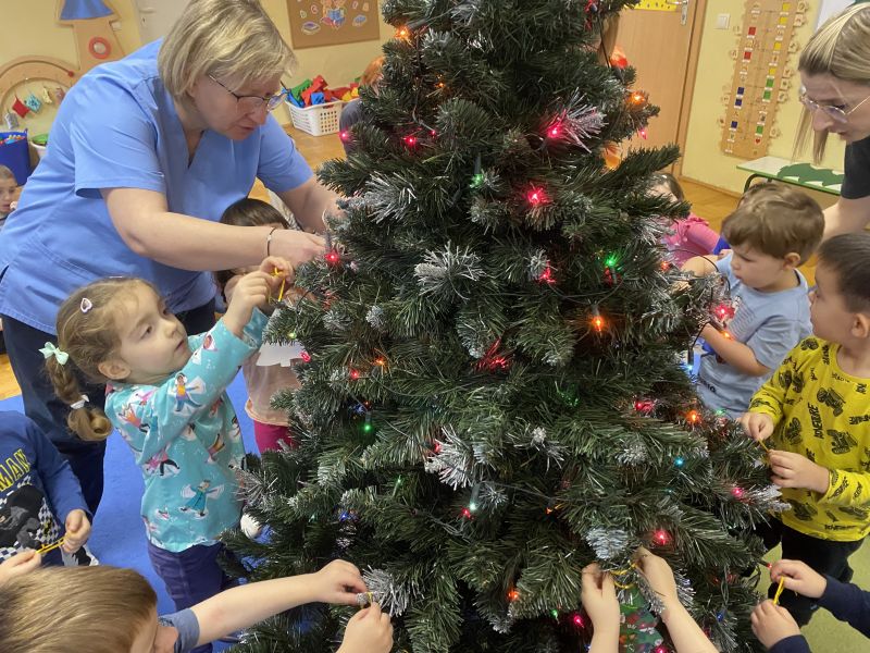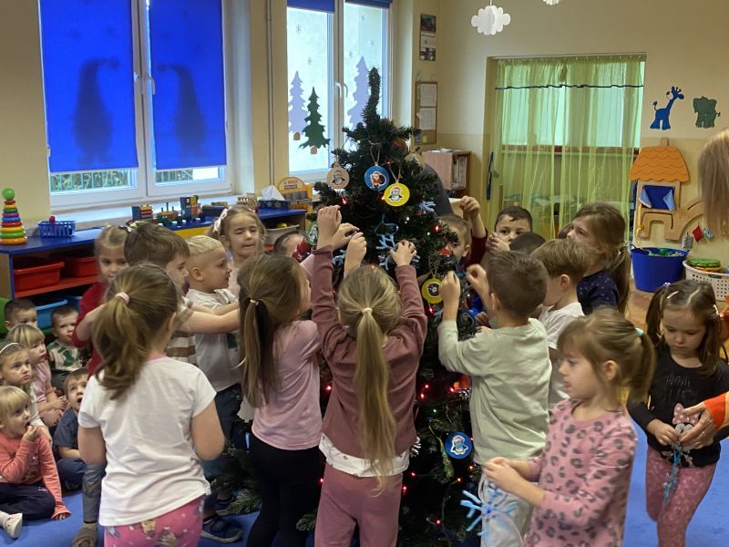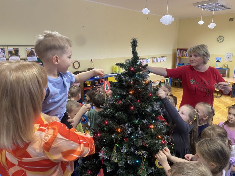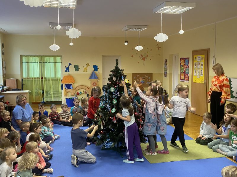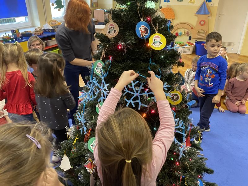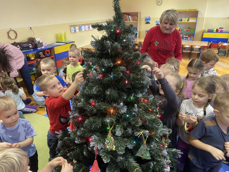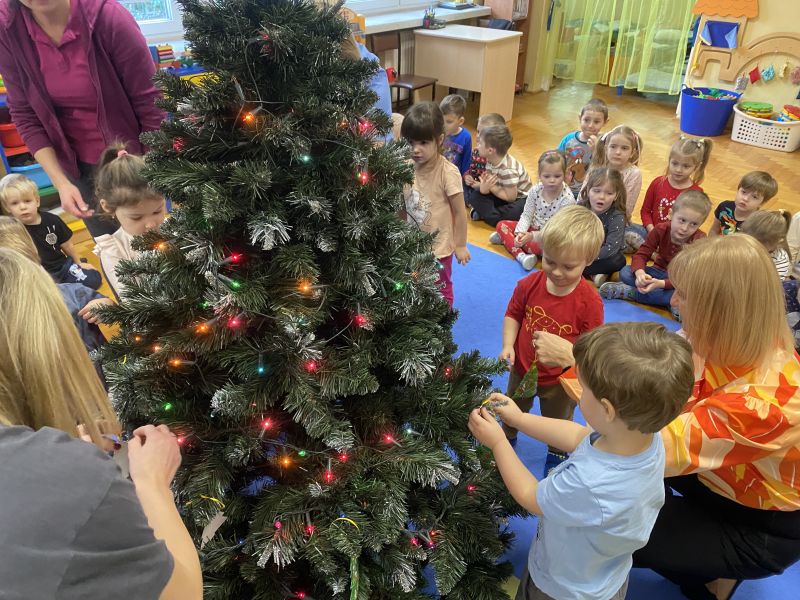 Naszą tradycją jest to, że każda grupa przedszkolna wraz ze swoim wychowawcą przygotowuje własnoręcznie ozdoby choinkowe. Dzieci wkładają w ich wykonanie wiele serca, kreatywności i zaangażowania. Następnie wszystkie ozdoby zawieszane są na choince, która dumnie stoi w holu przedszkola i cieszy oczy dzieci, rodziców oraz pracowników.