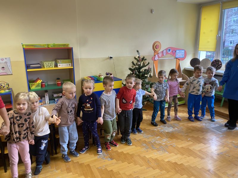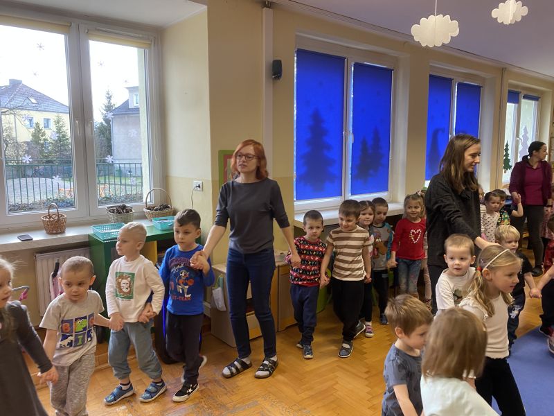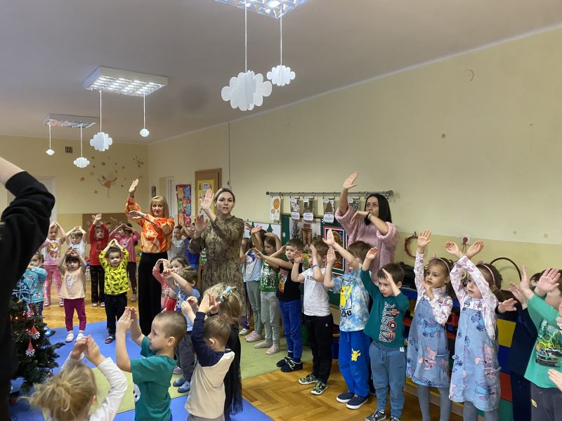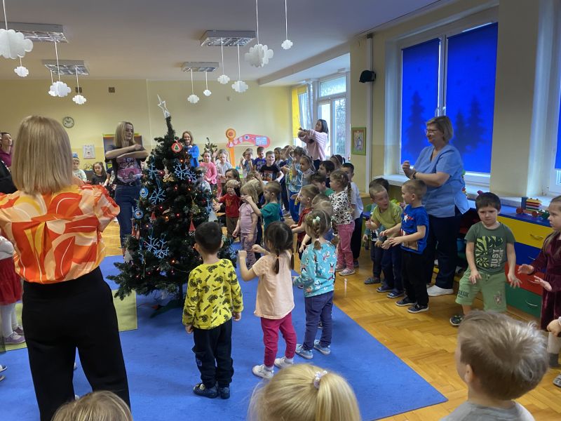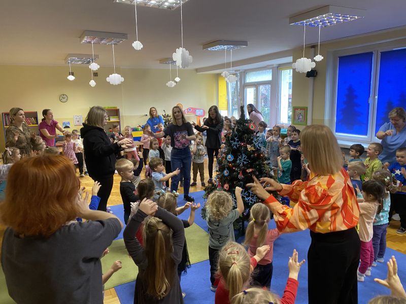 Po udekorowaniu choinki przyszedł czas na wspólną zabawę. Dzieci tańczyły, bawiły się przy choince oraz uczestniczyły w radosnym „choinkowym masażyku”, który sprawił wszystkim wiele uśmiechu i dobrej energii.