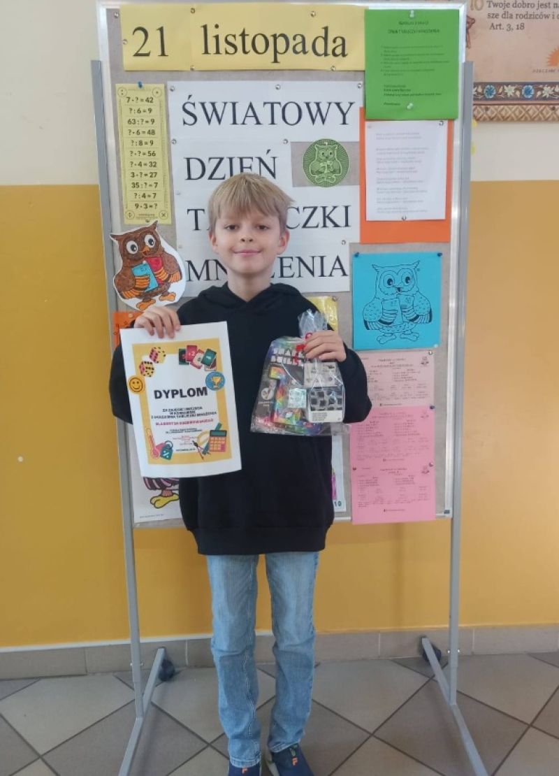 Świętowaliśmy też Światowy Dzień Tabliczki Mnożenia. Uczniowie przygotowując się do obchodów powtarzali tabliczkę mnożenia, a mogli to zrobić korzystając ze specjalnych zakładek lub informacji i wskazówek zawartych na gazetce ściennej. Sprawdzanie znajomości tabliczki mnożenia było też powiązane z zabawą. Uczniowie grali w gry planszowe, układali puzzle, rozwiązywali krzyżówki,  rebusy i inne łamigłowki związane z tabliczką mnożenia. Uczniowie zachęceni zostali,  by sprawdzić czy tabliczkę mnożenia znają ich rodzice i starsze rodzeństwo. Dodatkowo chętni ze starszych klas wzięli udział w szkolnym konkursie, a zwycięzcą został Borys z 4 klasy. Nauka przez zabawę to dobry pomysł na utrwalenie wiedzy i wspólne spędzenie czasu.